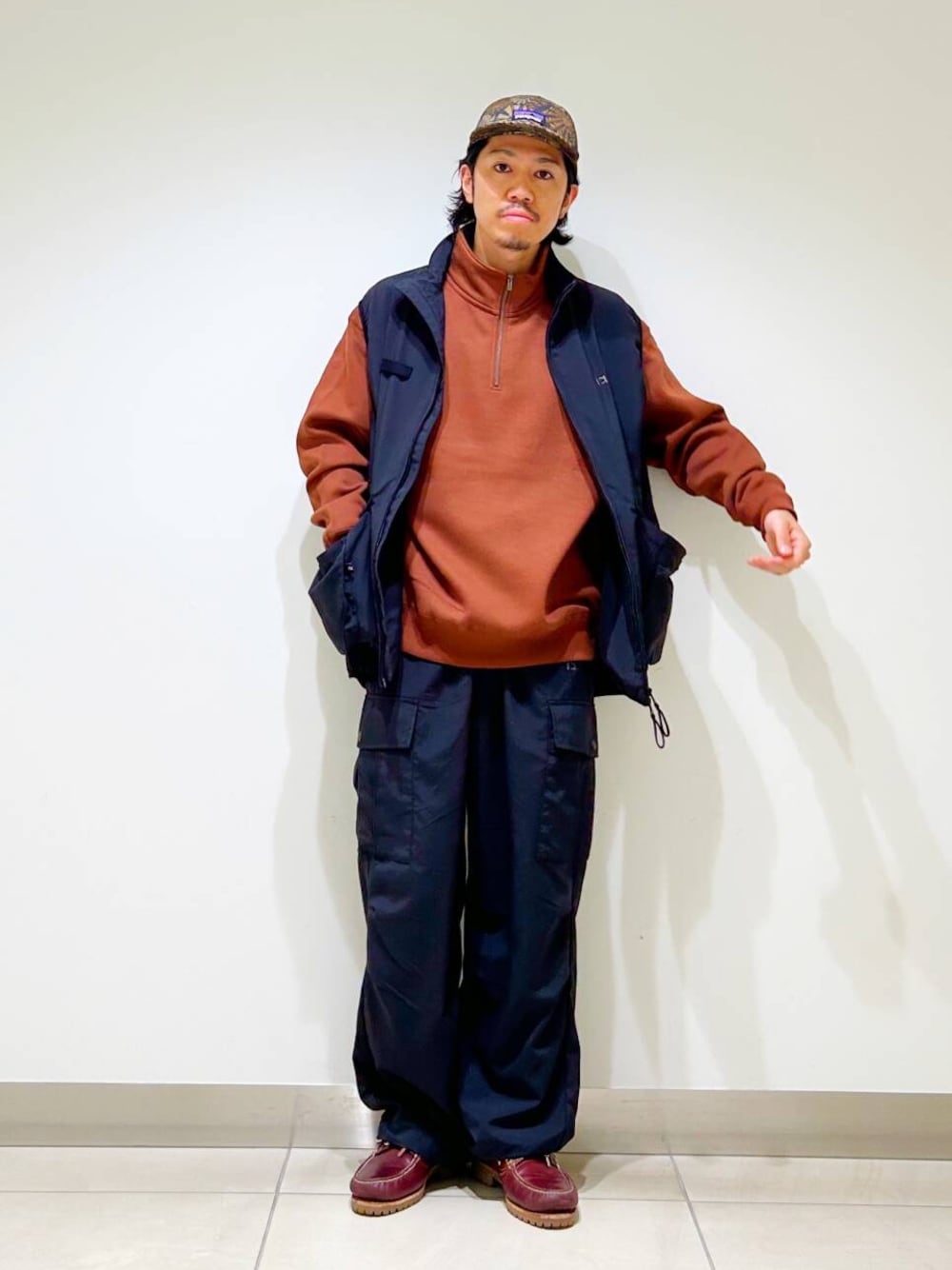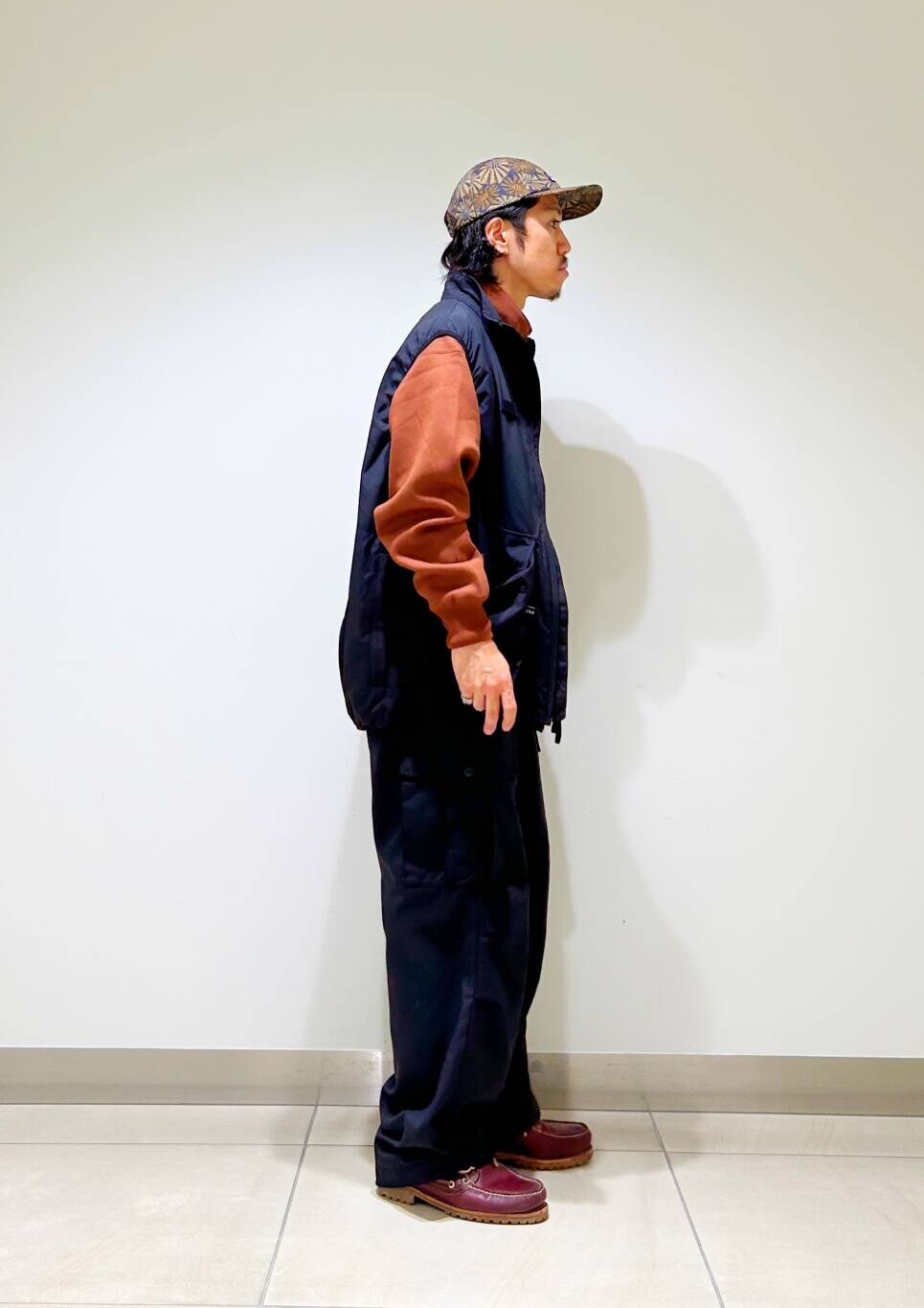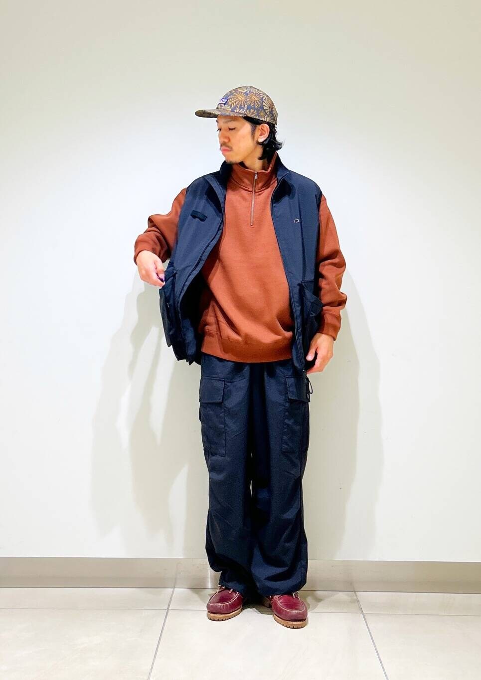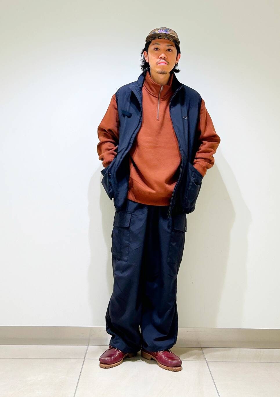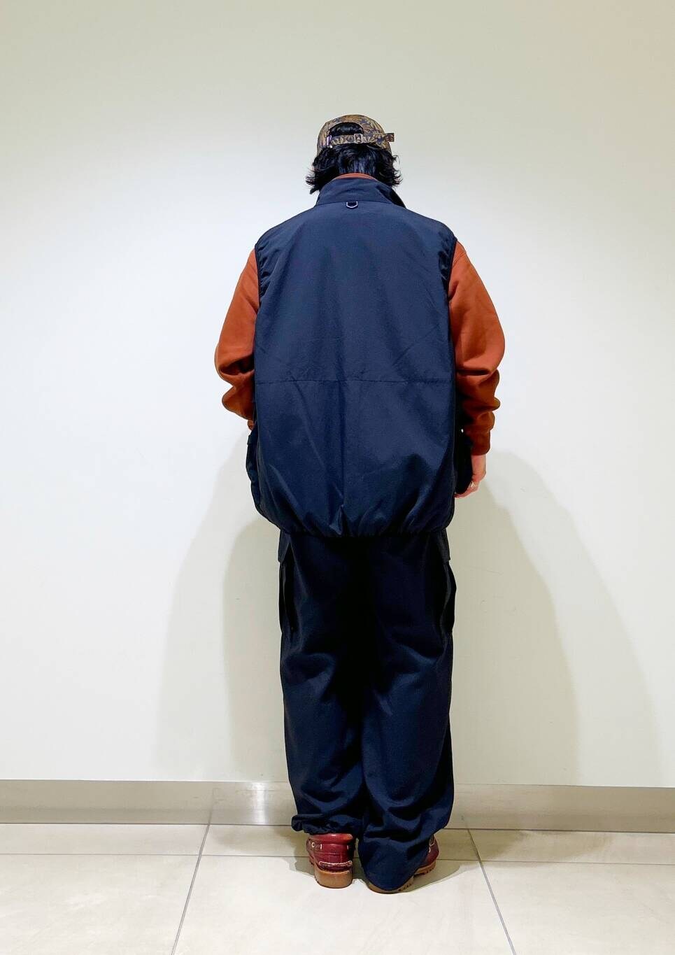 今回はwaq別注ベストとfoxハーフジップスウェットを使用したコーディネート。