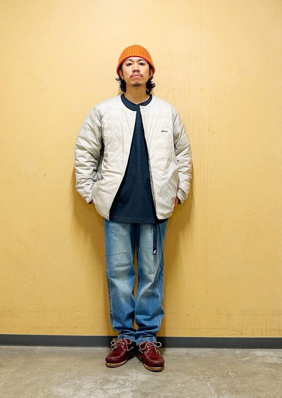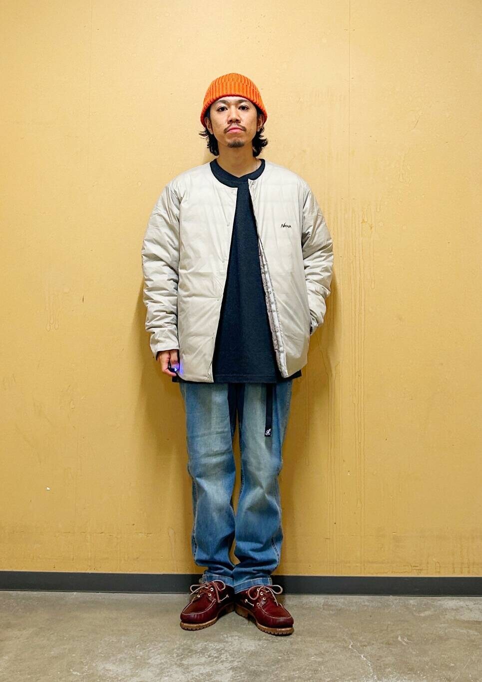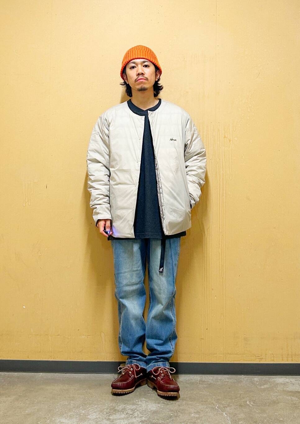 今回はnangaインナーダウンとグラミチ別注デニムパンツを使用したコーディネート。