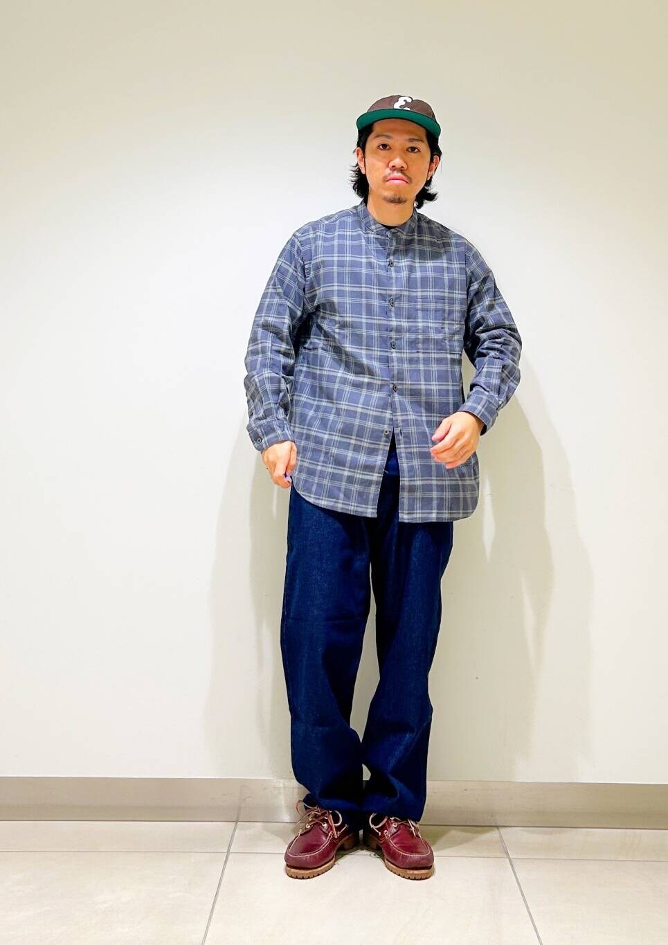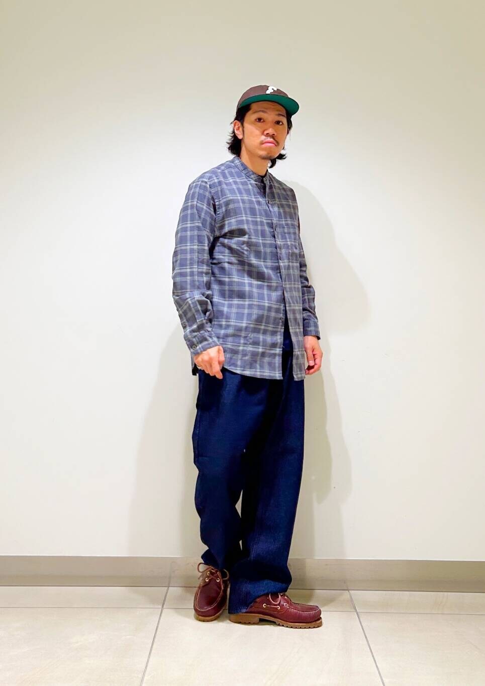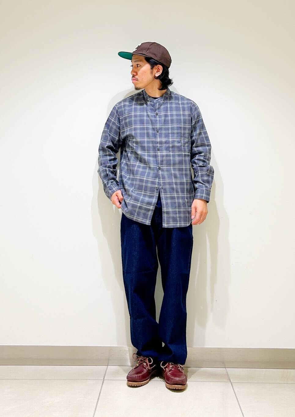 今回はビエラバンドカラーシャツとデニムパンツを使用したコーディネート。