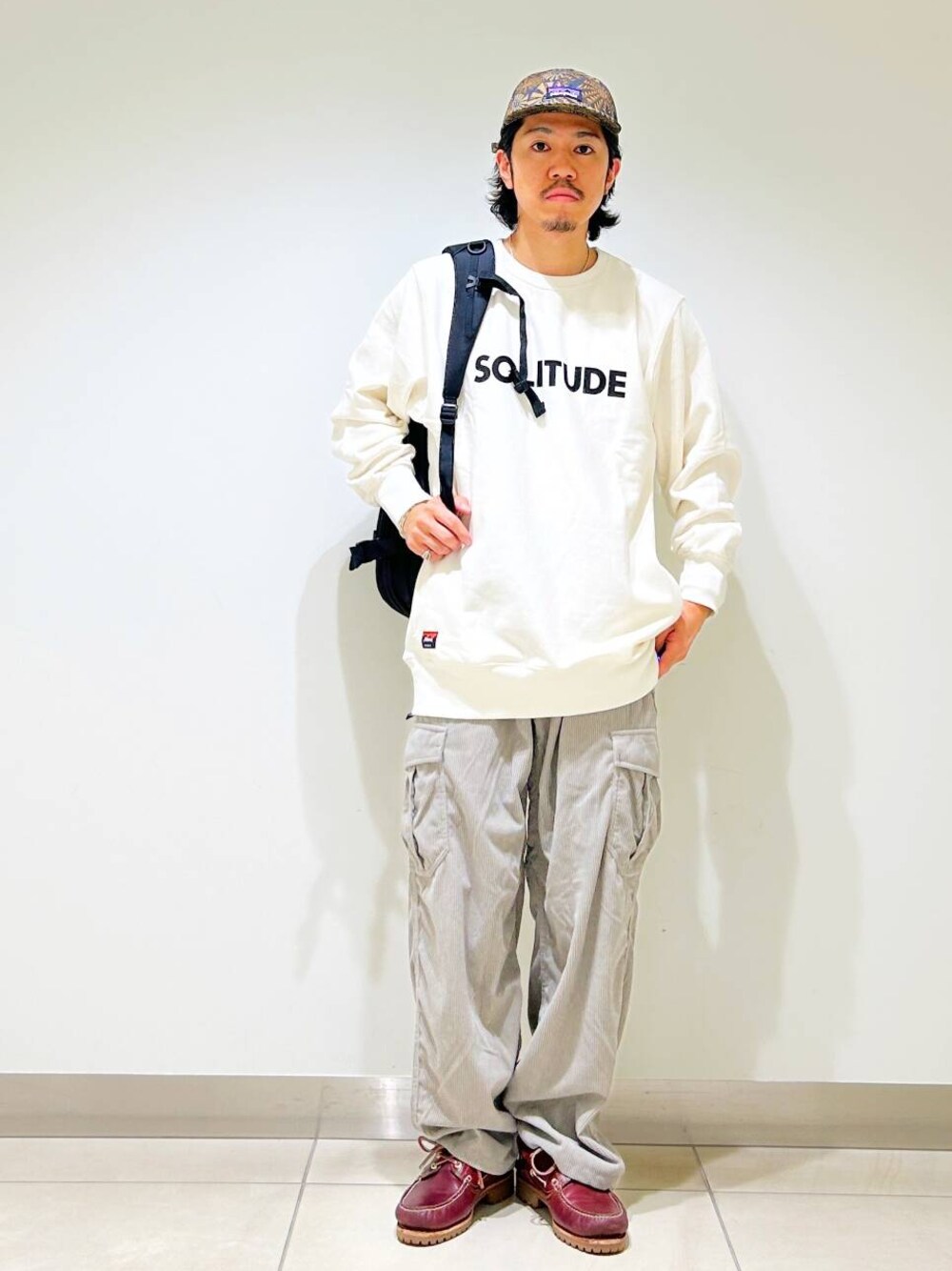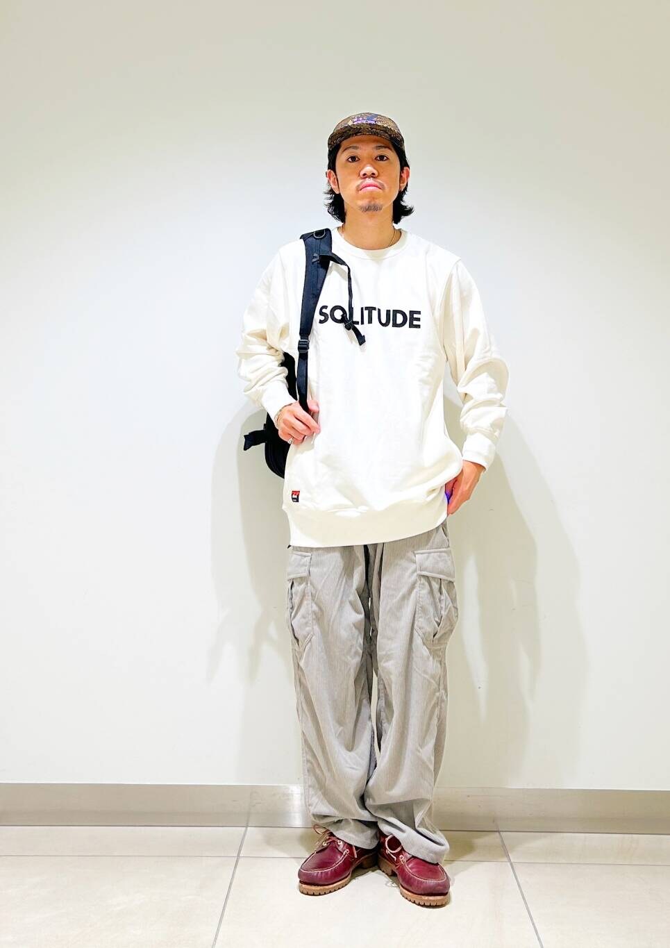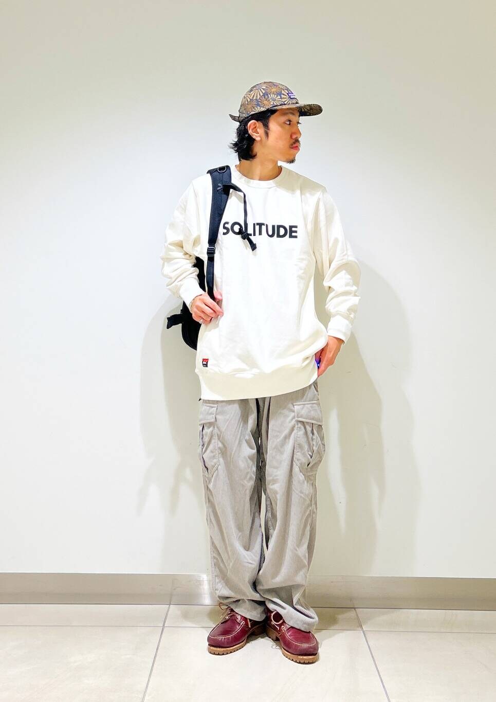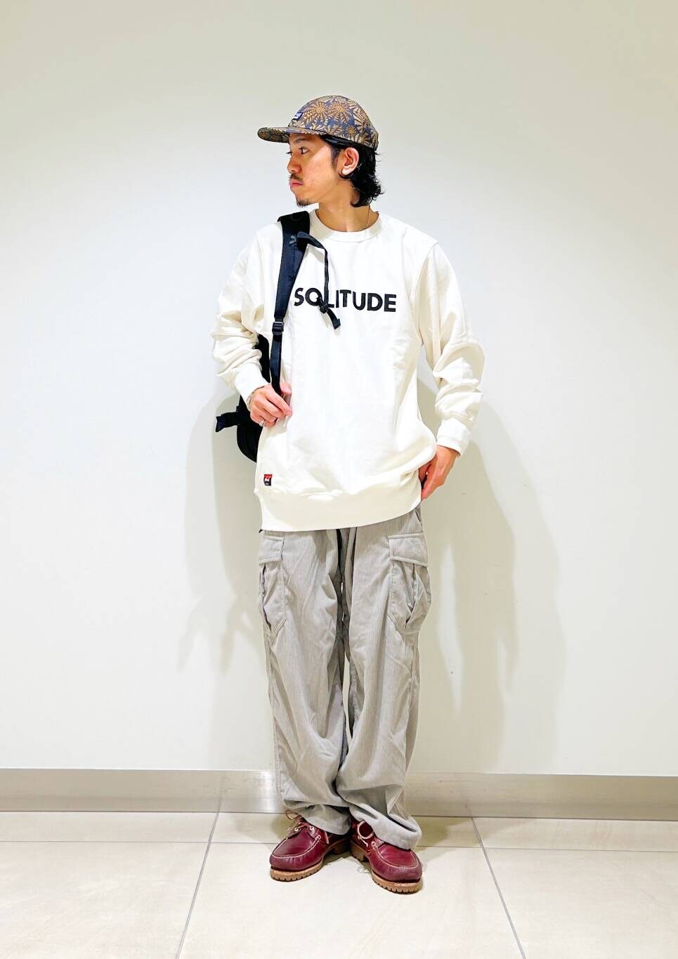 今回はnangaクルーネックスウェットとSTONEMASTER×ROKX×DOORS TERRAIN CARGO PANTSを使用したコーディネート。