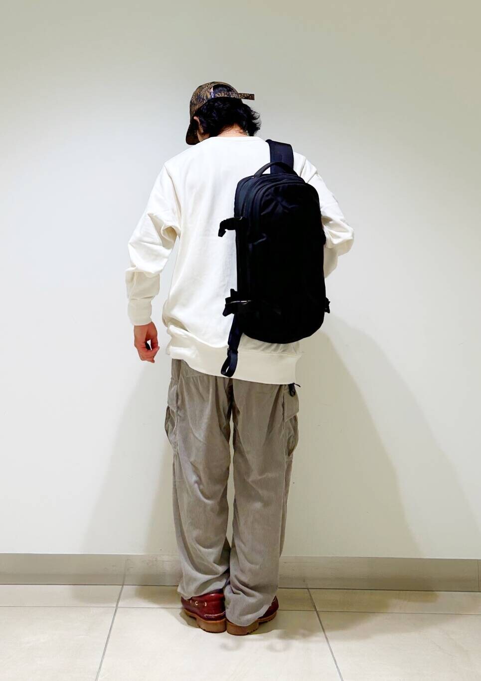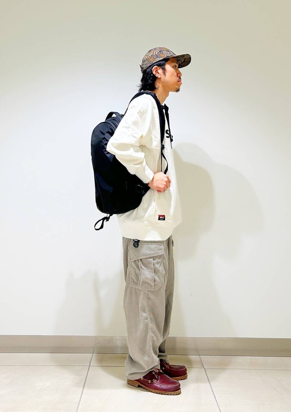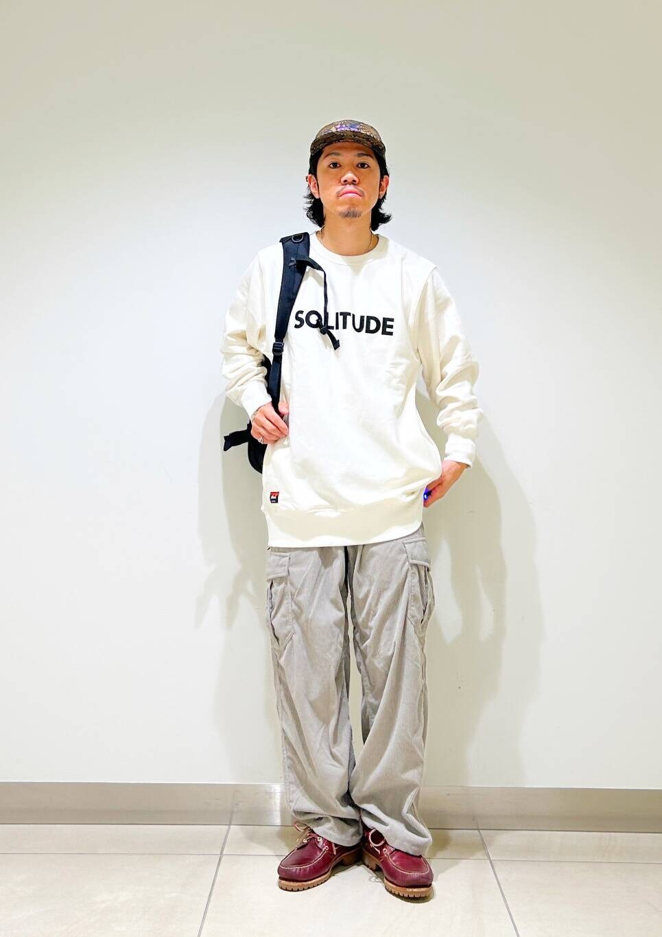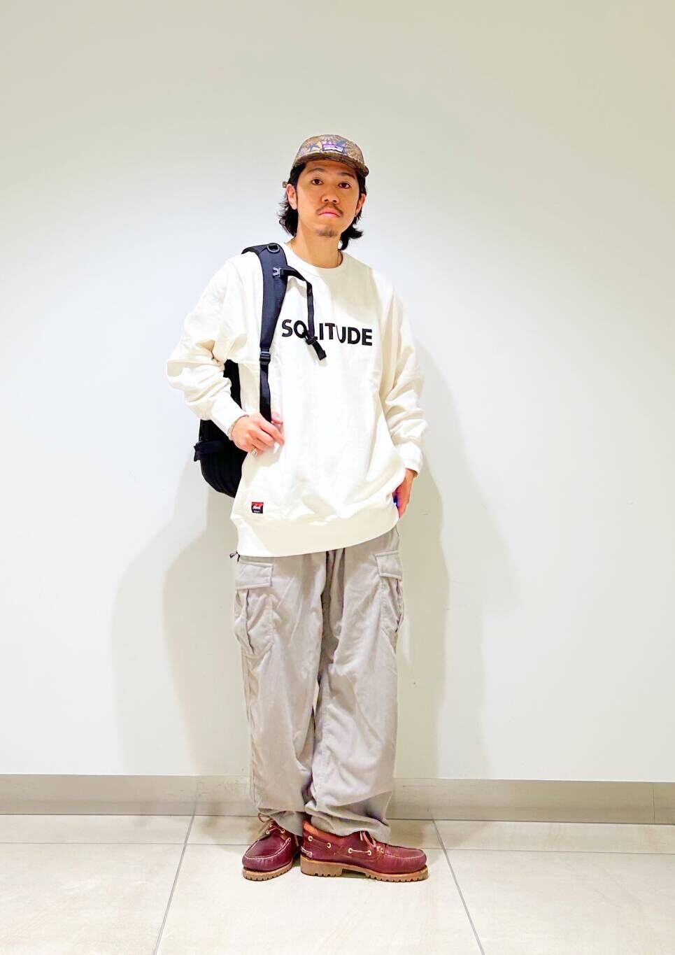 今回はnangaクルーネックスウェットとSTONEMASTER×ROKX×DOORS TERRAIN CARGO PANTSを使用したコーディネート。
