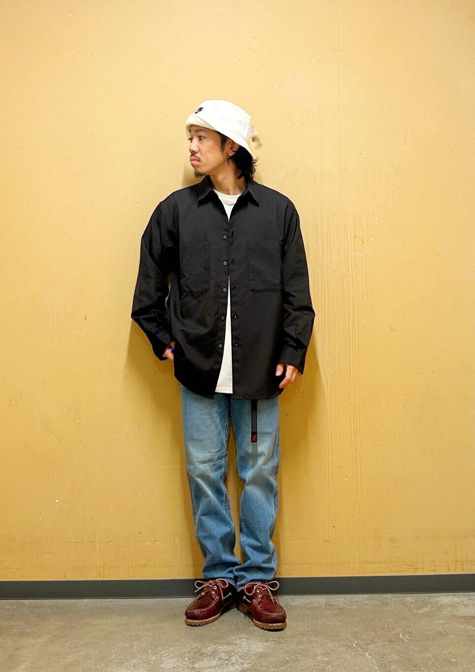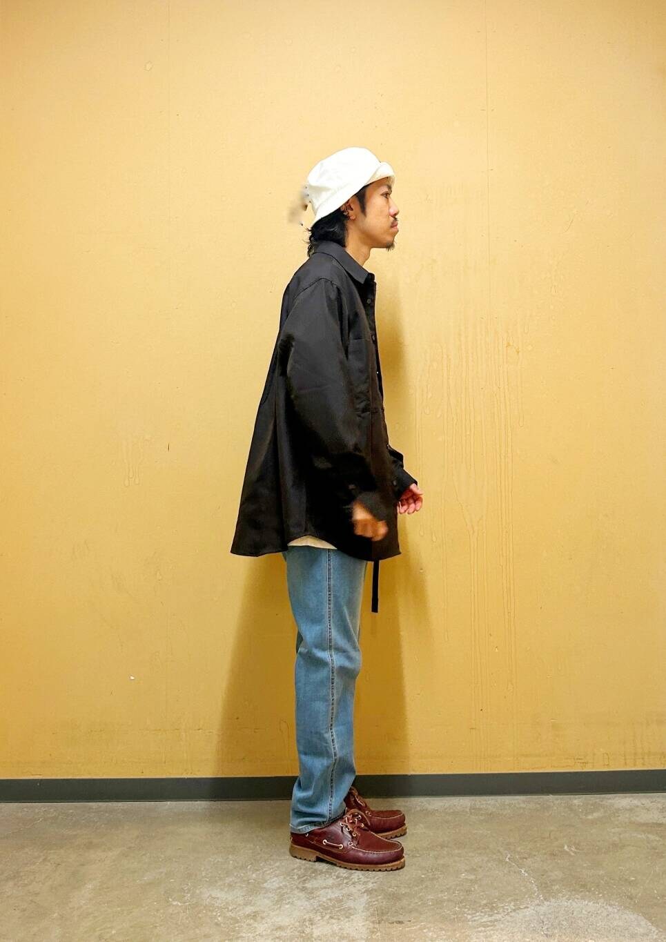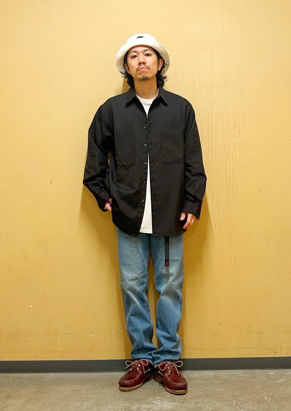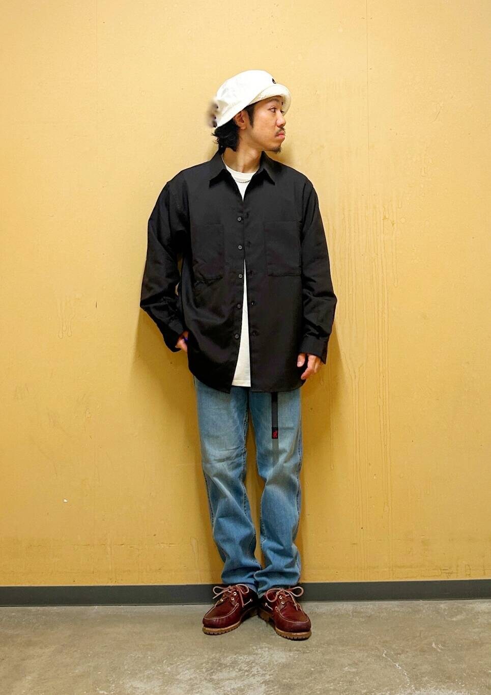 今回はセオアルファダブルポケットシャツとデニムパンツを使用したコーディネート。