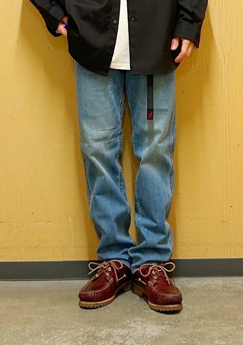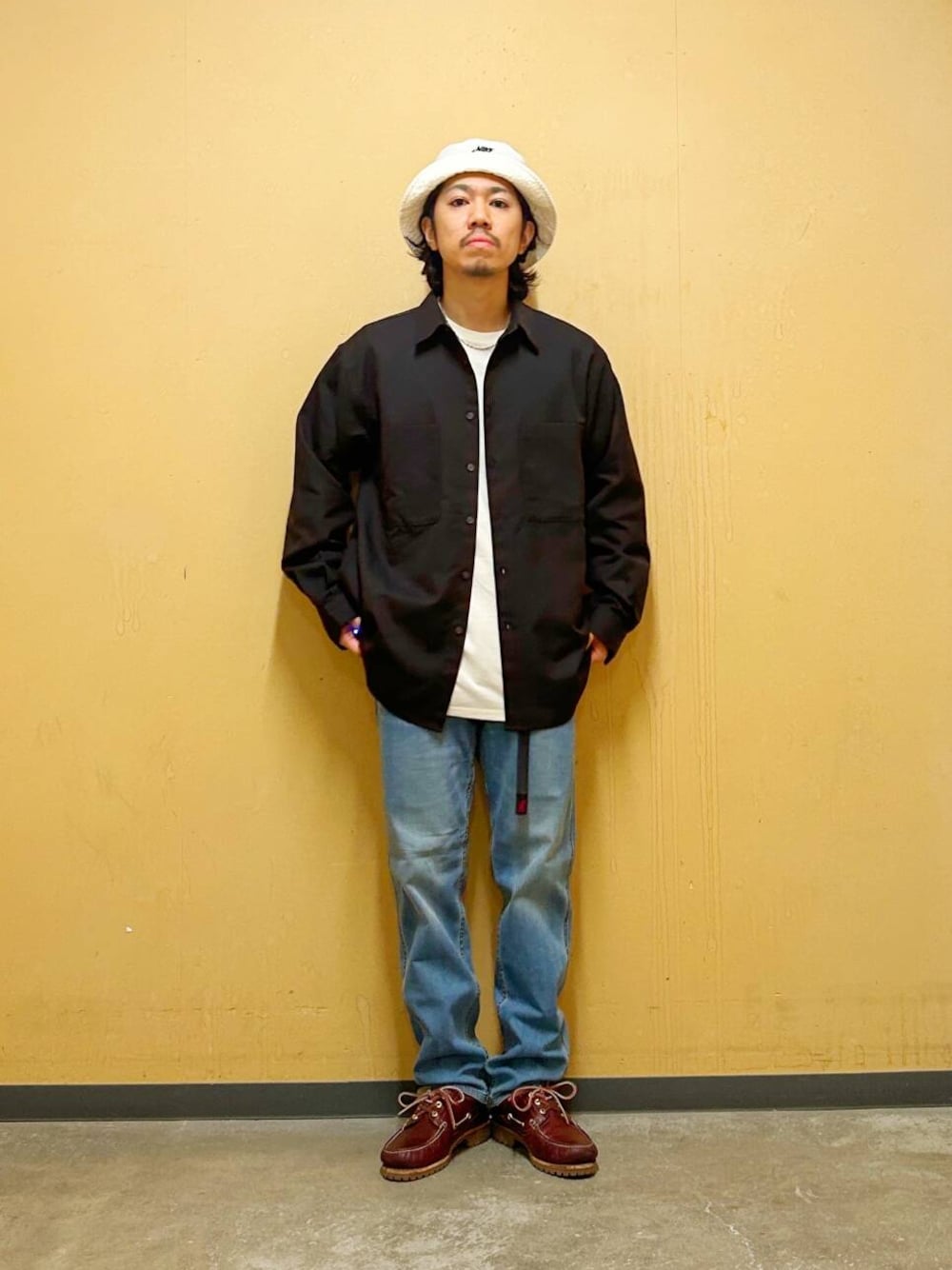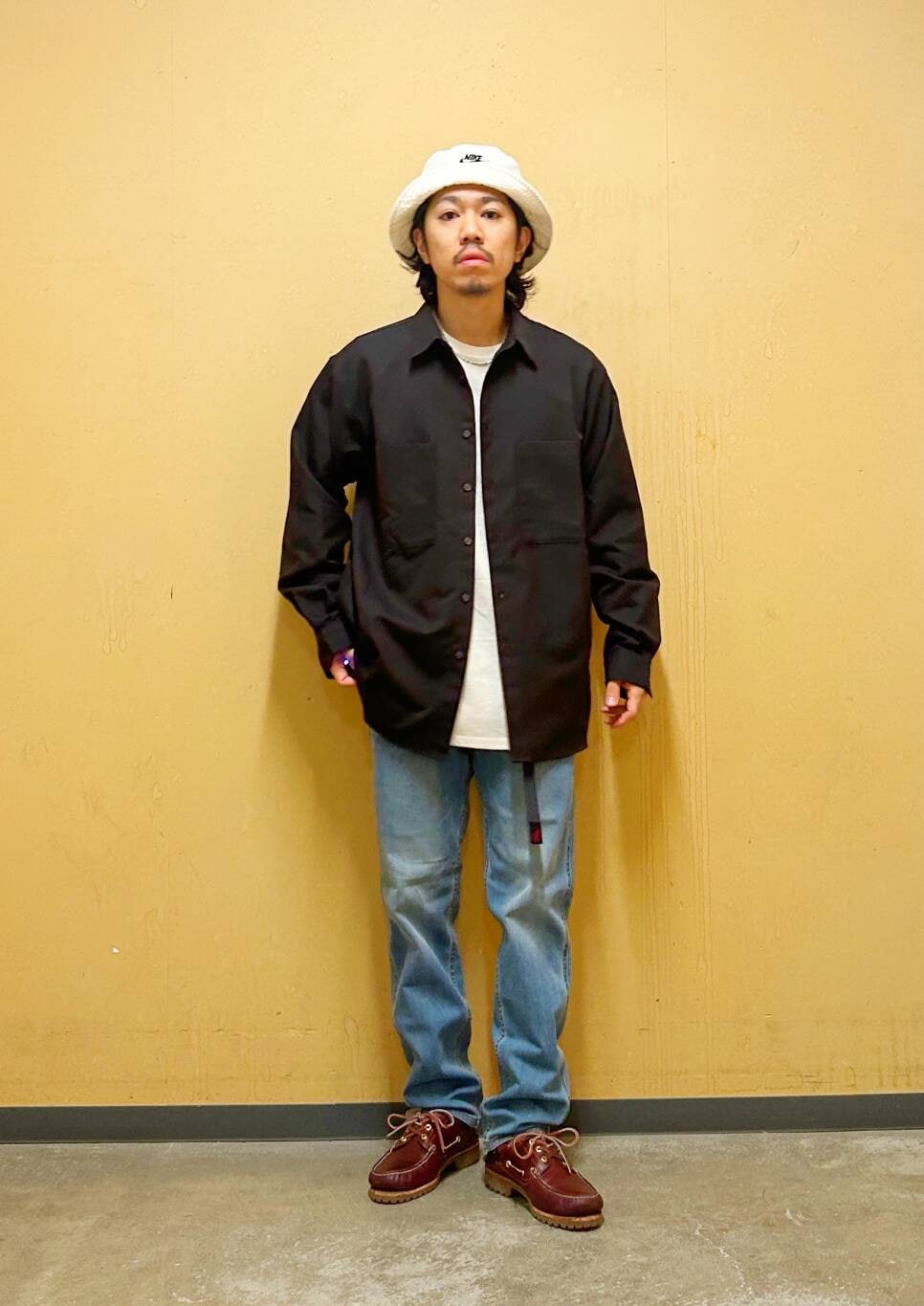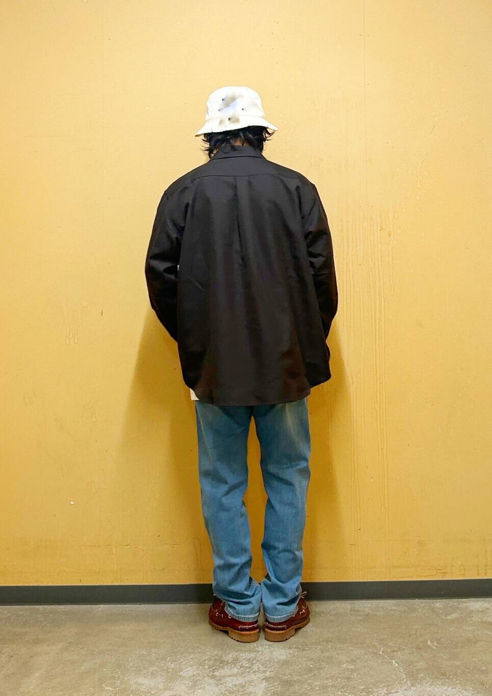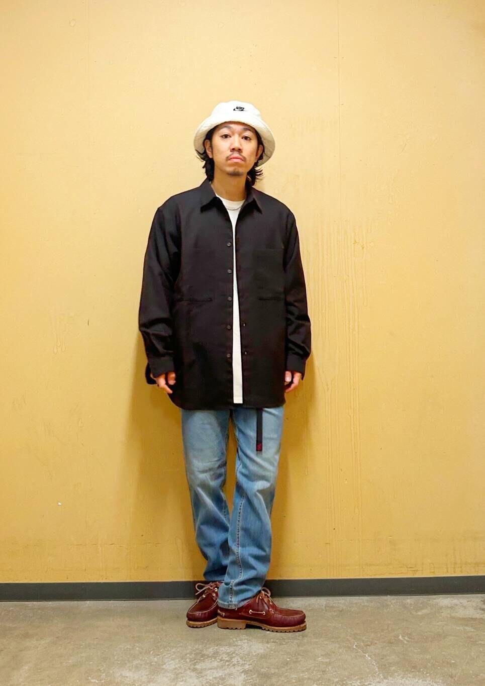 今回はセオアルファダブルポケットシャツとデニムパンツを使用したコーディネート。