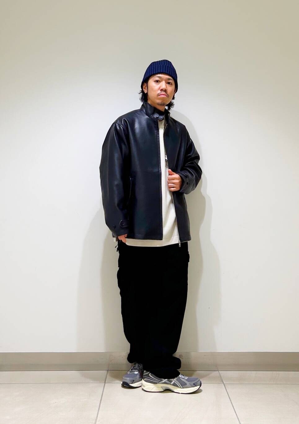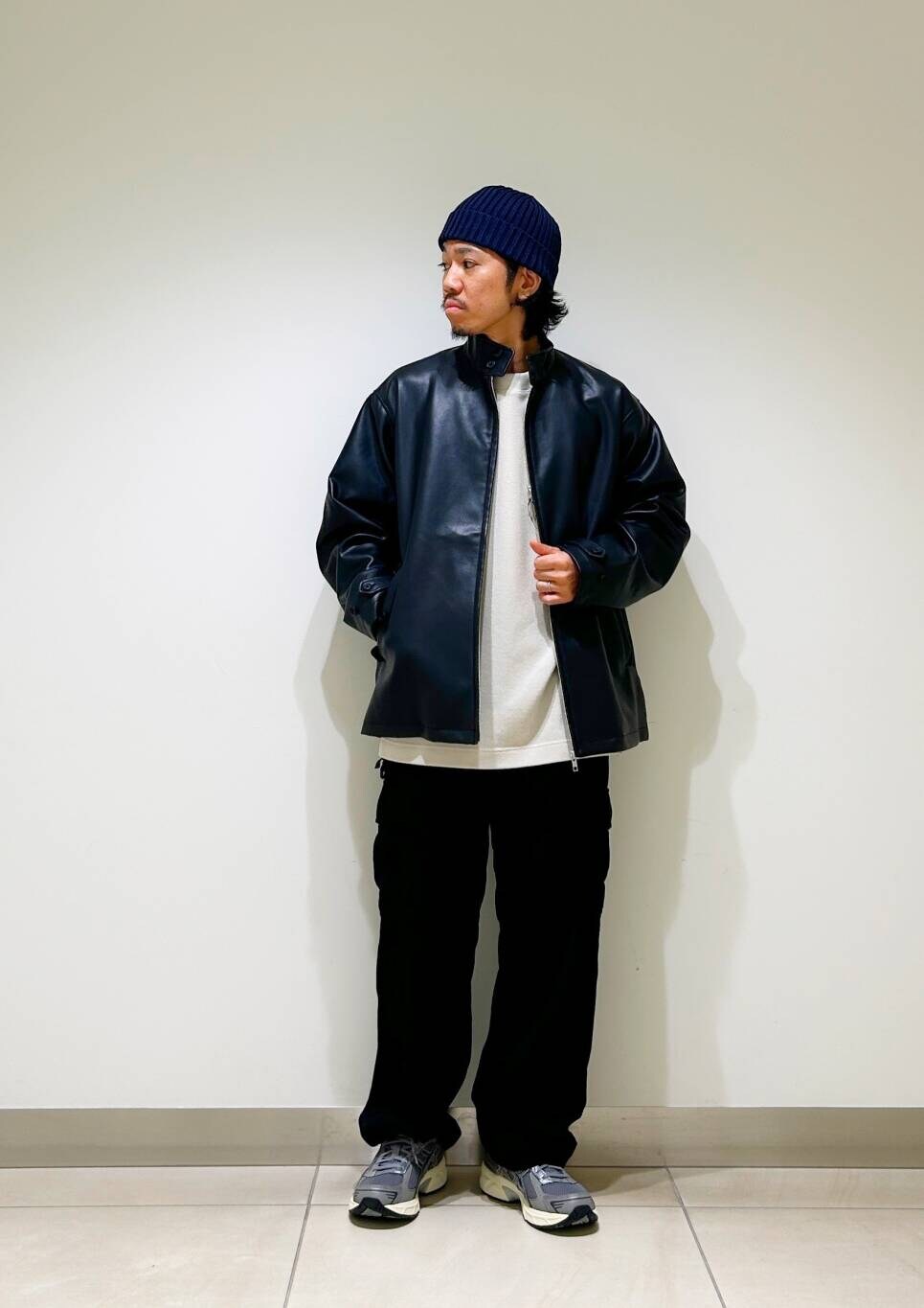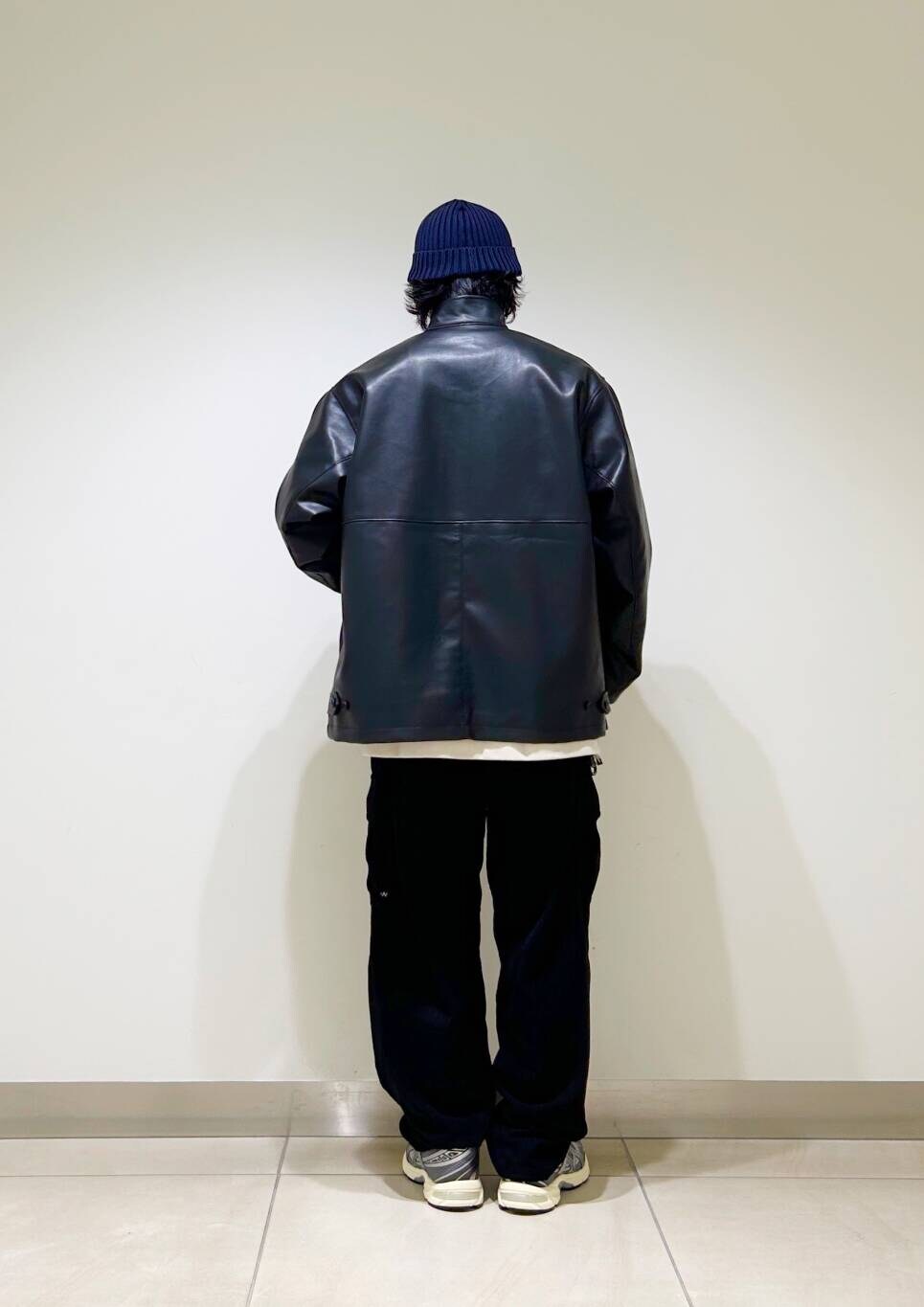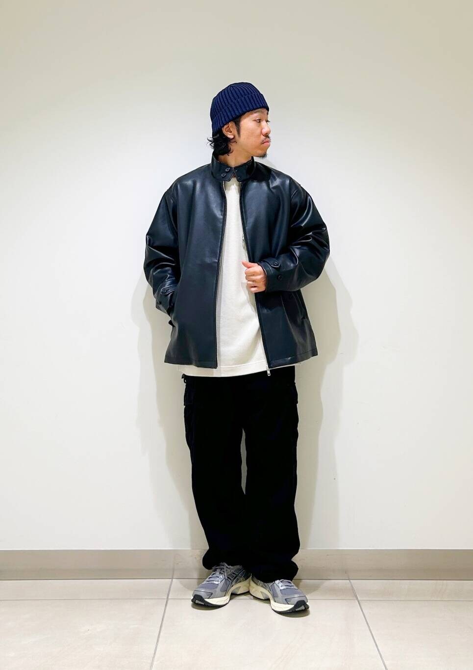 ラムレザー風のフェイクレザーを使用しており、程よい光沢感と肉厚に加え、柔らかな着心地が魅力の一着。