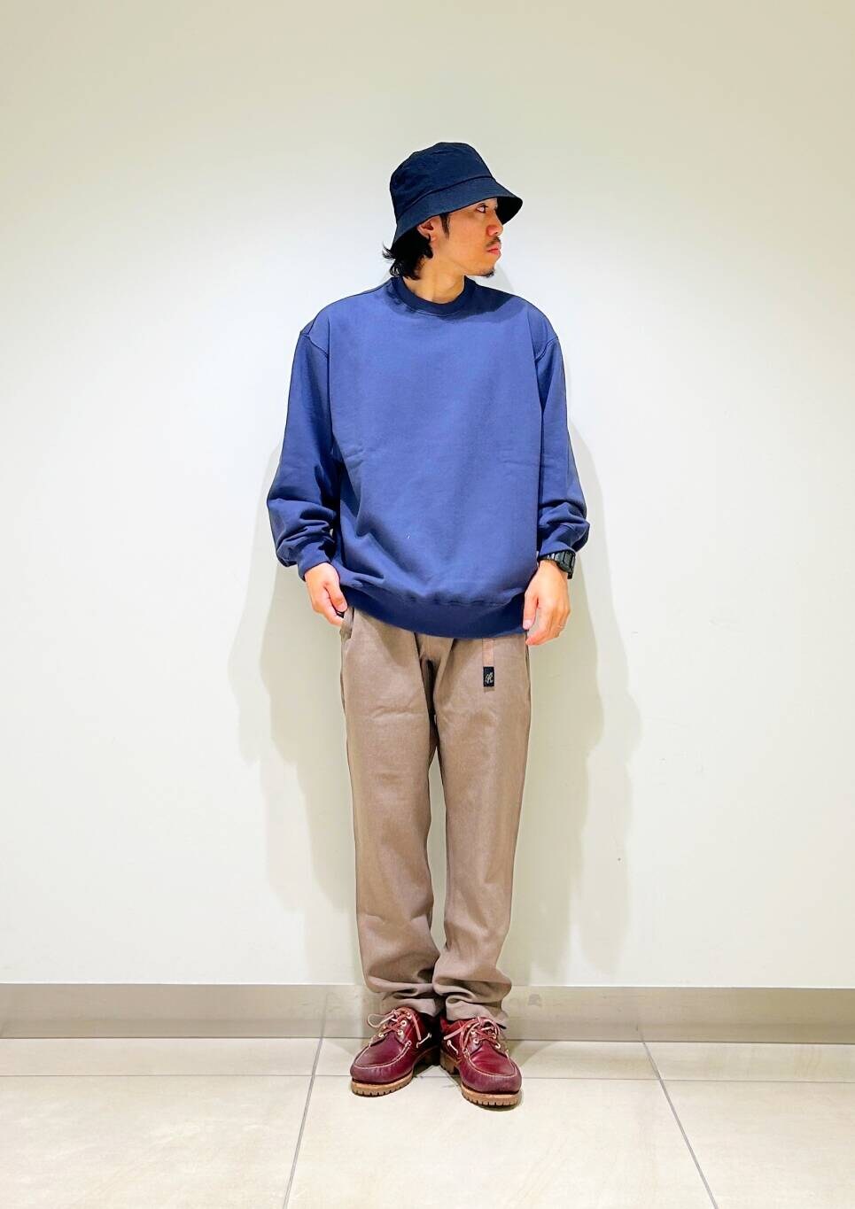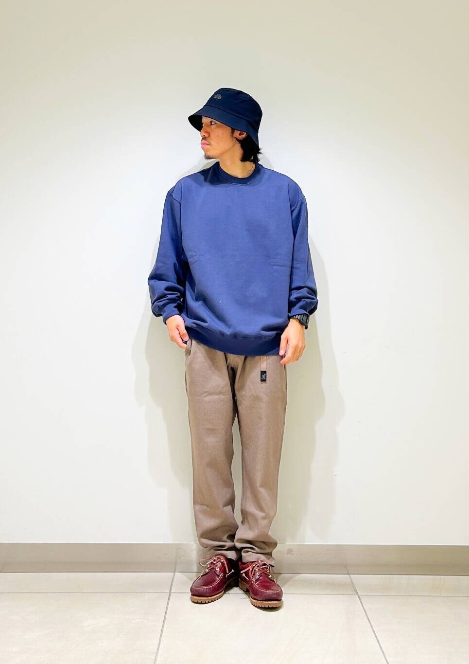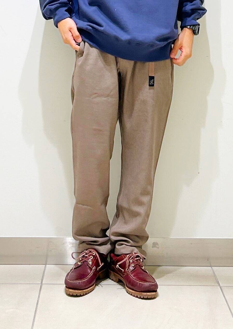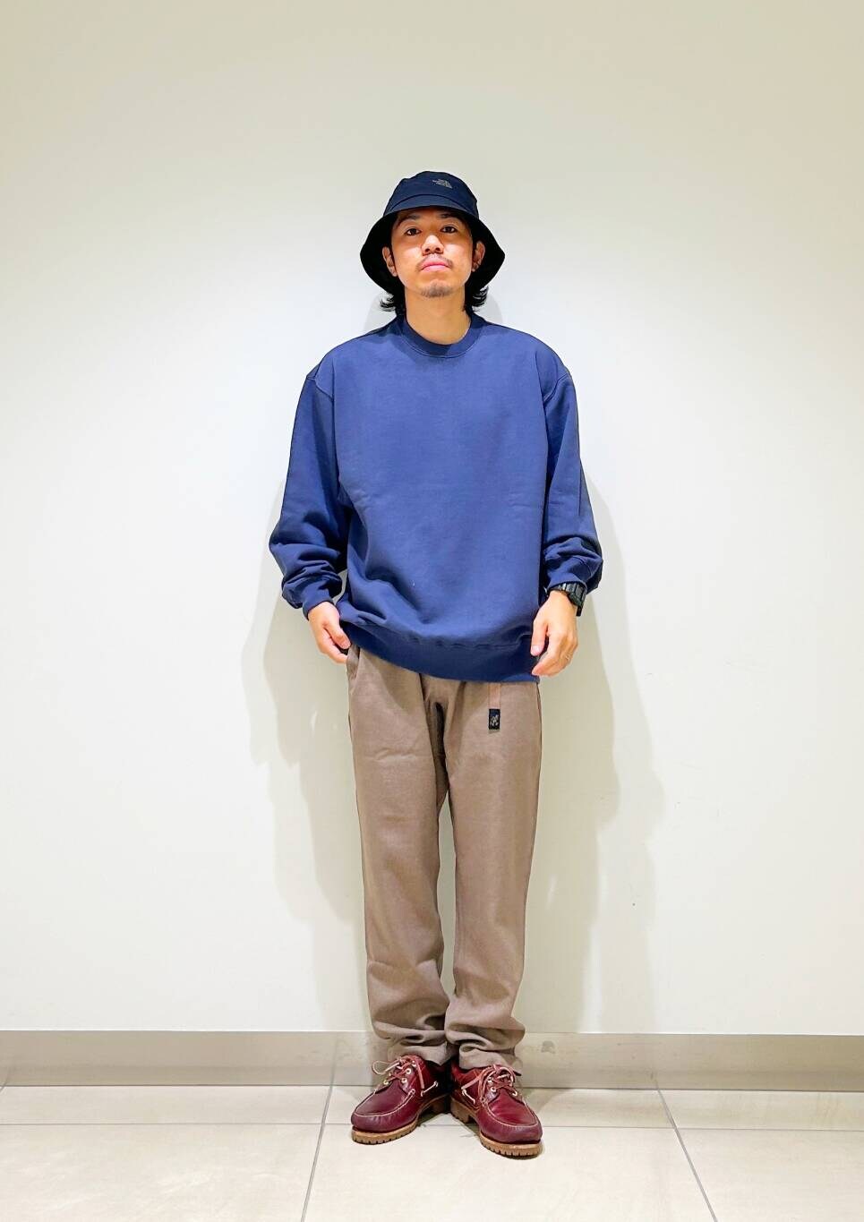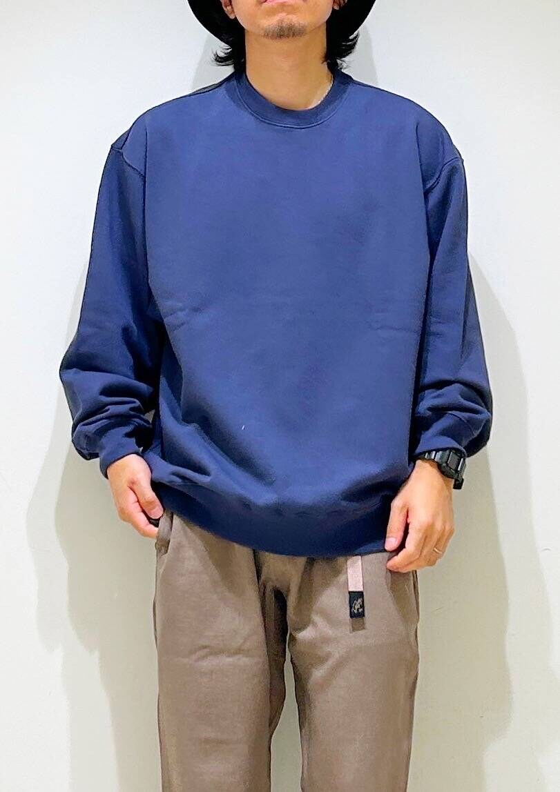今回はクルーネックスウェットとグラミチ別注ウールライクトラウザーを使用したコーディネート。