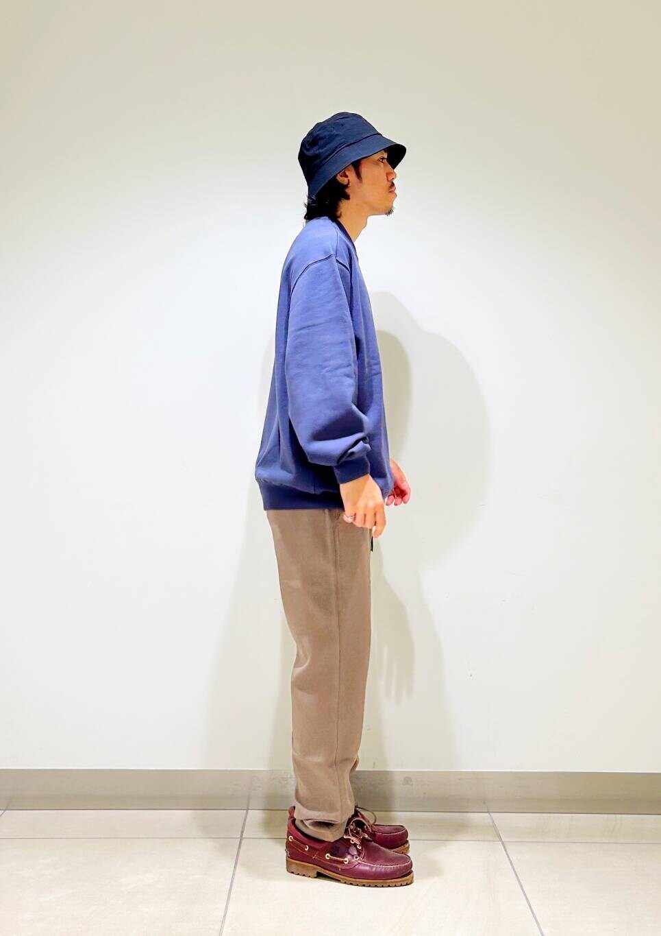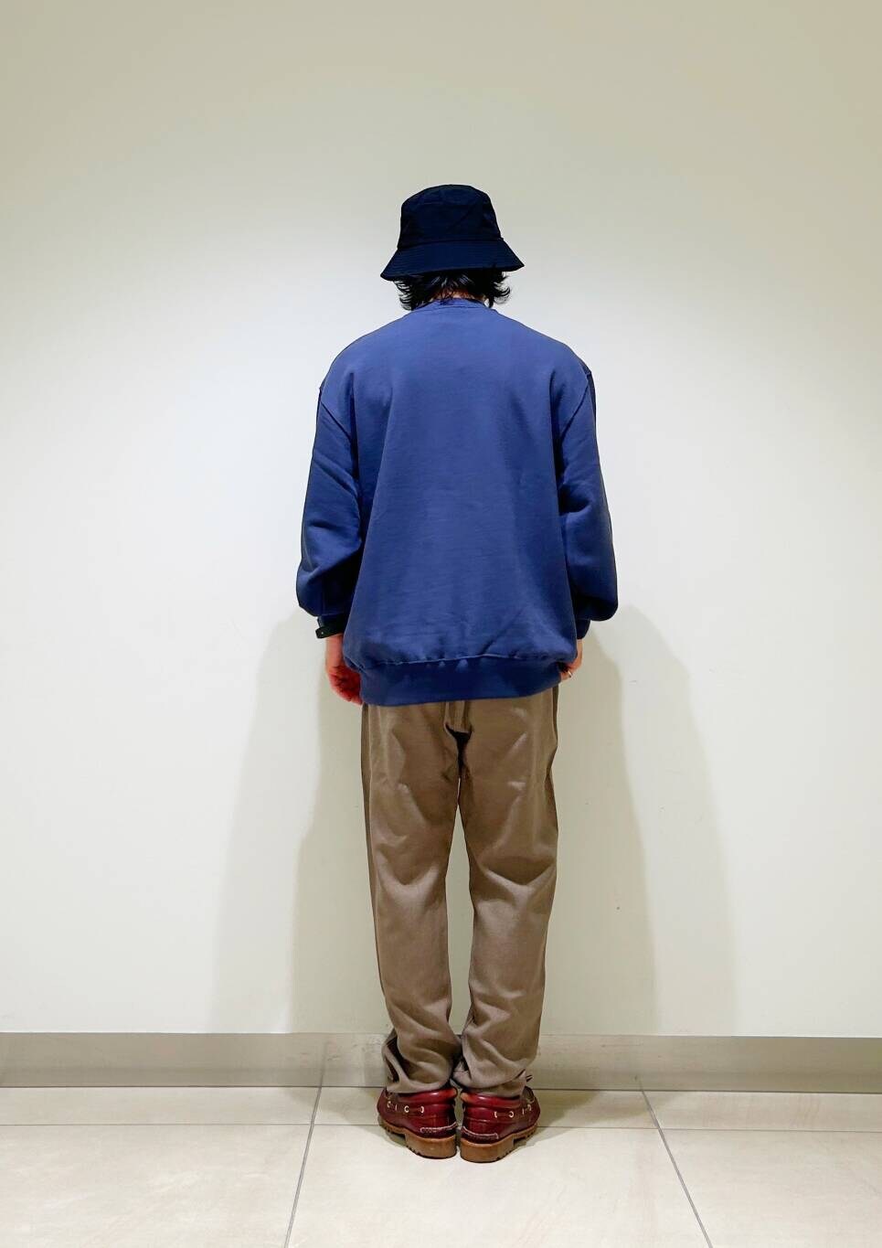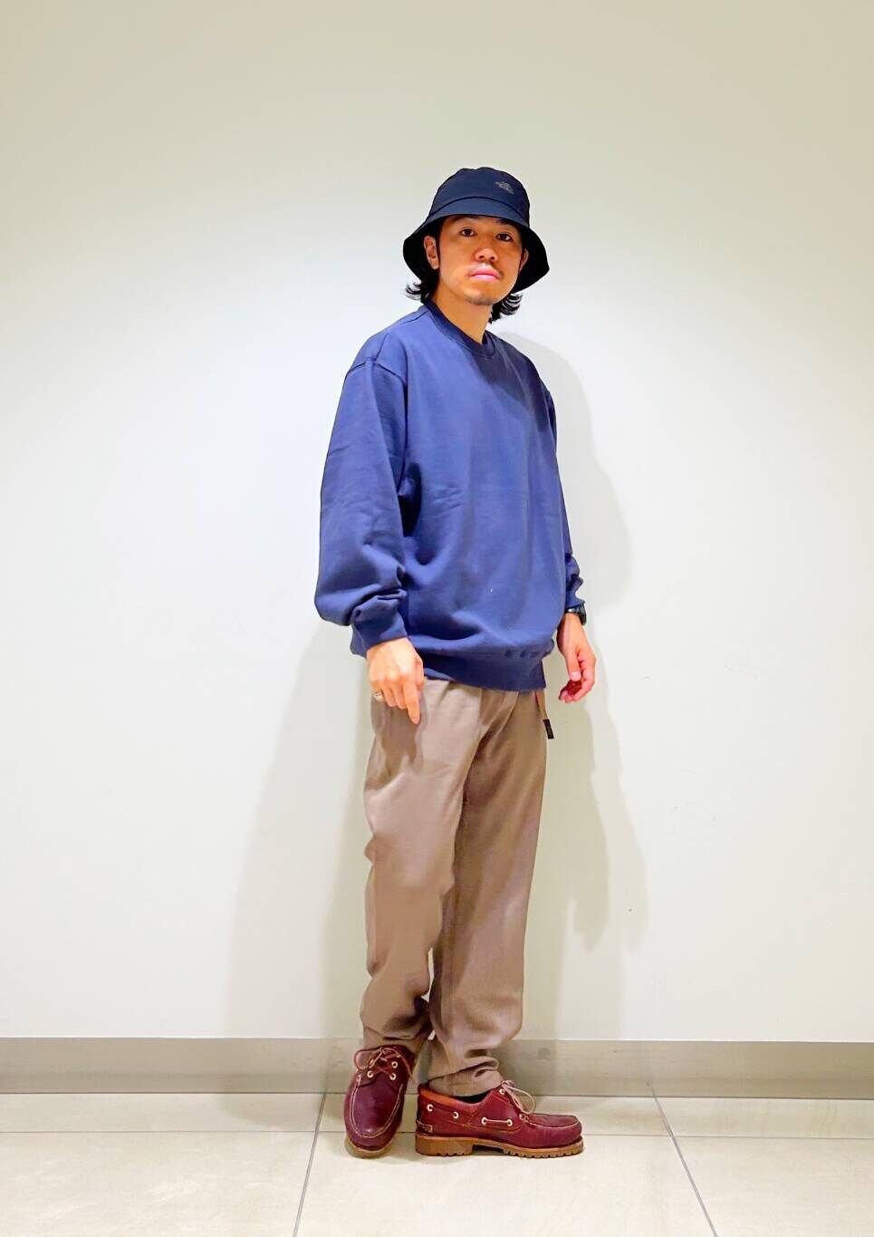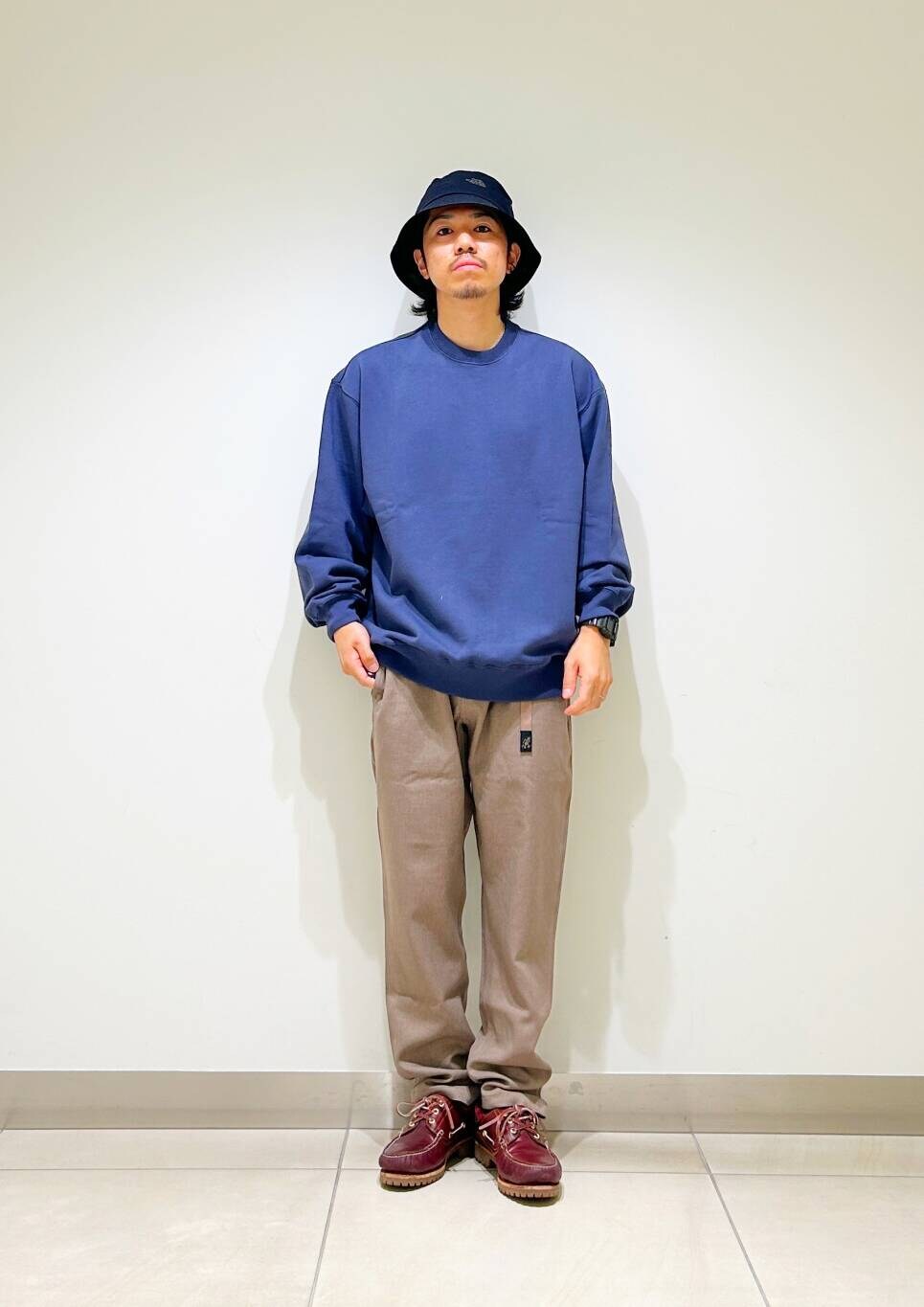 今回はクルーネックスウェットとグラミチ別注ウールライクトラウザーを使用したコーディネート。