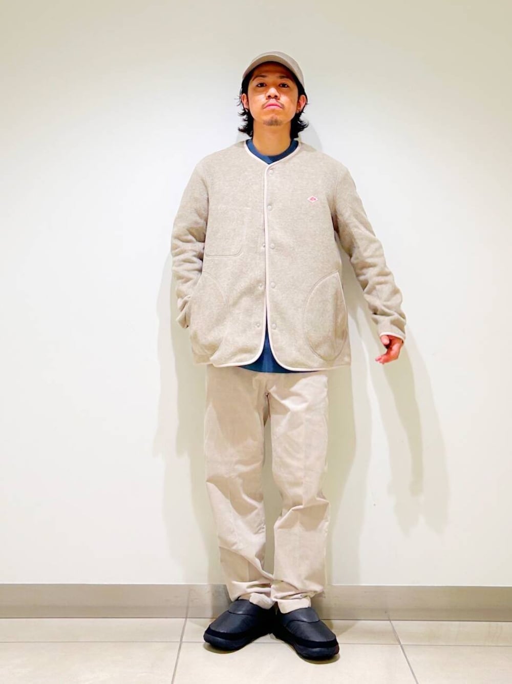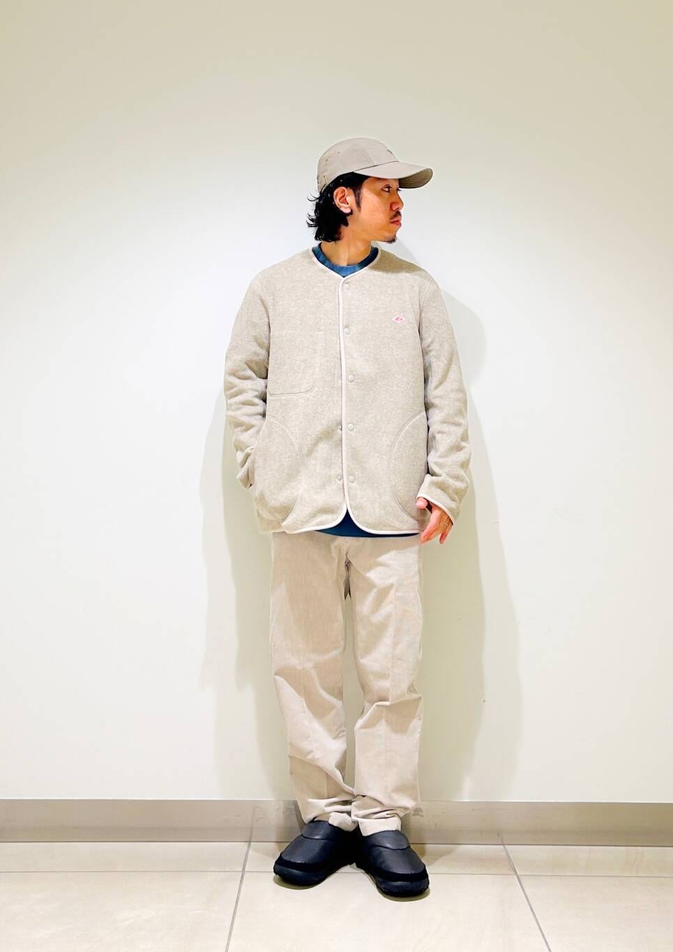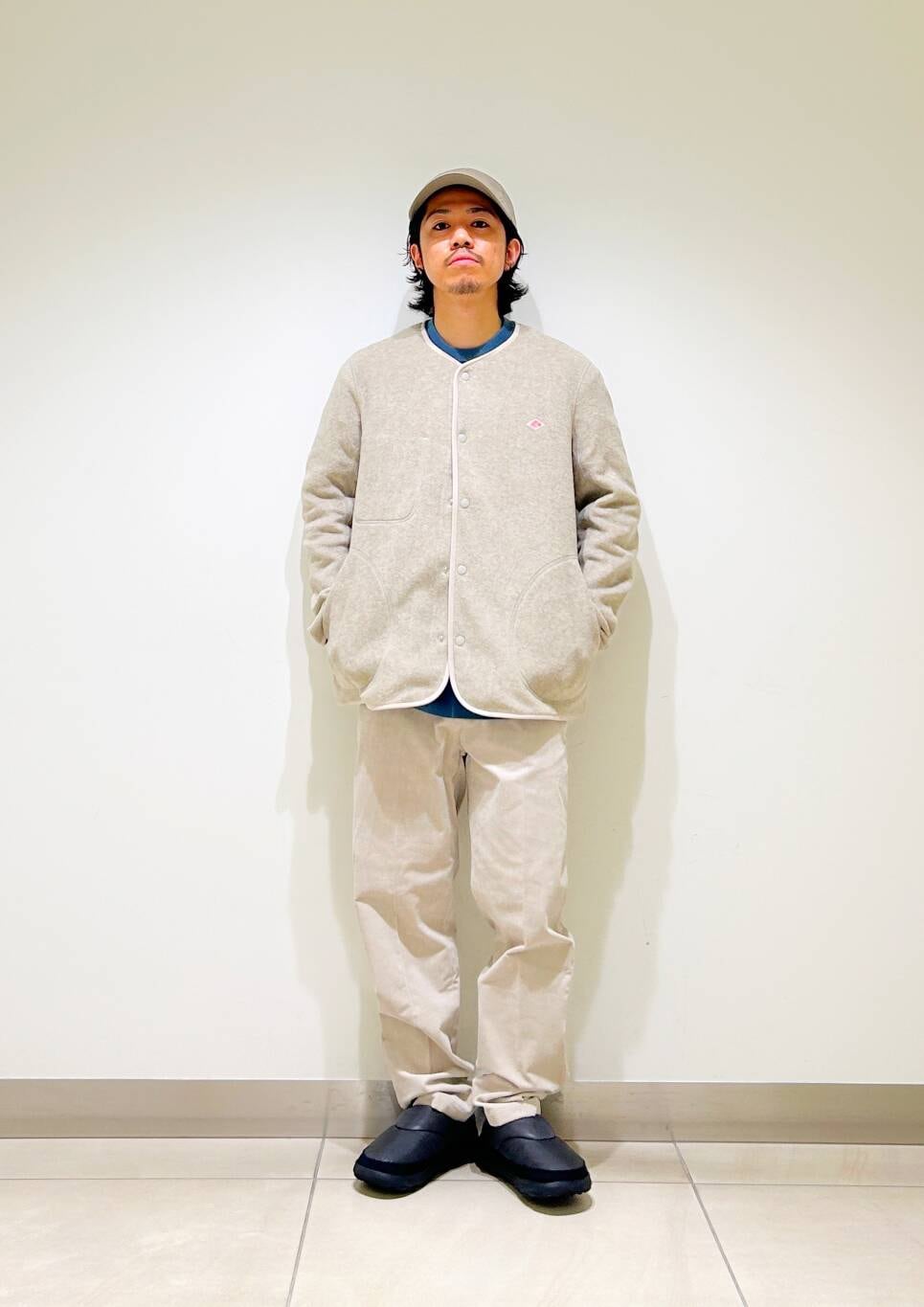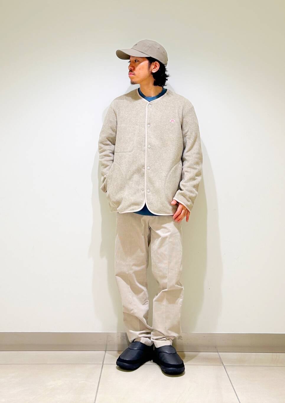今回はDANTON FLEECE COLLARLESS JACKETとコーデュロイトラウザーを使用したコーディネート。