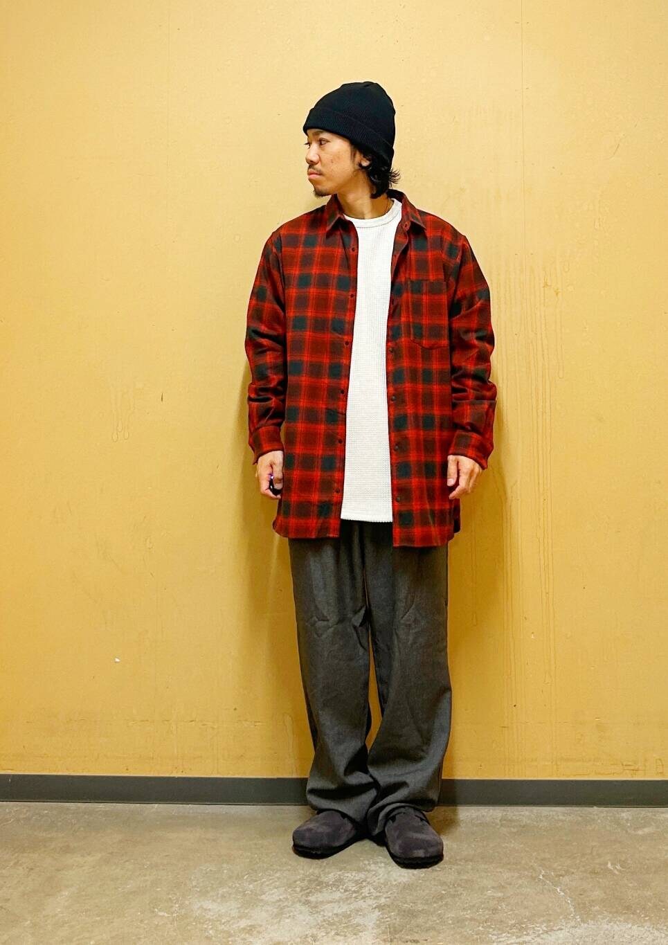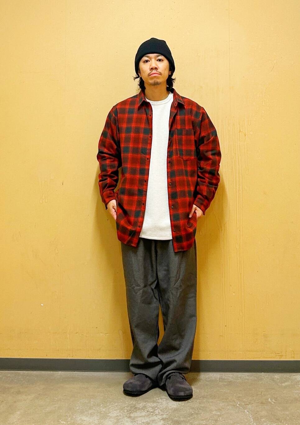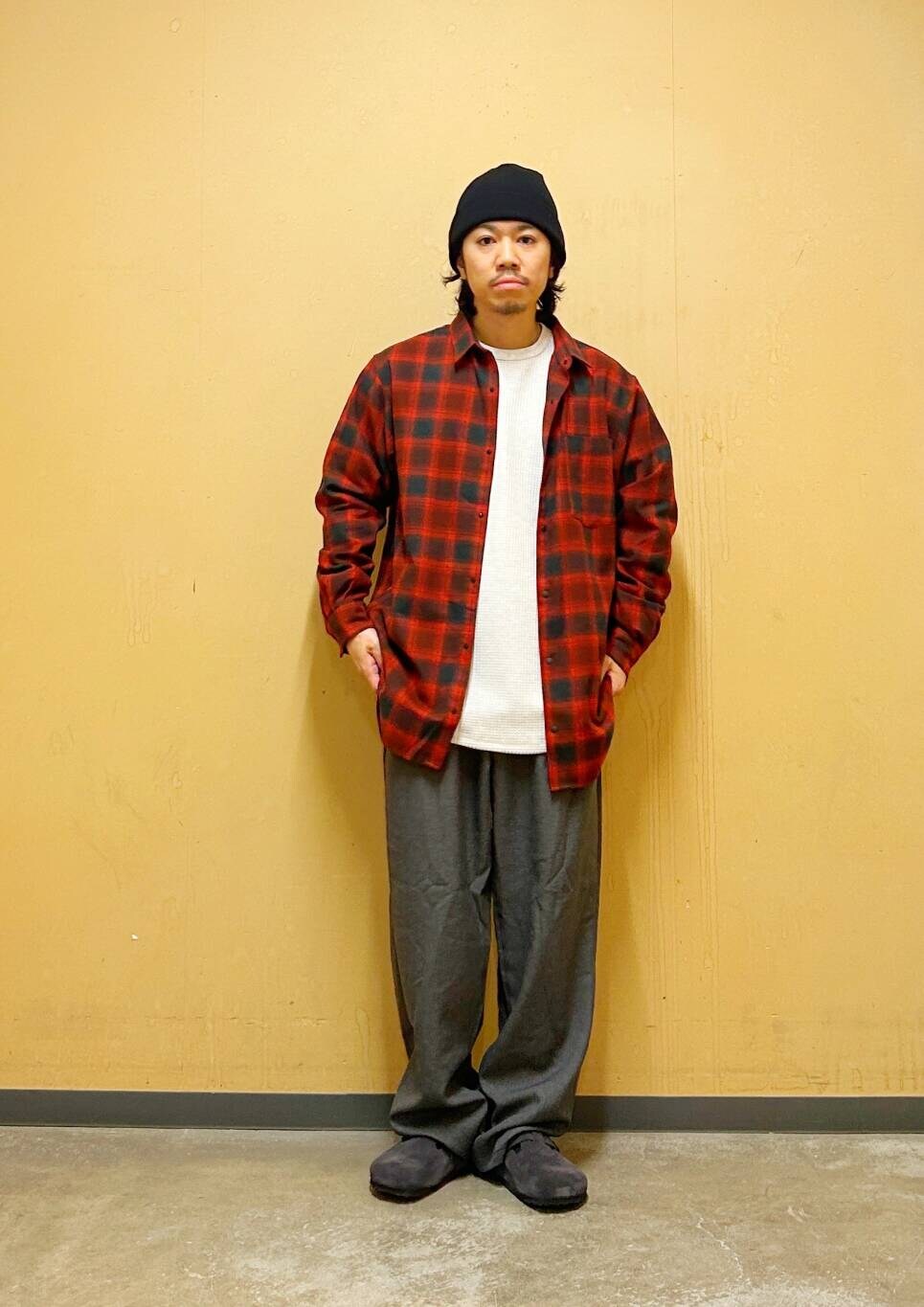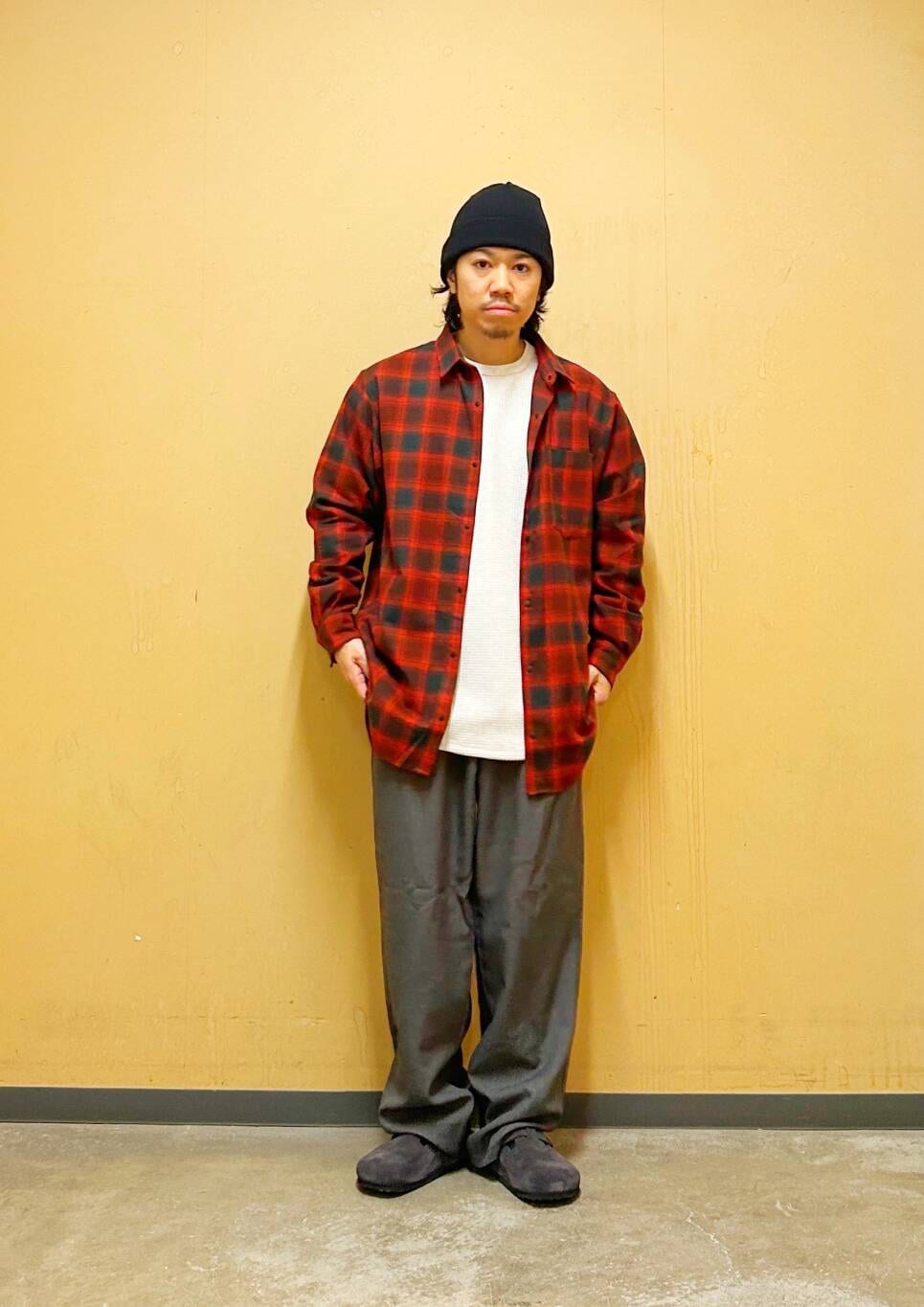 今回はオンブレチェックシャツとツータックイージートラウザーを使用したコーディネート。