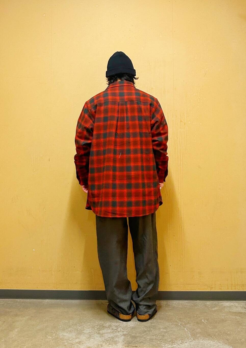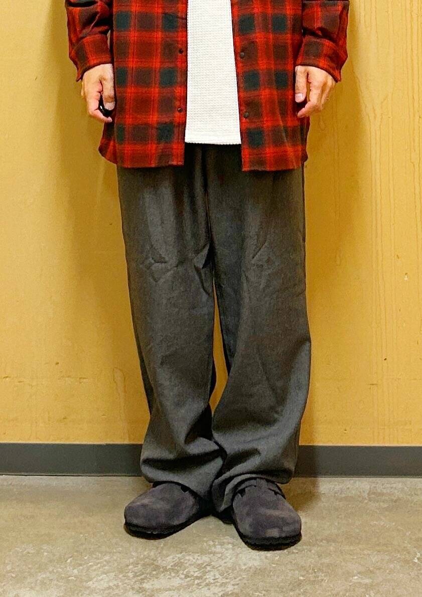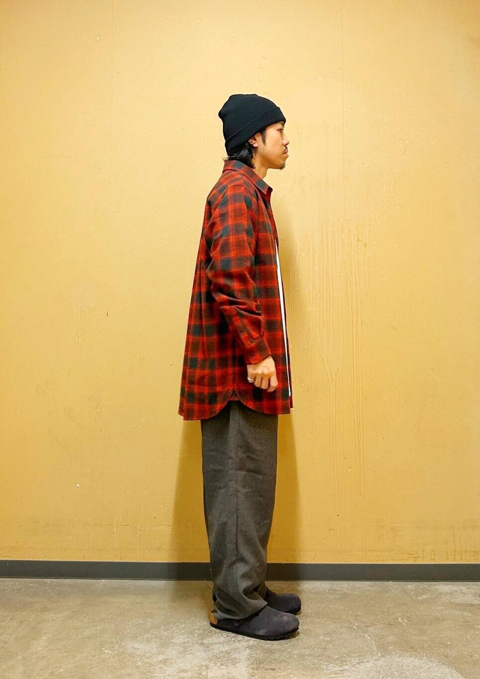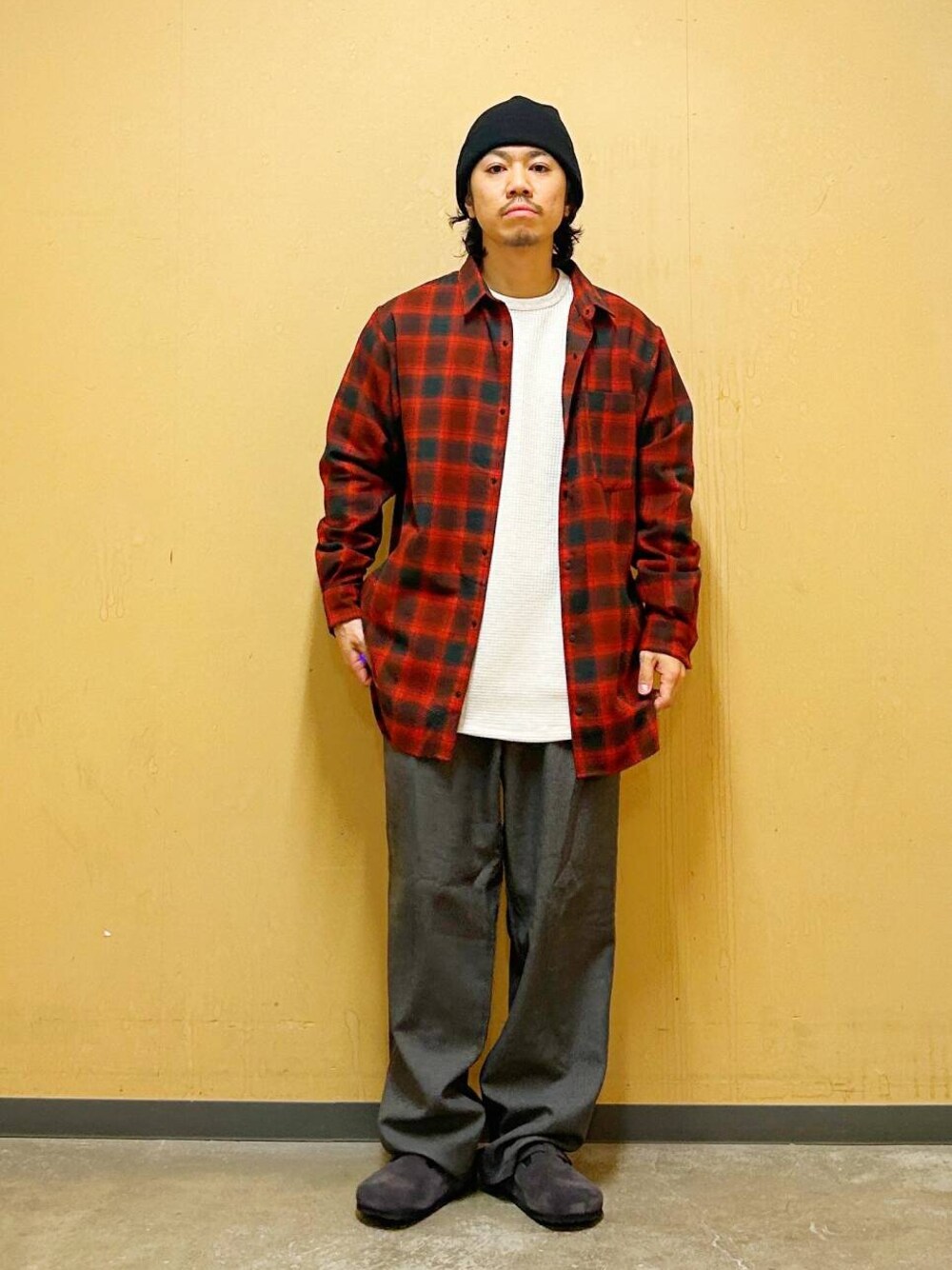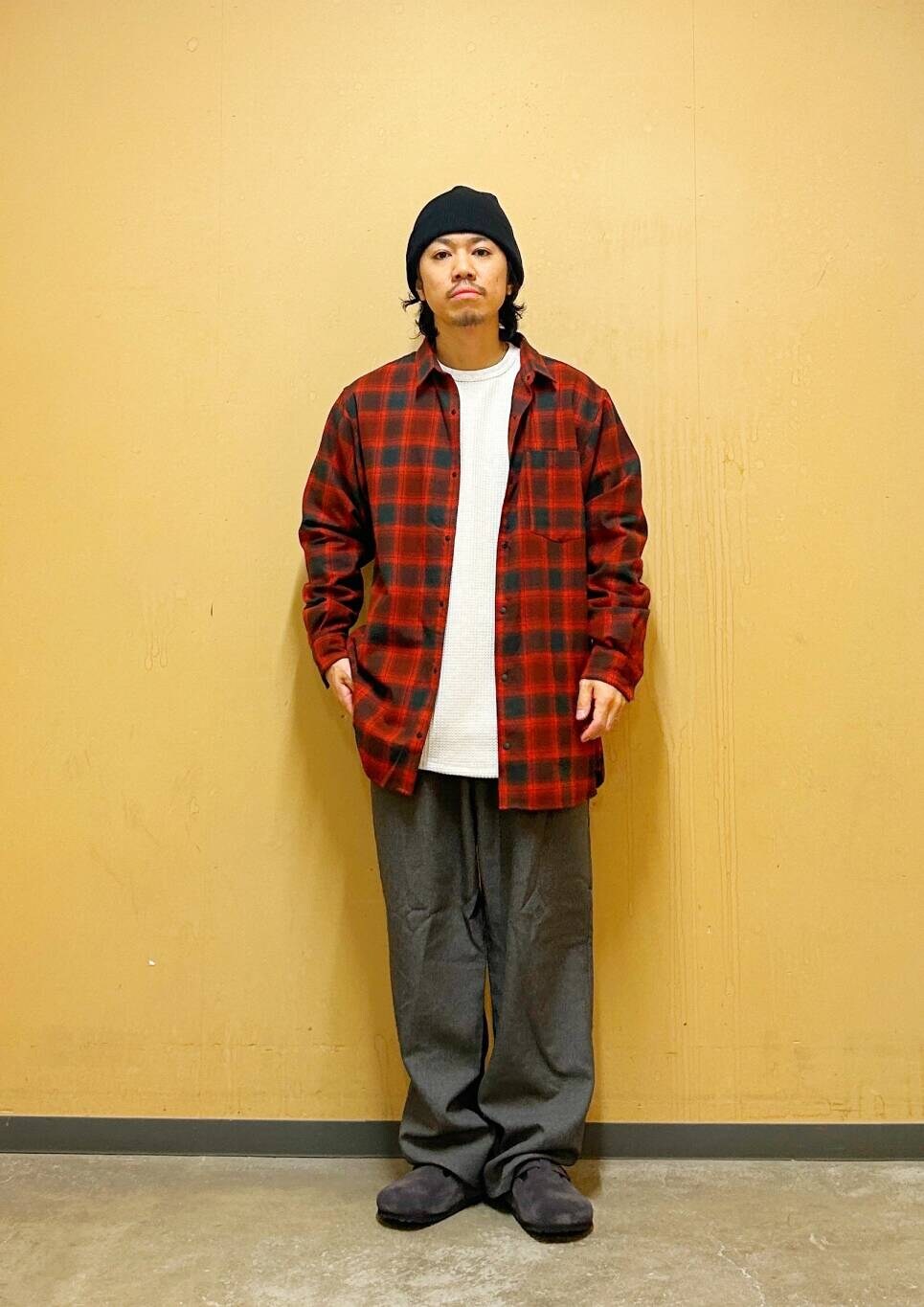 今回はオンブレチェックシャツとツータックイージートラウザーを使用したコーディネート。