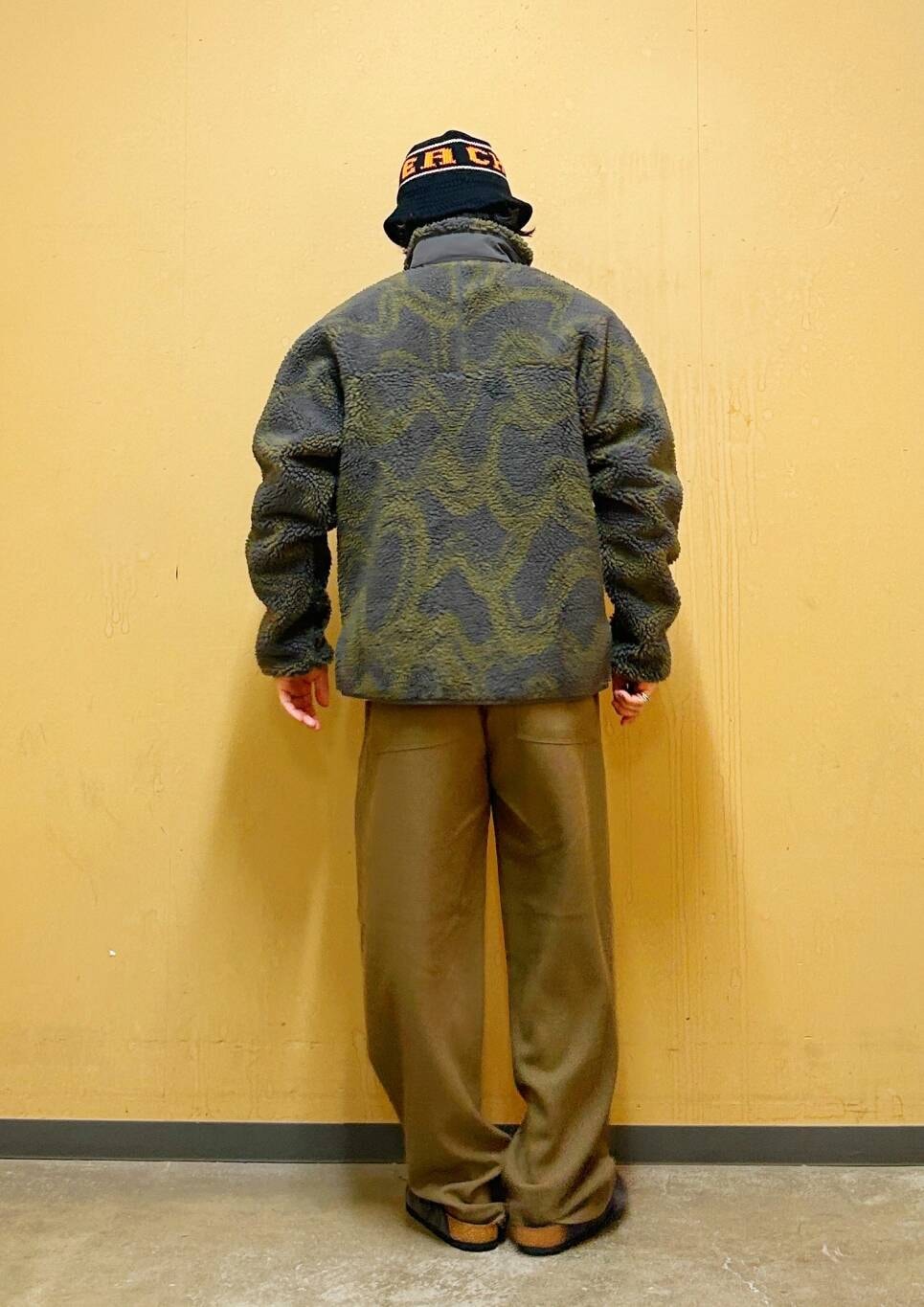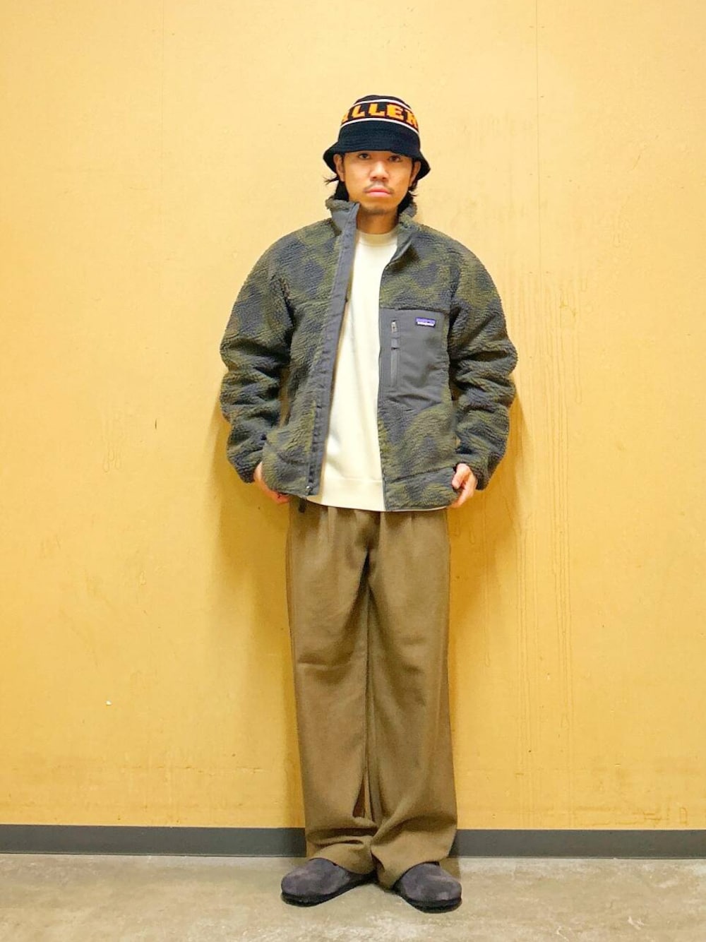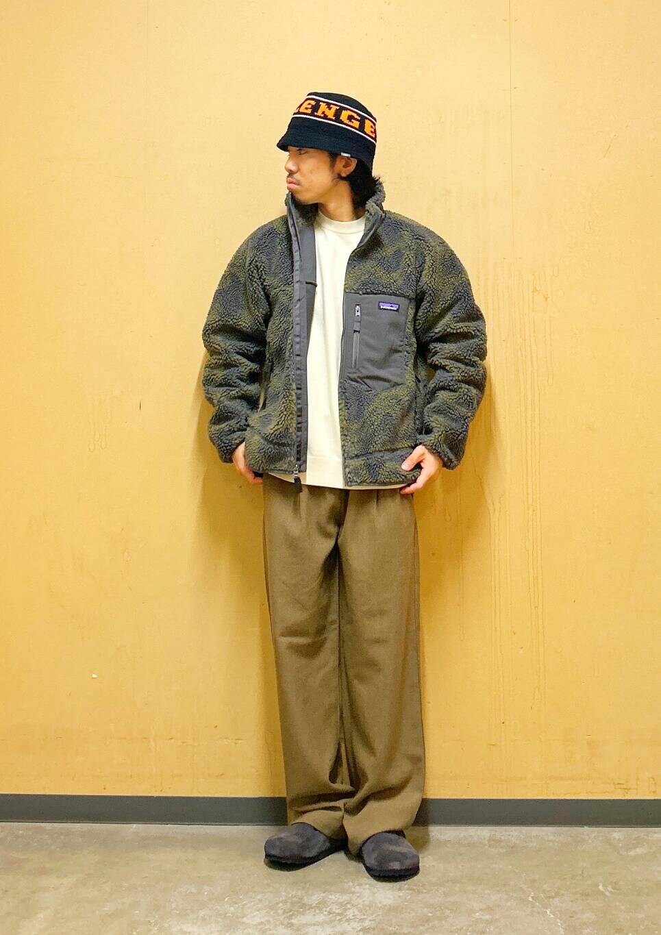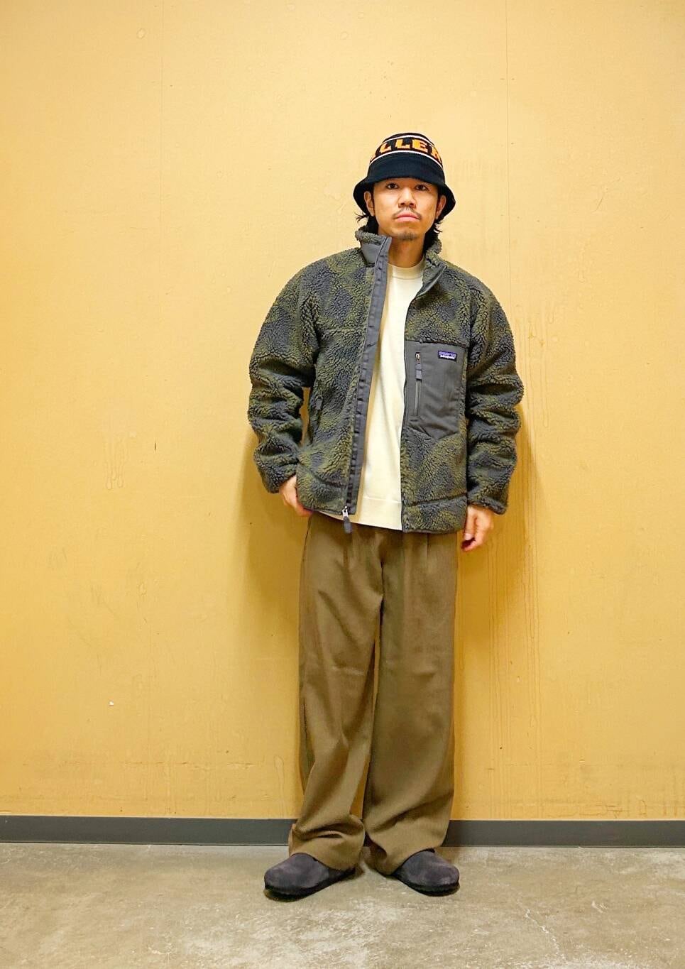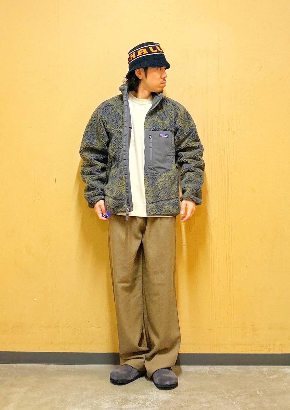 今回はpatagonia Ms Classic Retro-X JACKETとウールトラウザーを使用したコーディネート。 風が強く肌寒い天候に最適な、防風性を備えた温かく人気の高いジャケット。メッシュの裏打ちを施したポリエステル100%(リサイクル・ポリエステル85%)の6ミリ厚パイル・フリース素材を使用し、フェアトレード・サーティファイドの工場で製造
