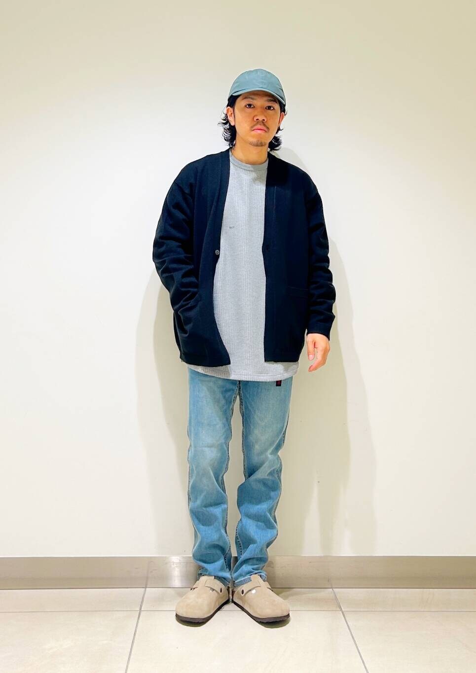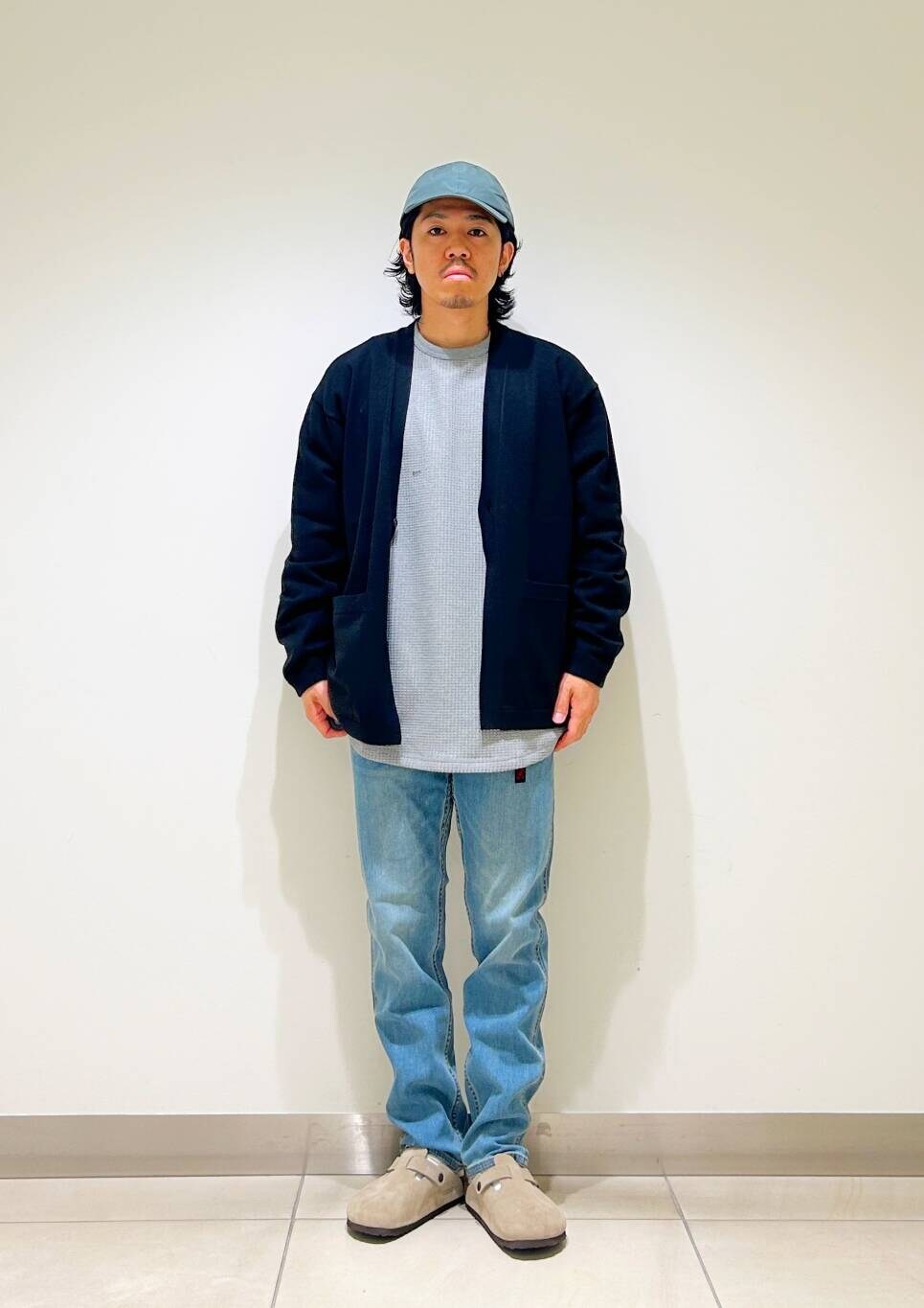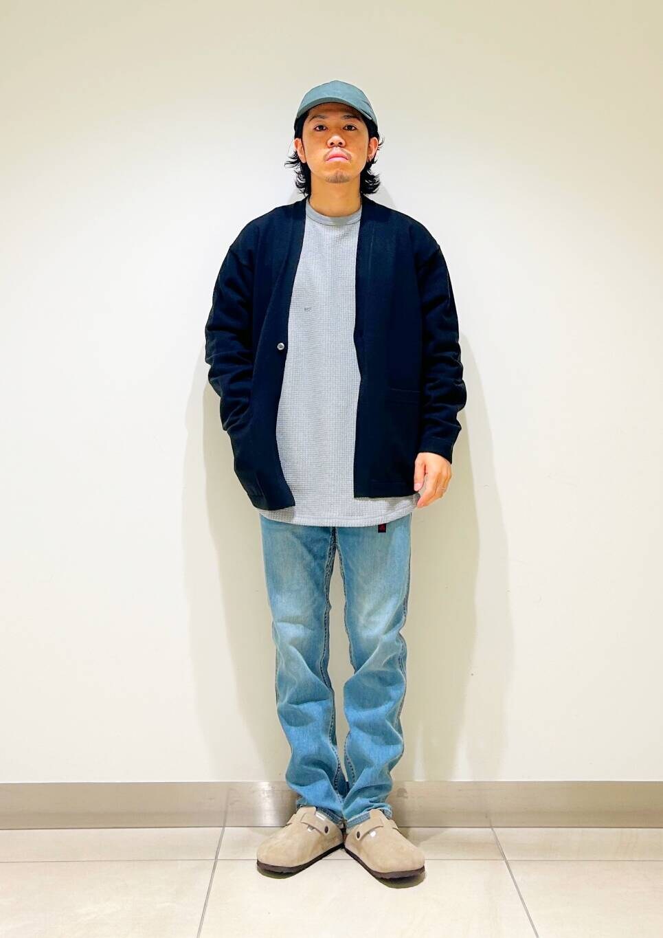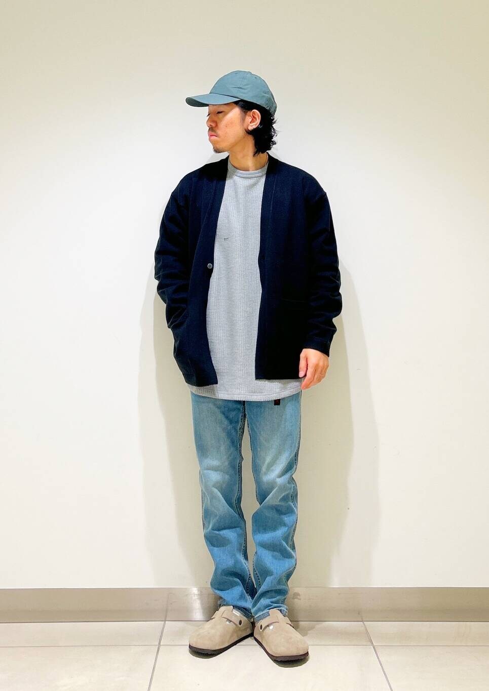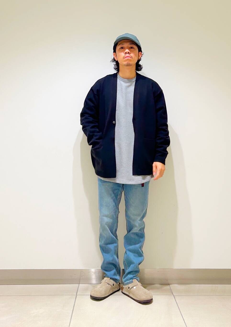 今回は200日ニット カーディガンとグラミチ別注デニムパンツを使用したコーディネート。