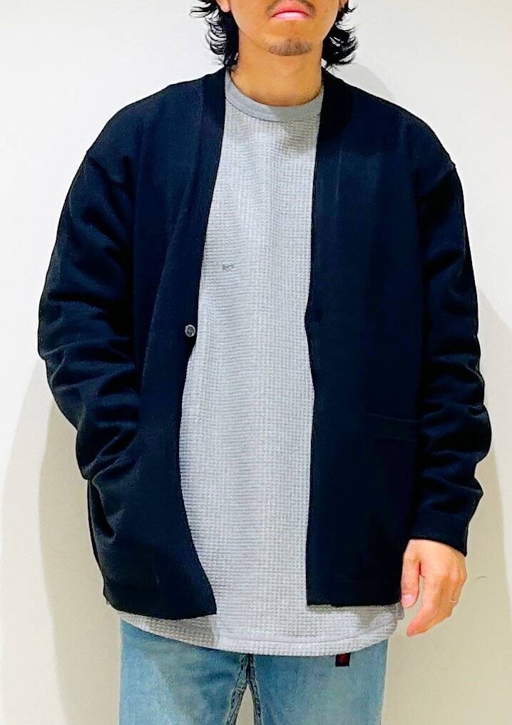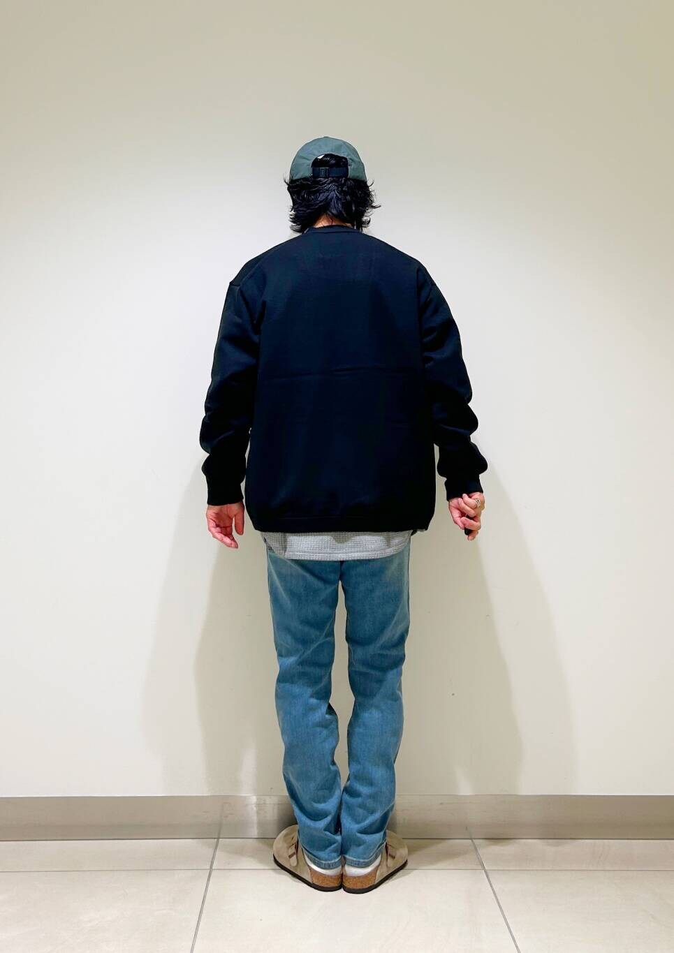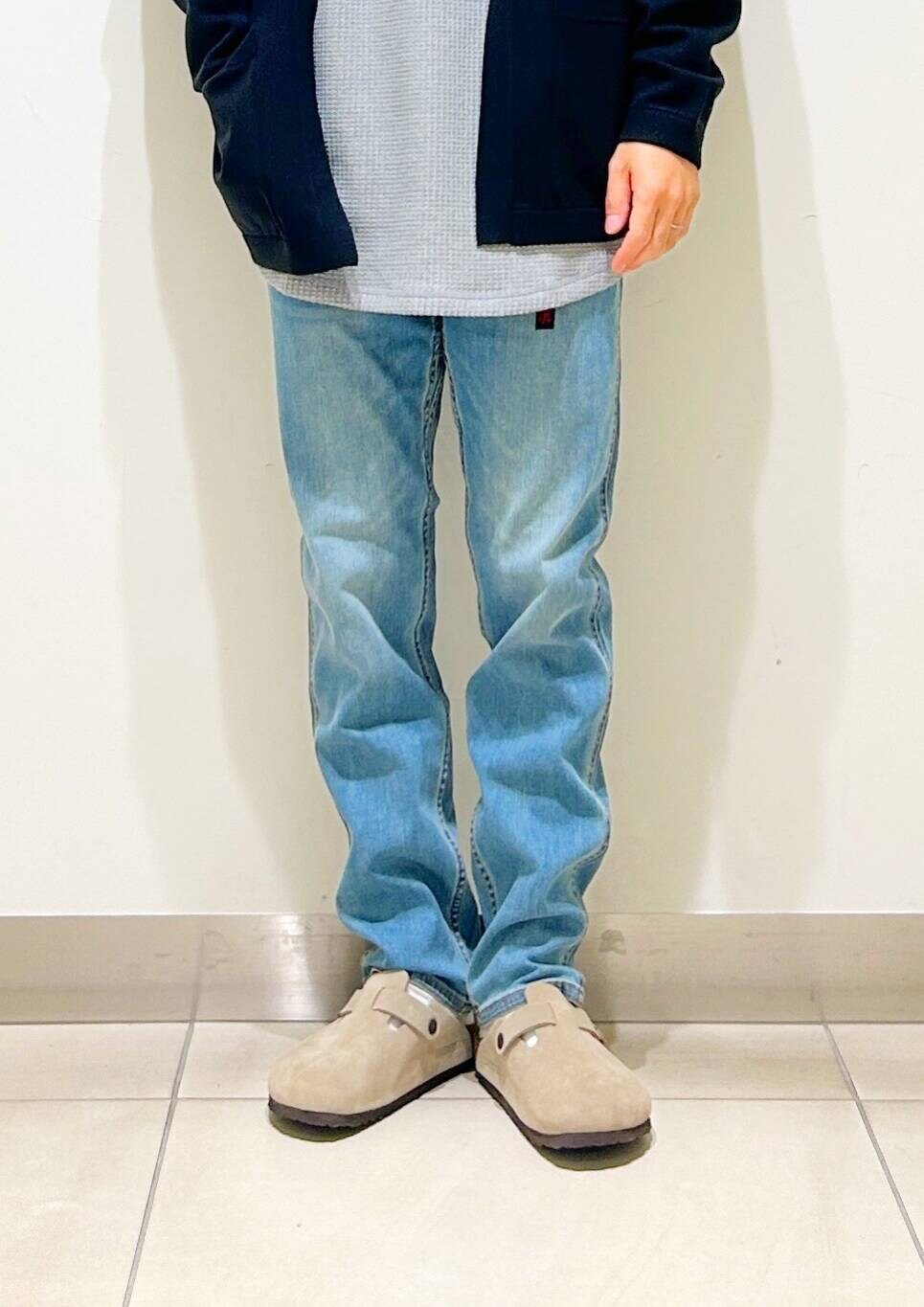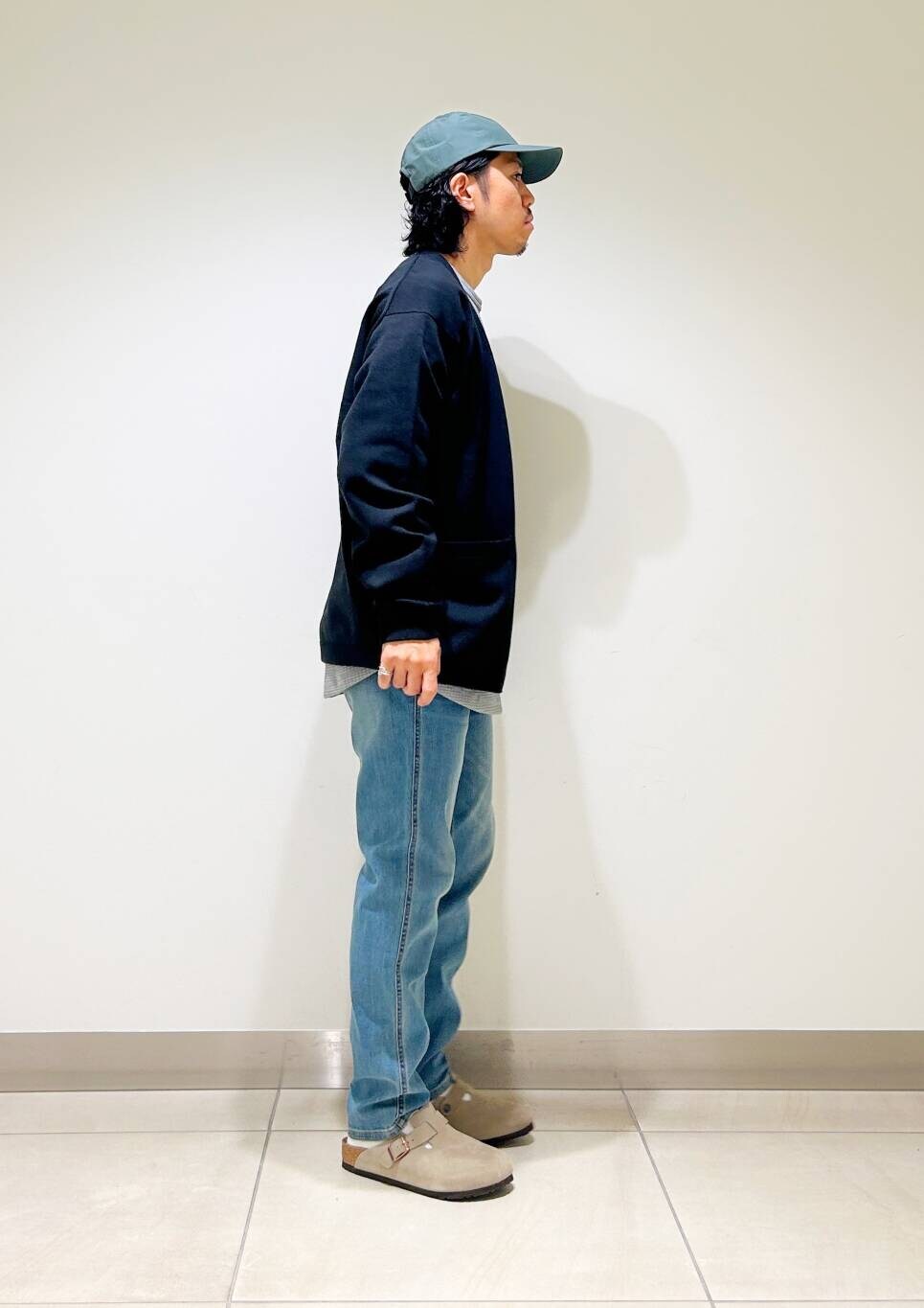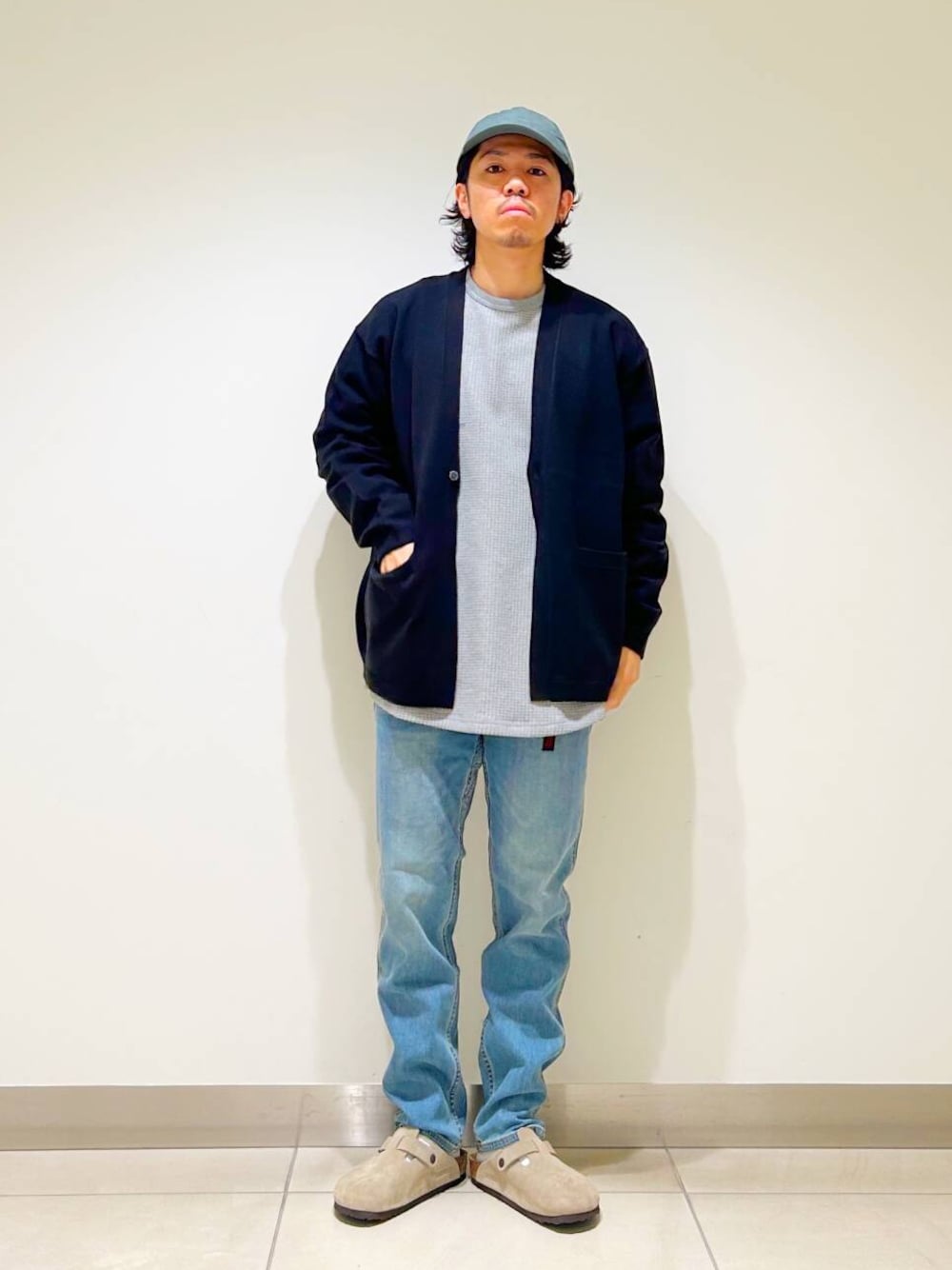 今回は200日ニット カーディガンとグラミチ別注デニムパンツを使用したコーディネート。