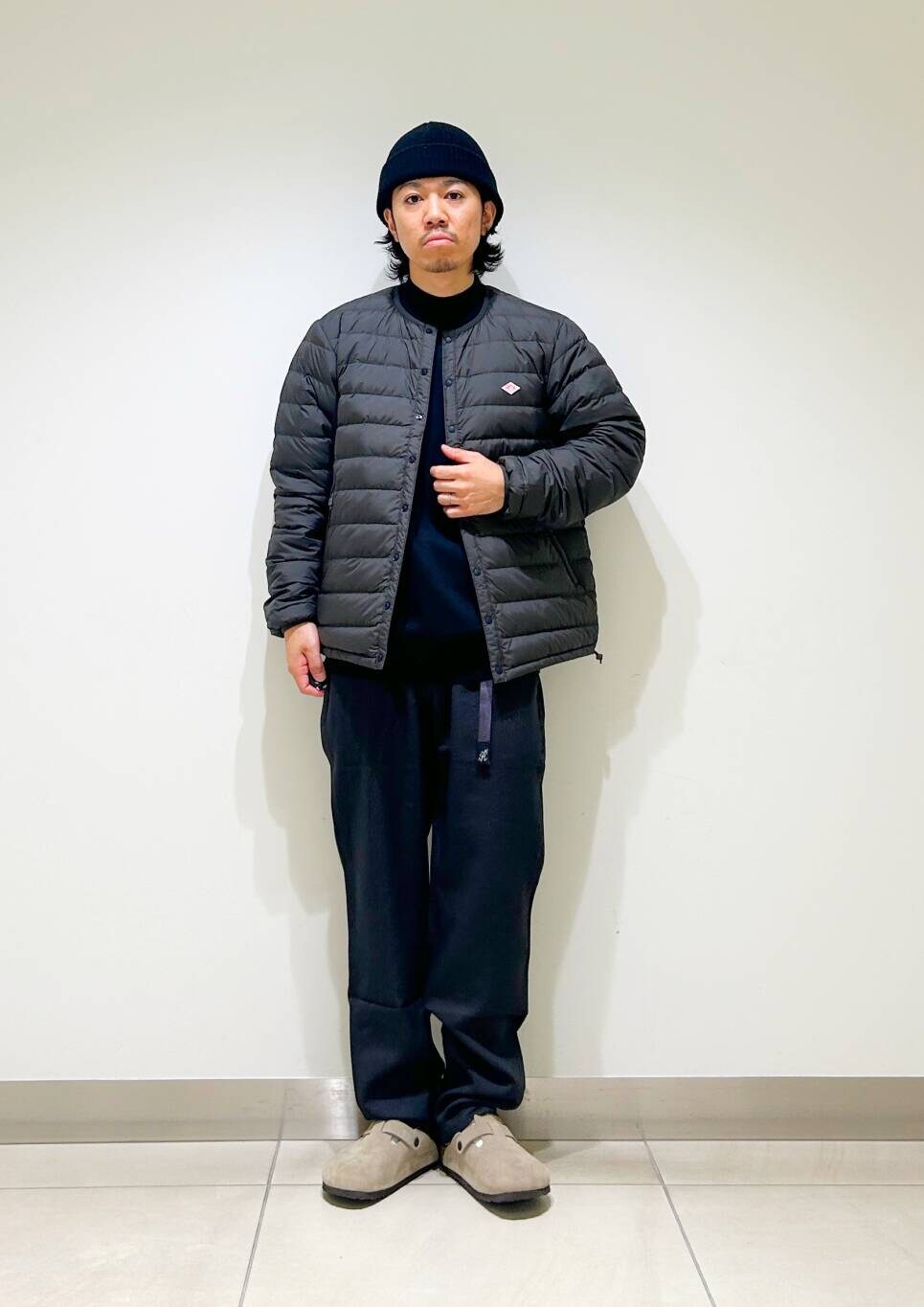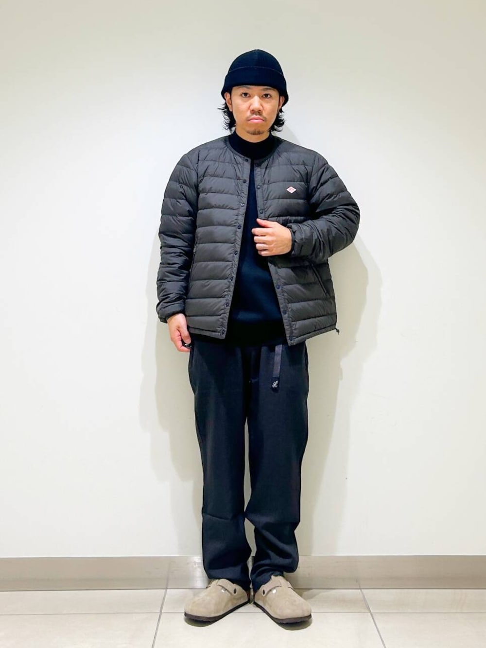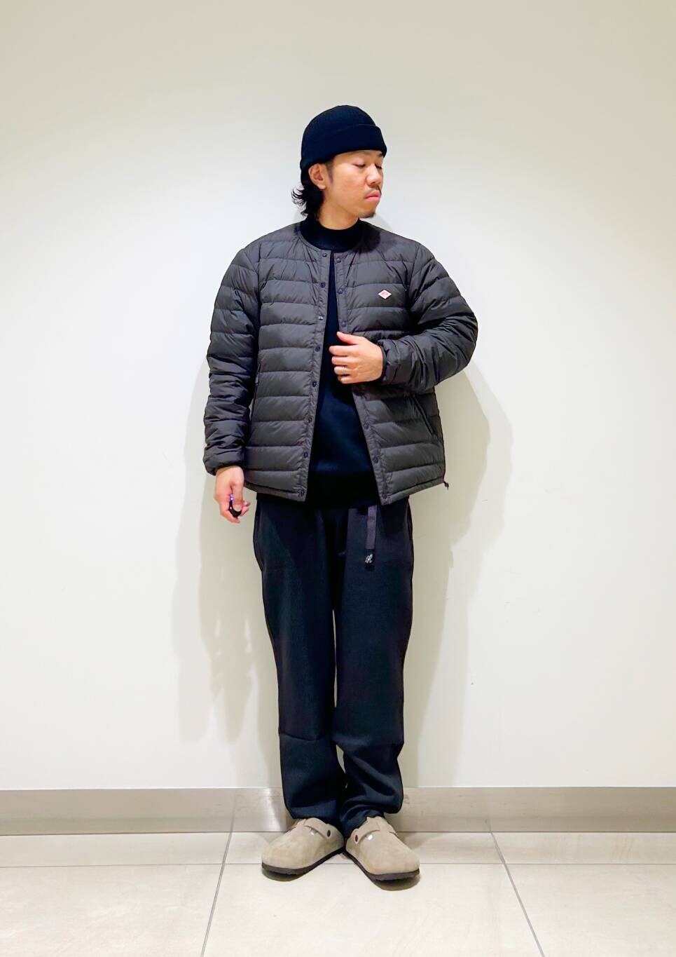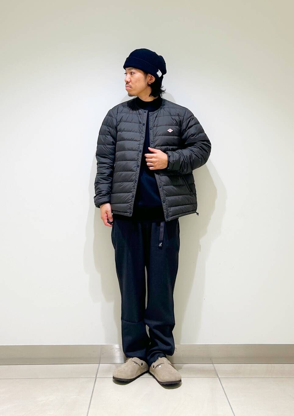 今回はDANTONインナーダウンと200日モックネックニットを使用したコーディネート。