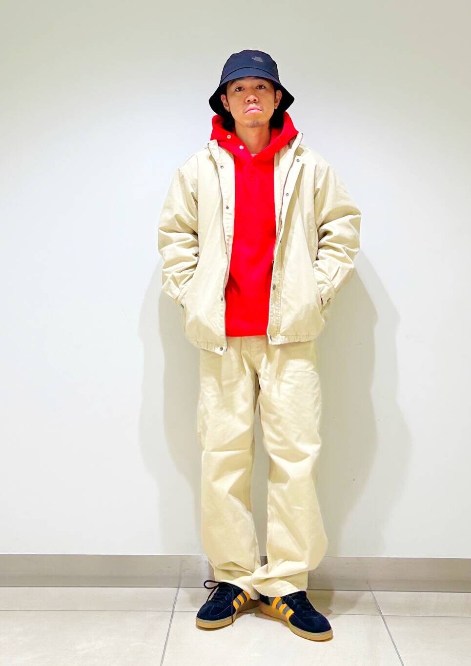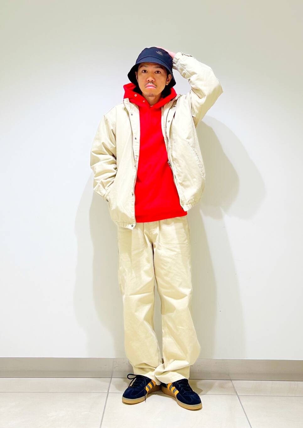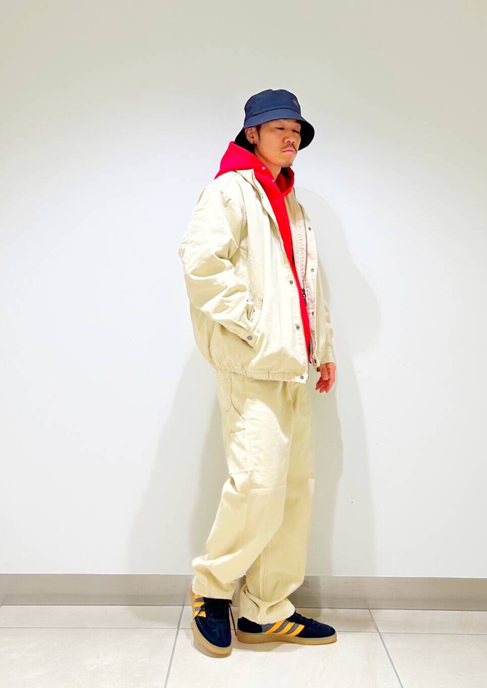 今回はダックセットアップとchampion別注リバースウィーブパーカーを使用したコーディネート。
