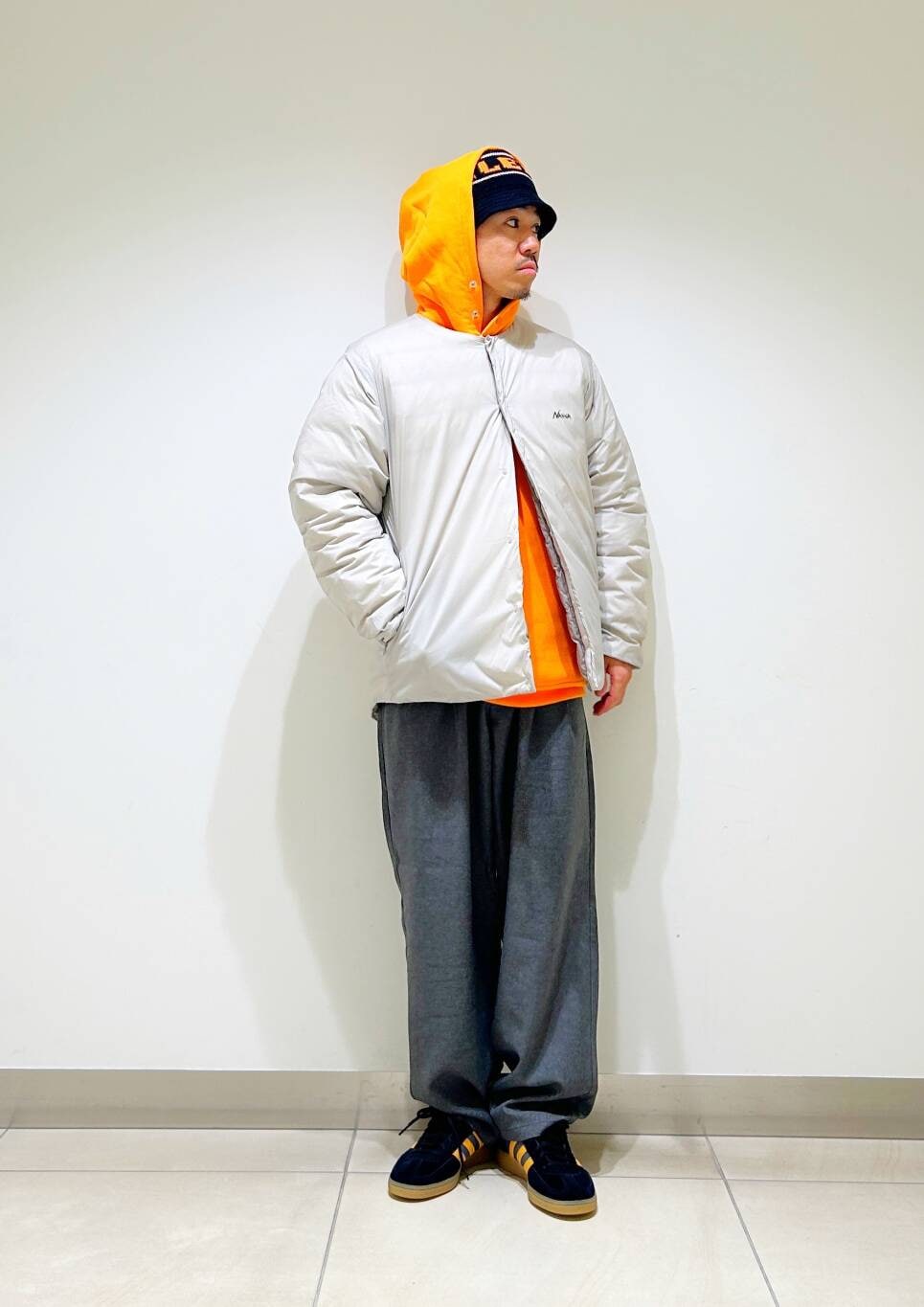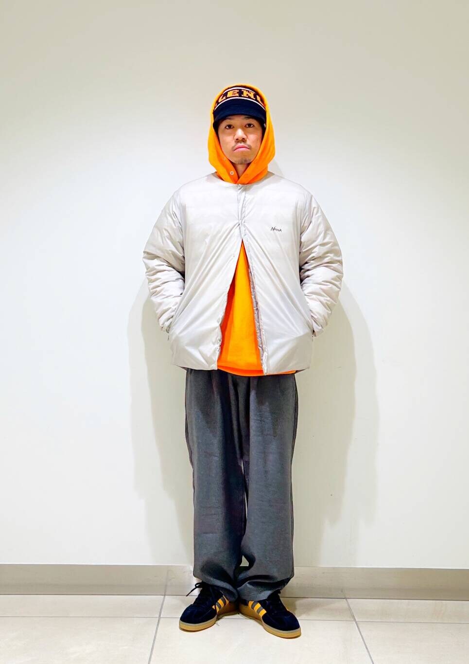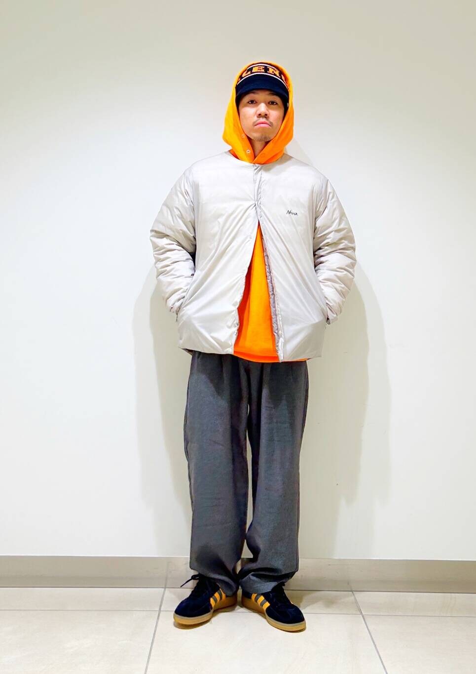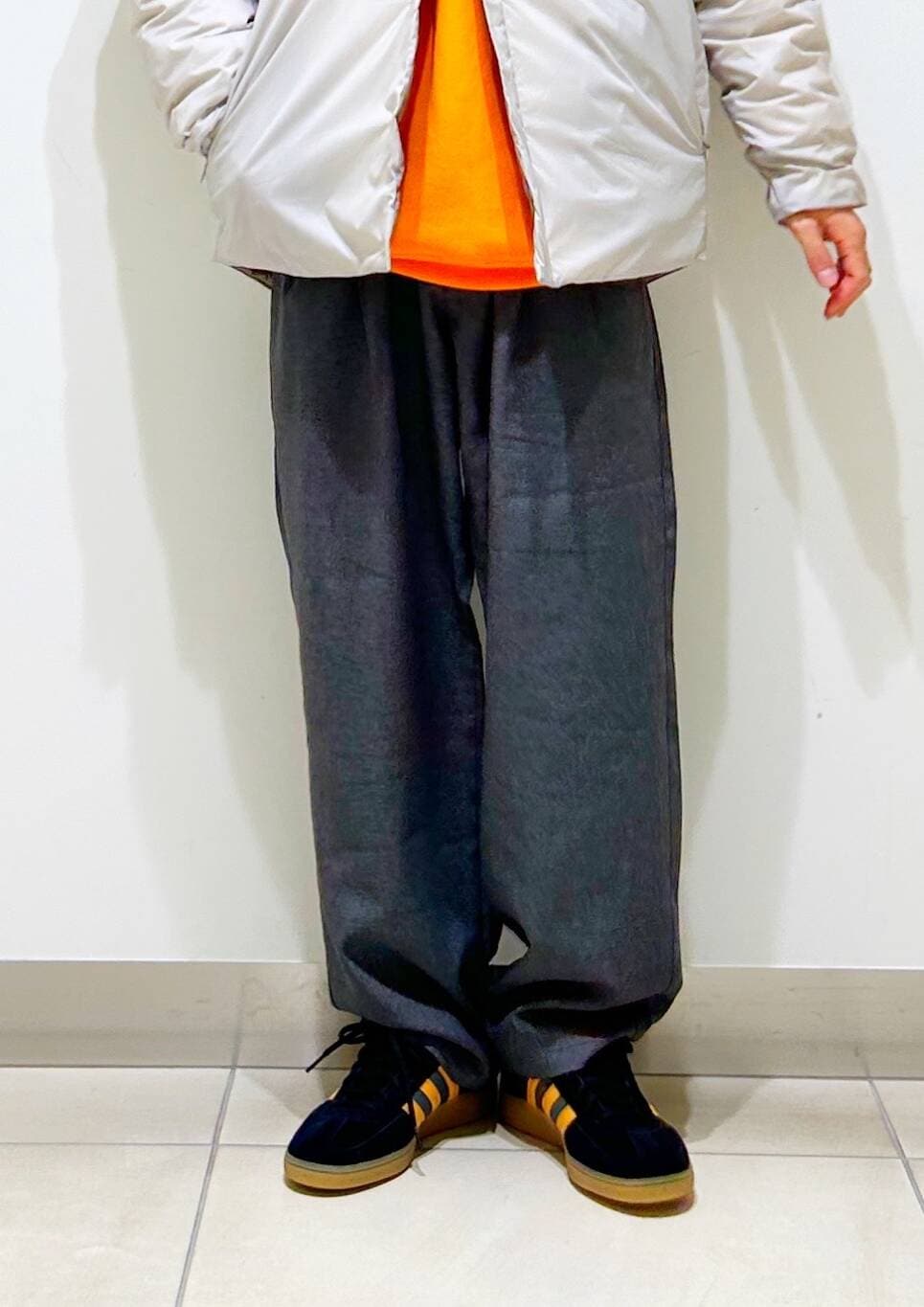 今回はnangaインナーダウンとツータックイージートラウザーを使用したコーディネート。