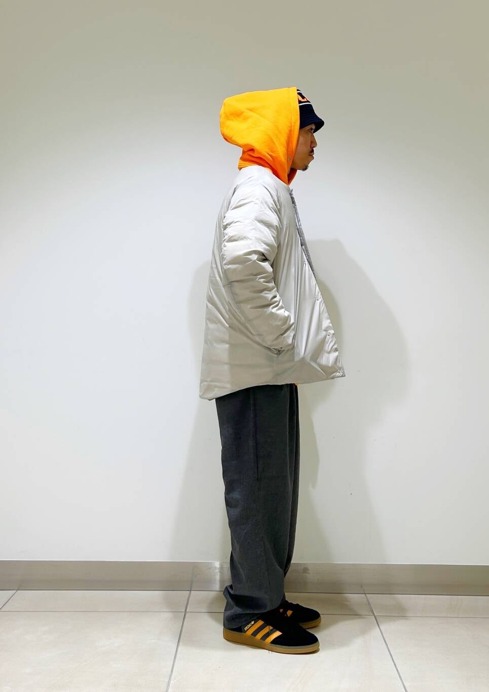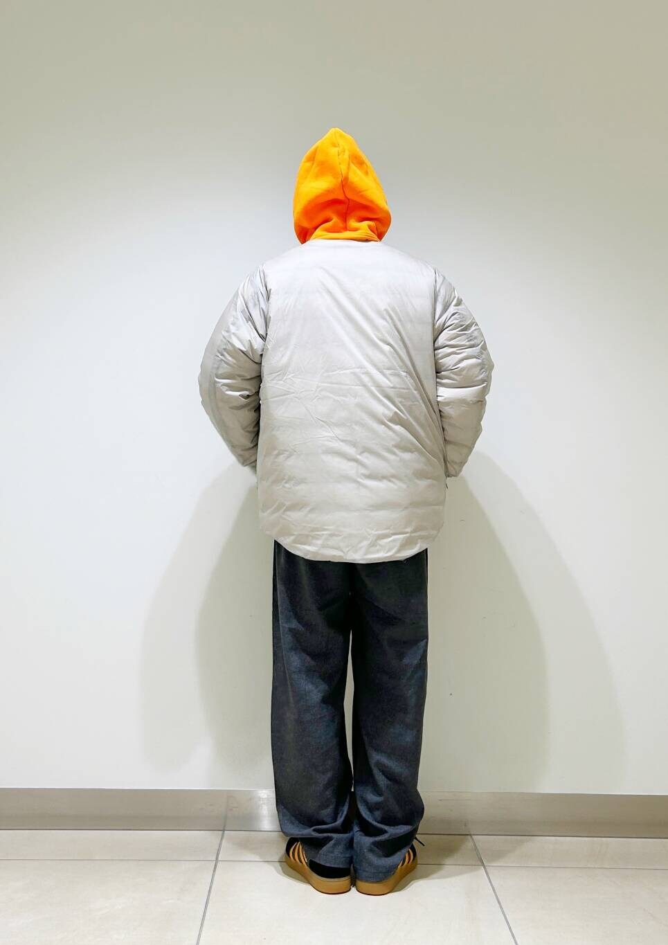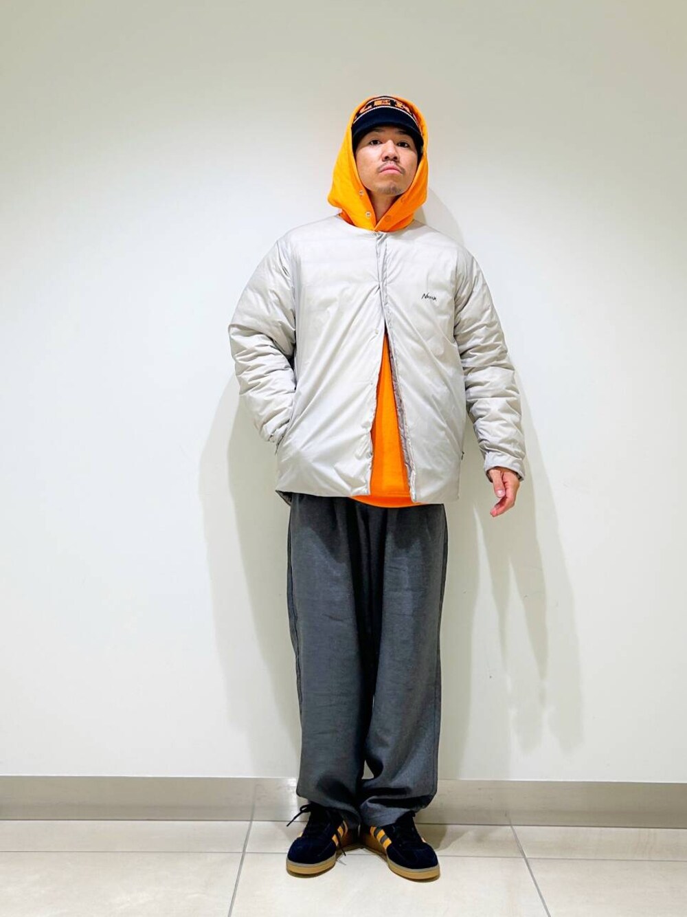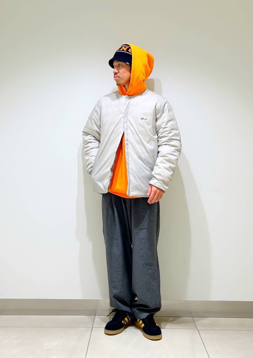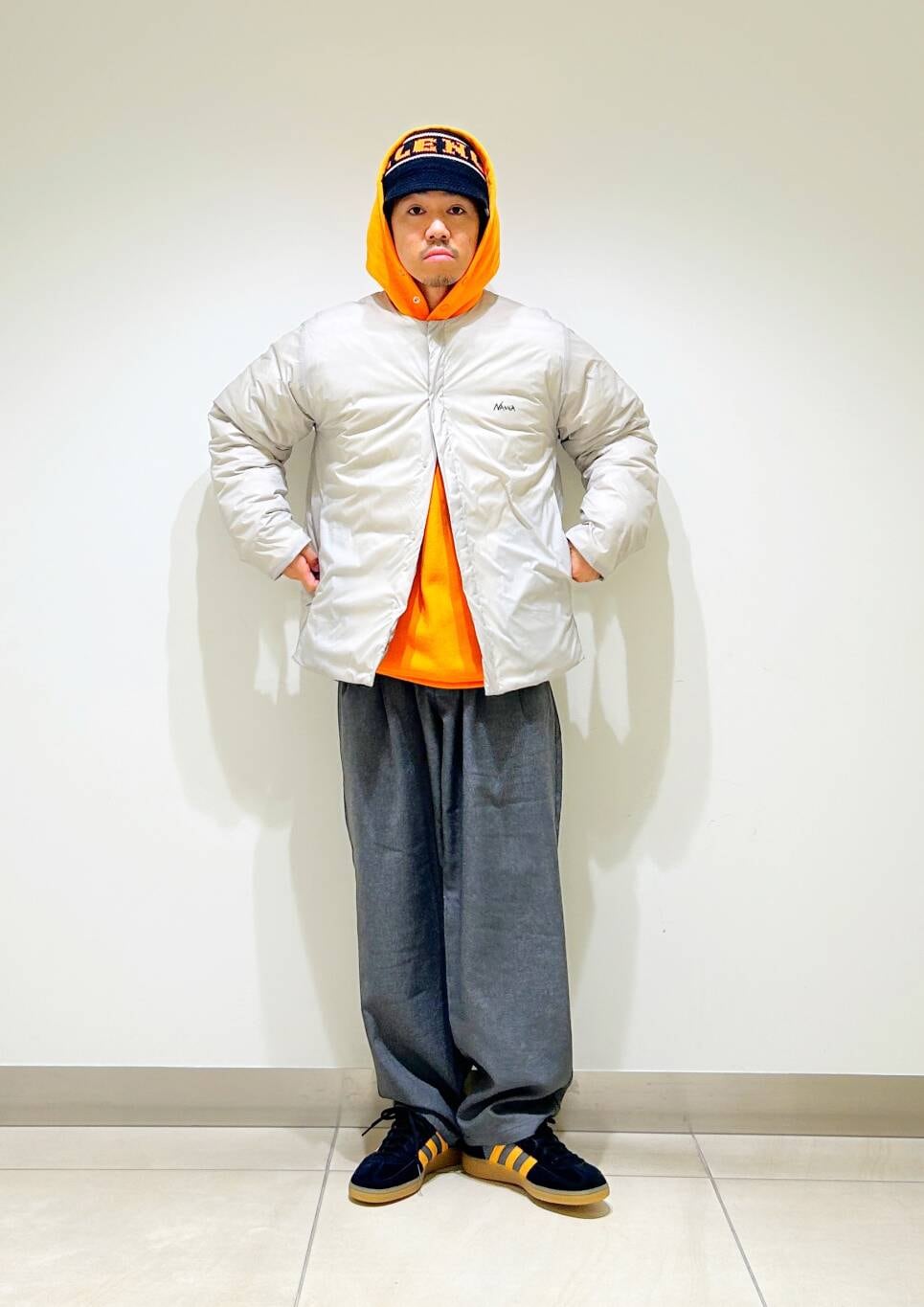 今回はnangaインナーダウンとツータックイージートラウザーを使用したコーディネート。