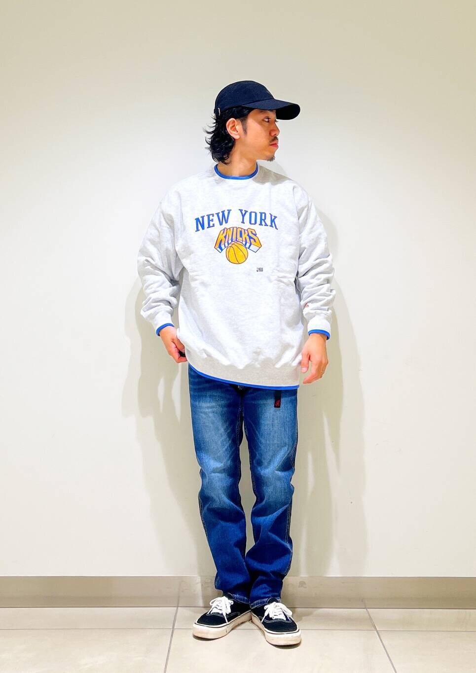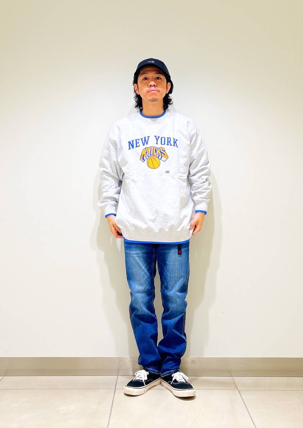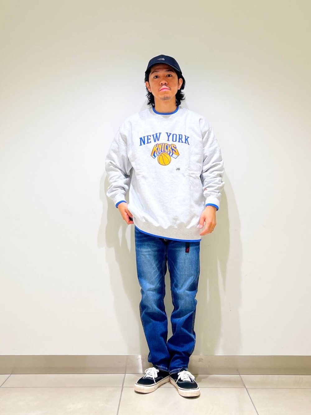 今回はNBAスウェットとグラミチ別注デニムパンツを使用したコーディネート。