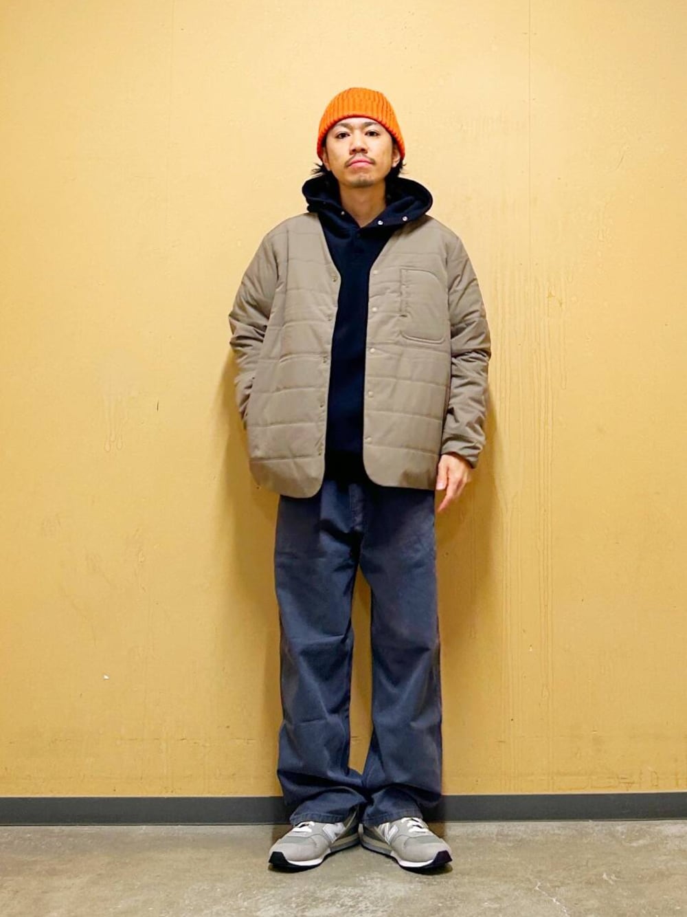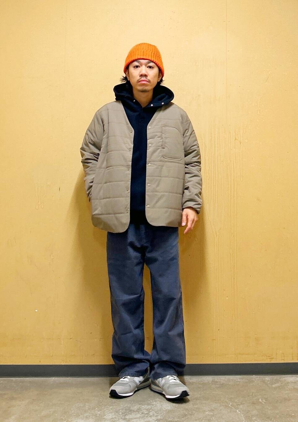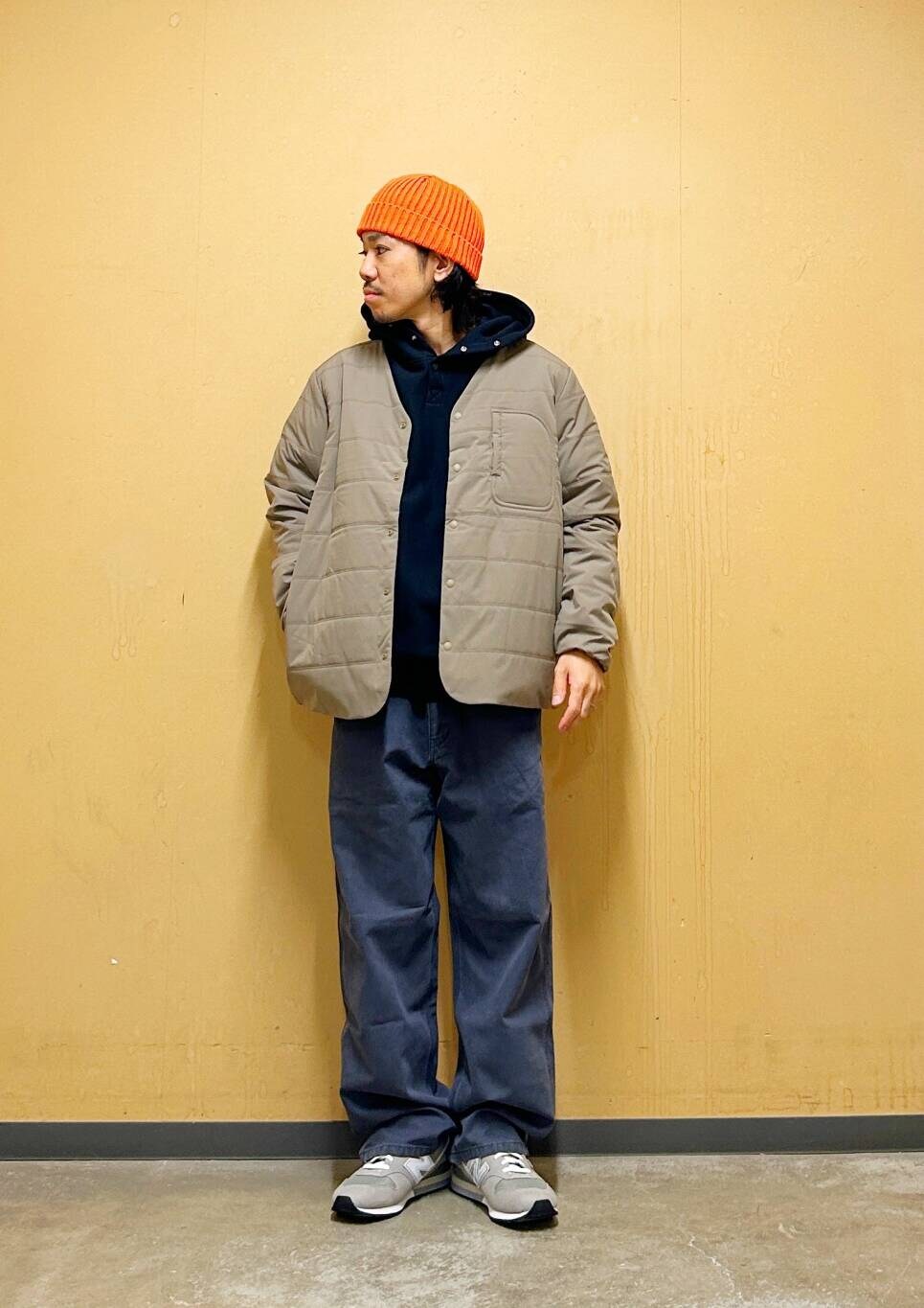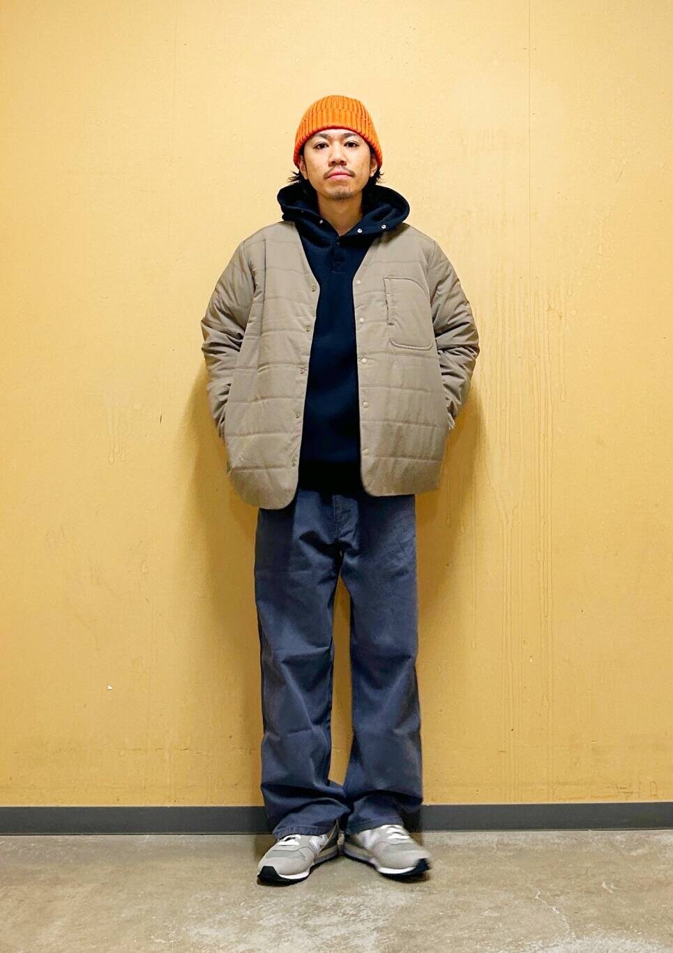 今回はSnow Peak Apparel Flexible Insulated Cardiganとダックストレートパンツを使用したコーディネート。