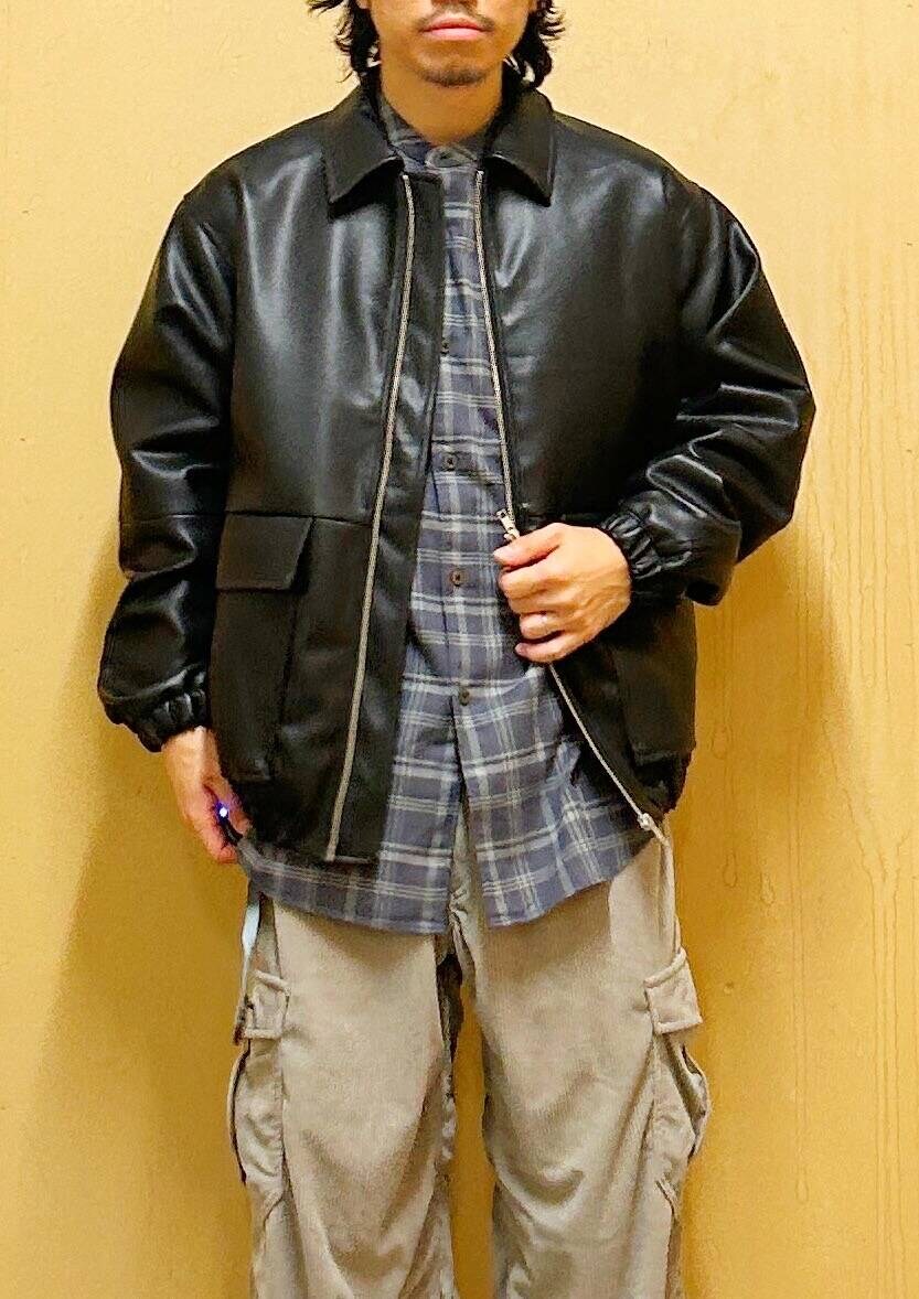 ラムレザー風のフェイクレザーを使用しており、程よい光沢感と肉厚に加え、柔らかな着心地が魅力の一着。