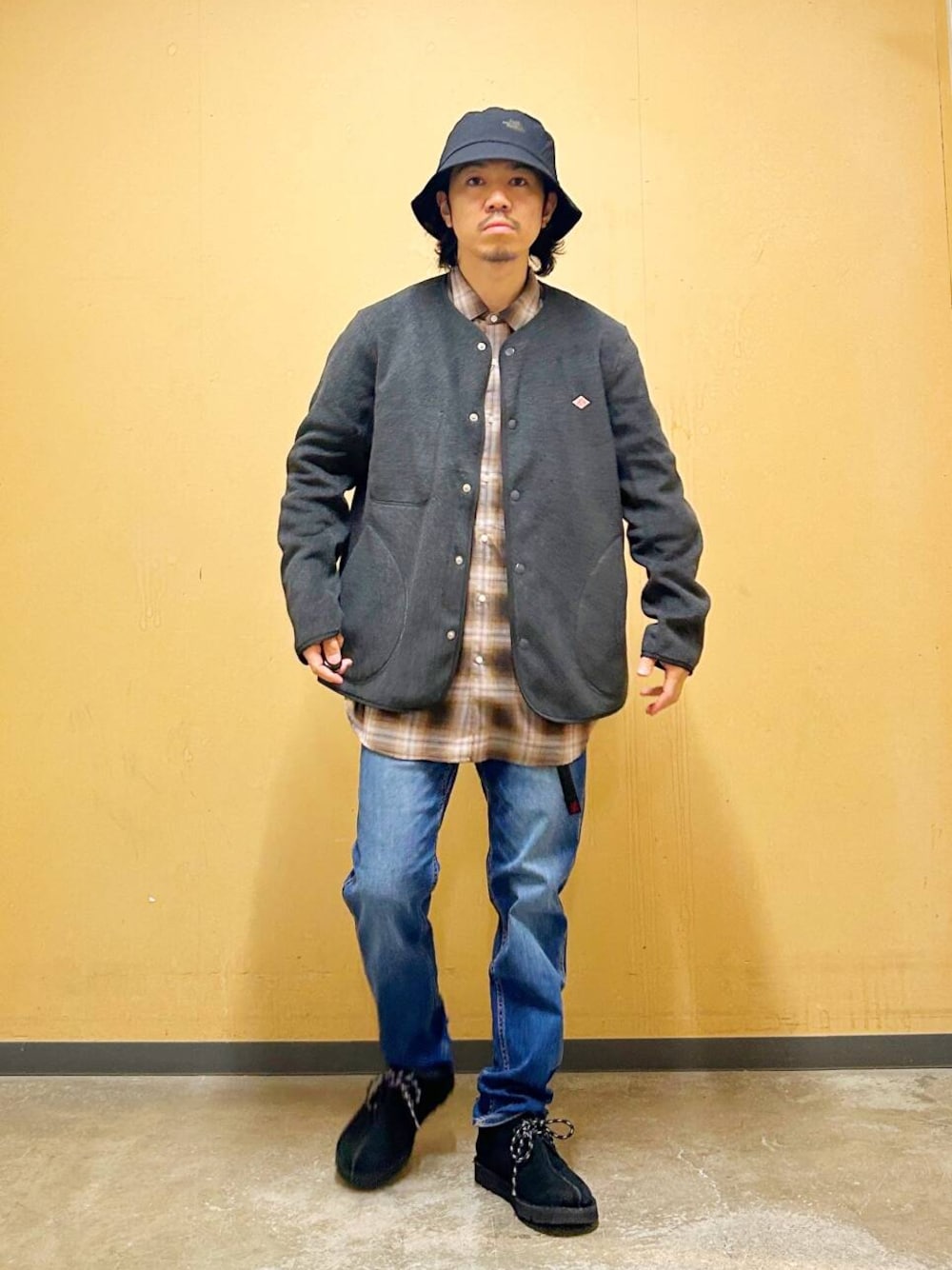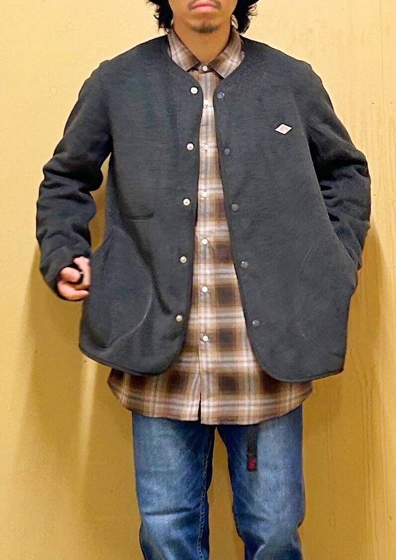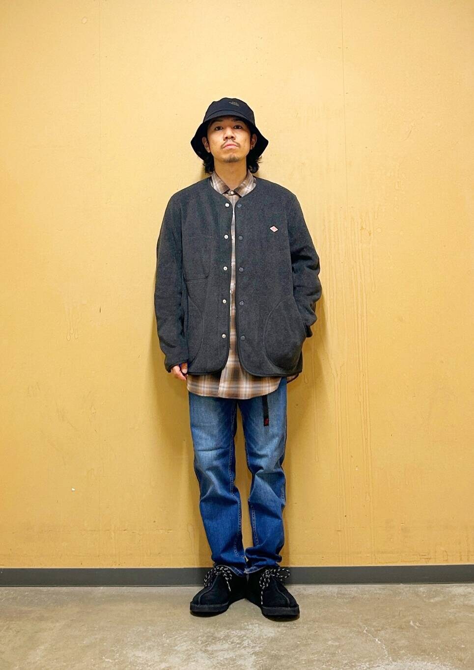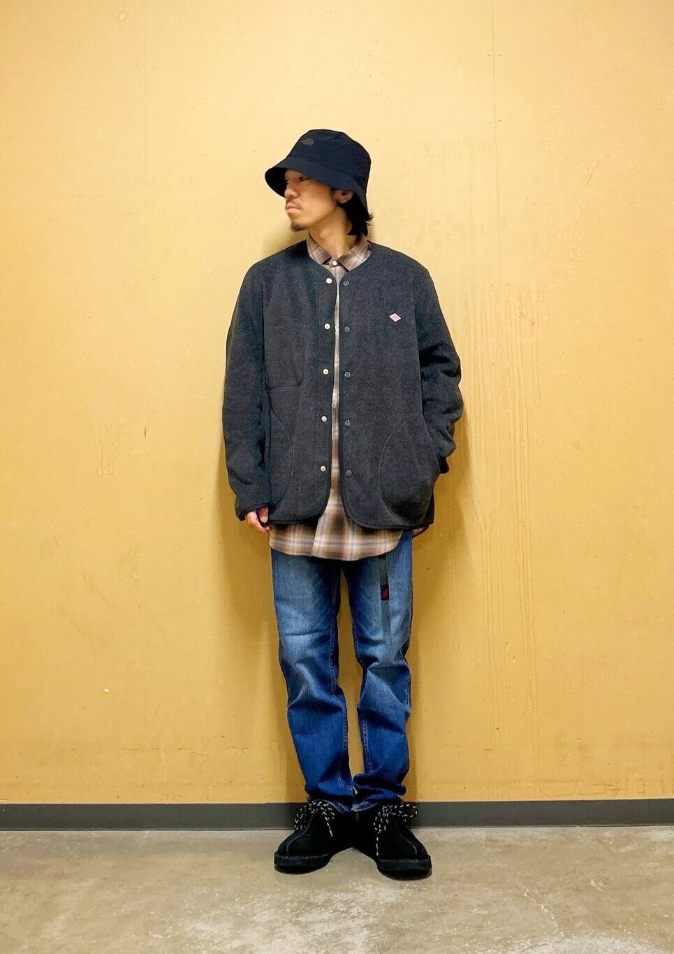 今回はDANTONフリースカーディガンとチェックシャツを使用したコーディネート。