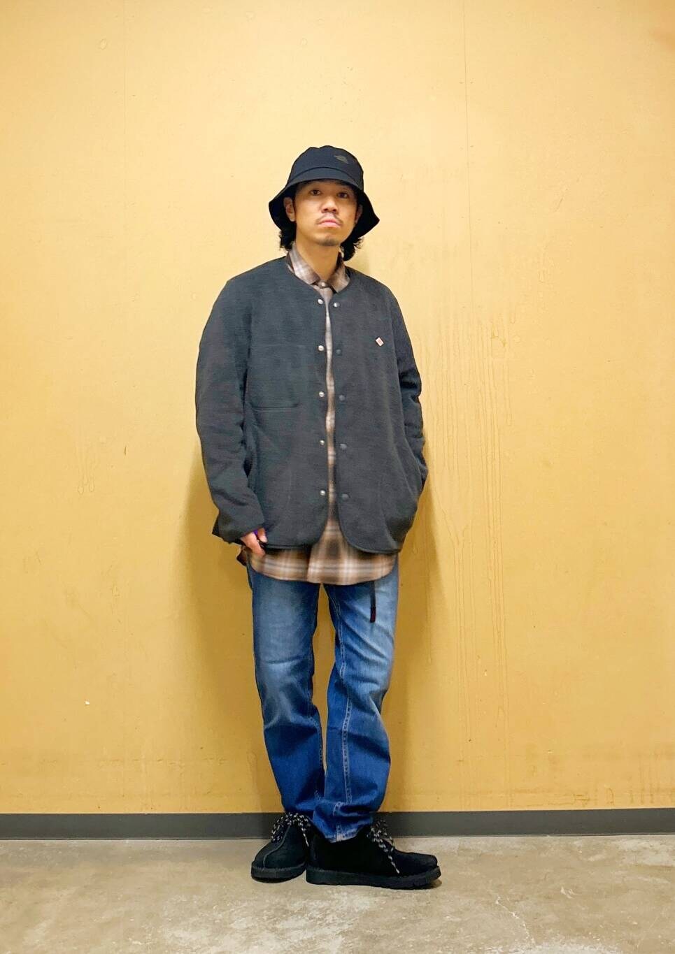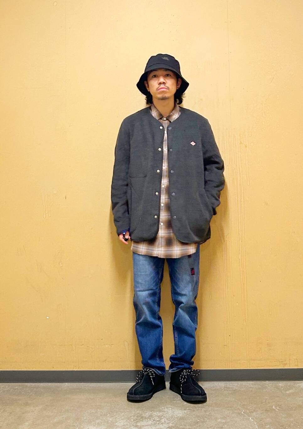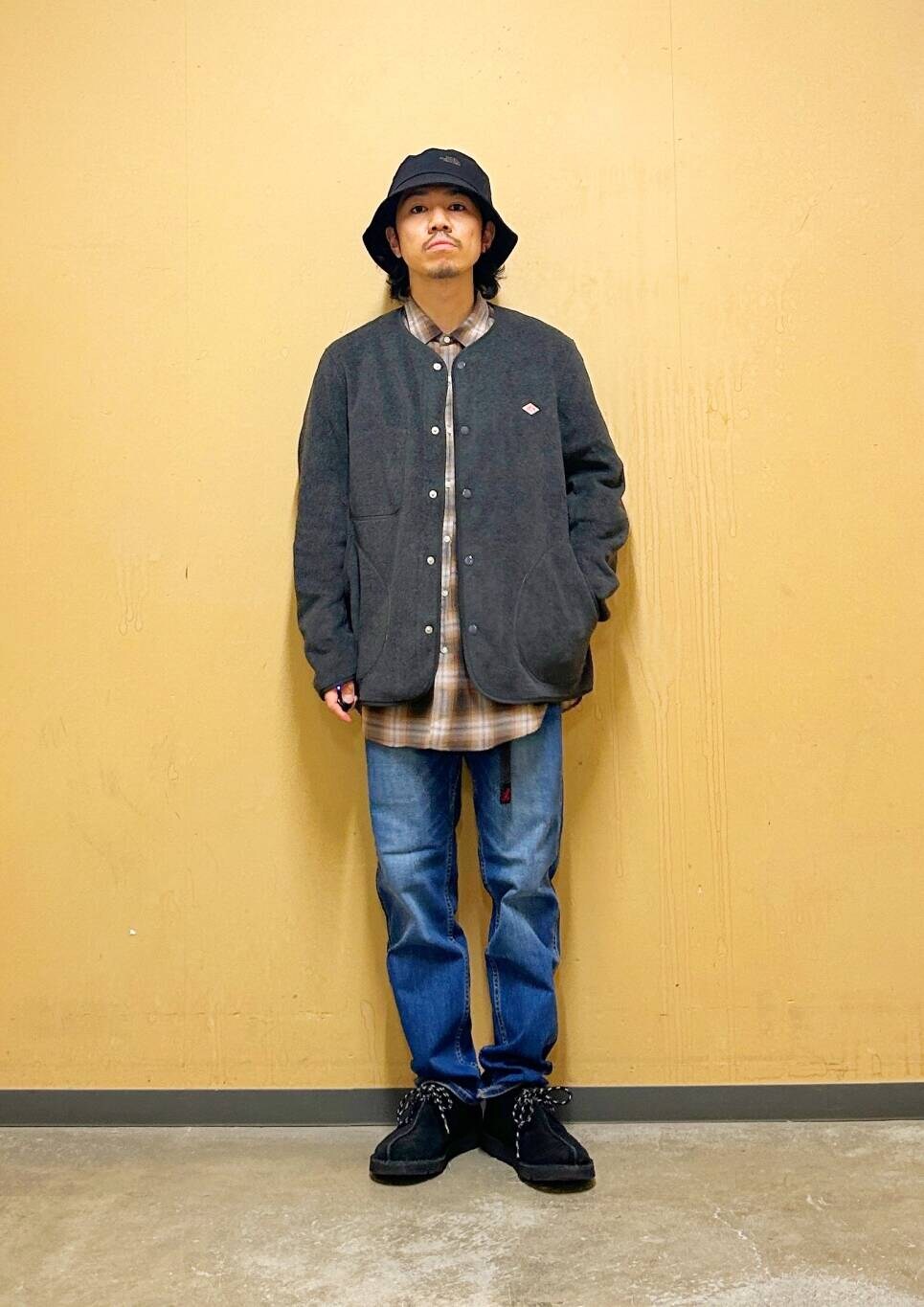 今回はDANTONフリースカーディガンとチェックシャツを使用したコーディネート。