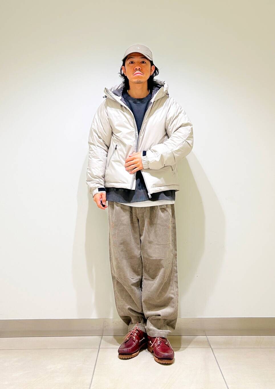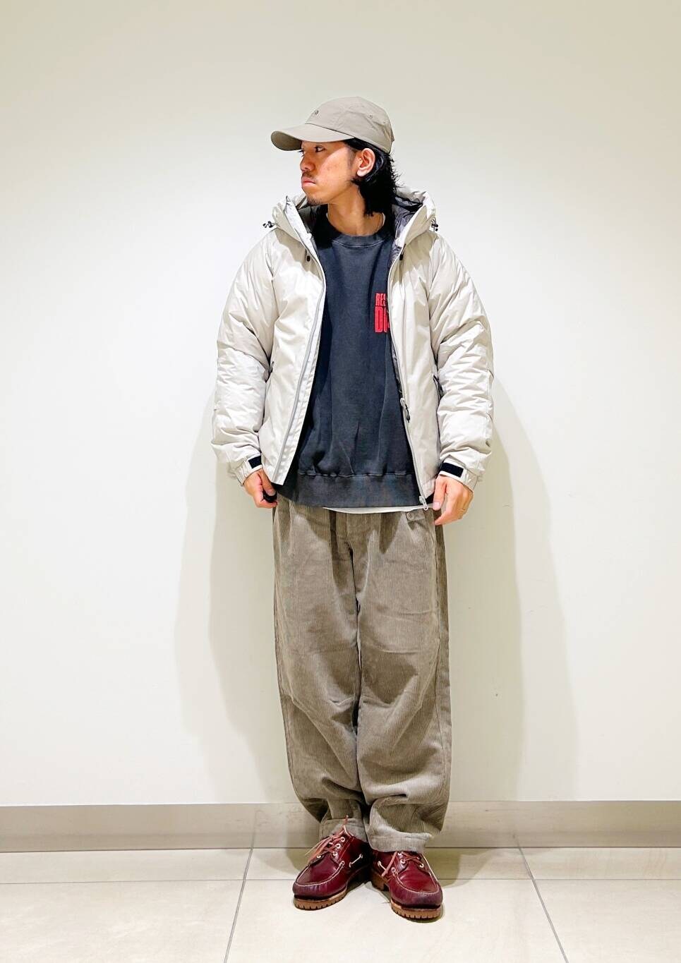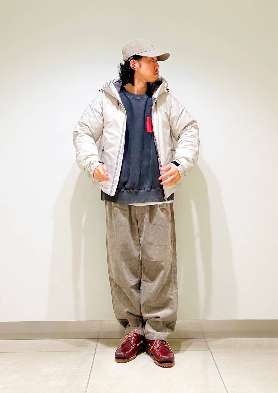 今回はnangaダウンブルゾンとコーデュロイトラウザーを使用したコーディネート。