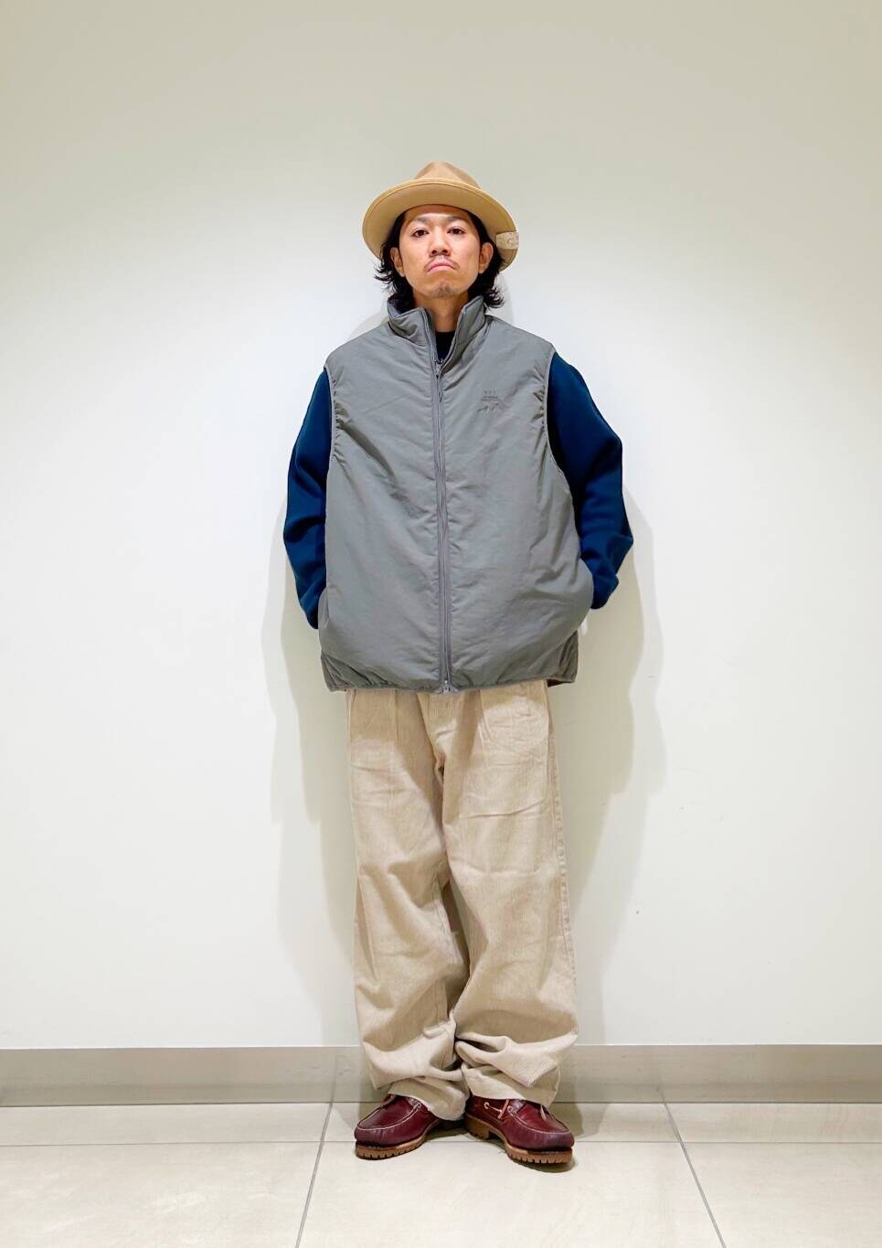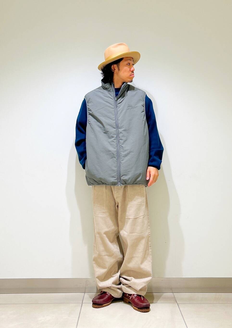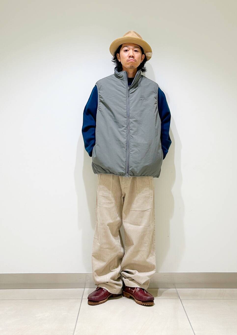 今回はurdベストとコーデュロイトラウザーを使用したコーディネート。