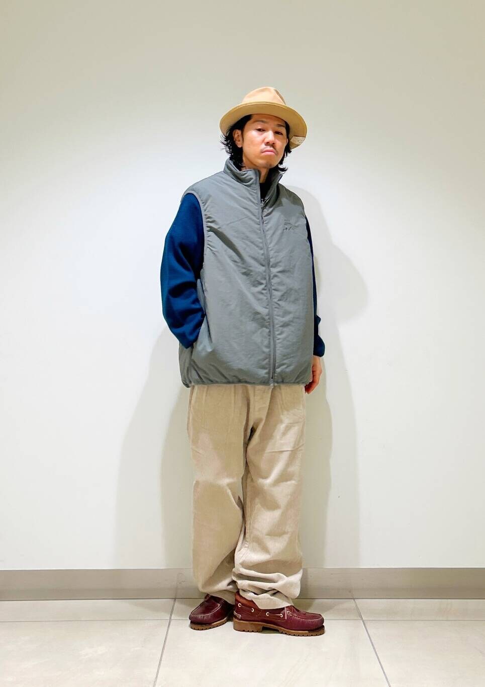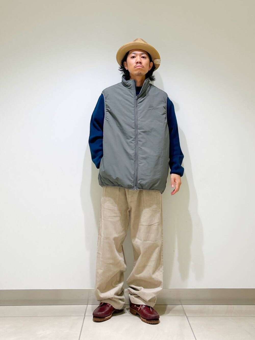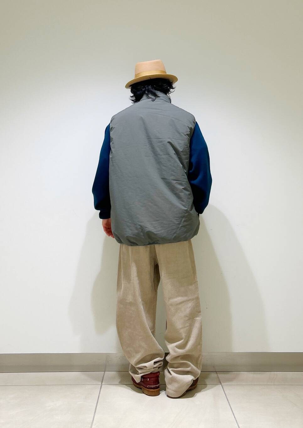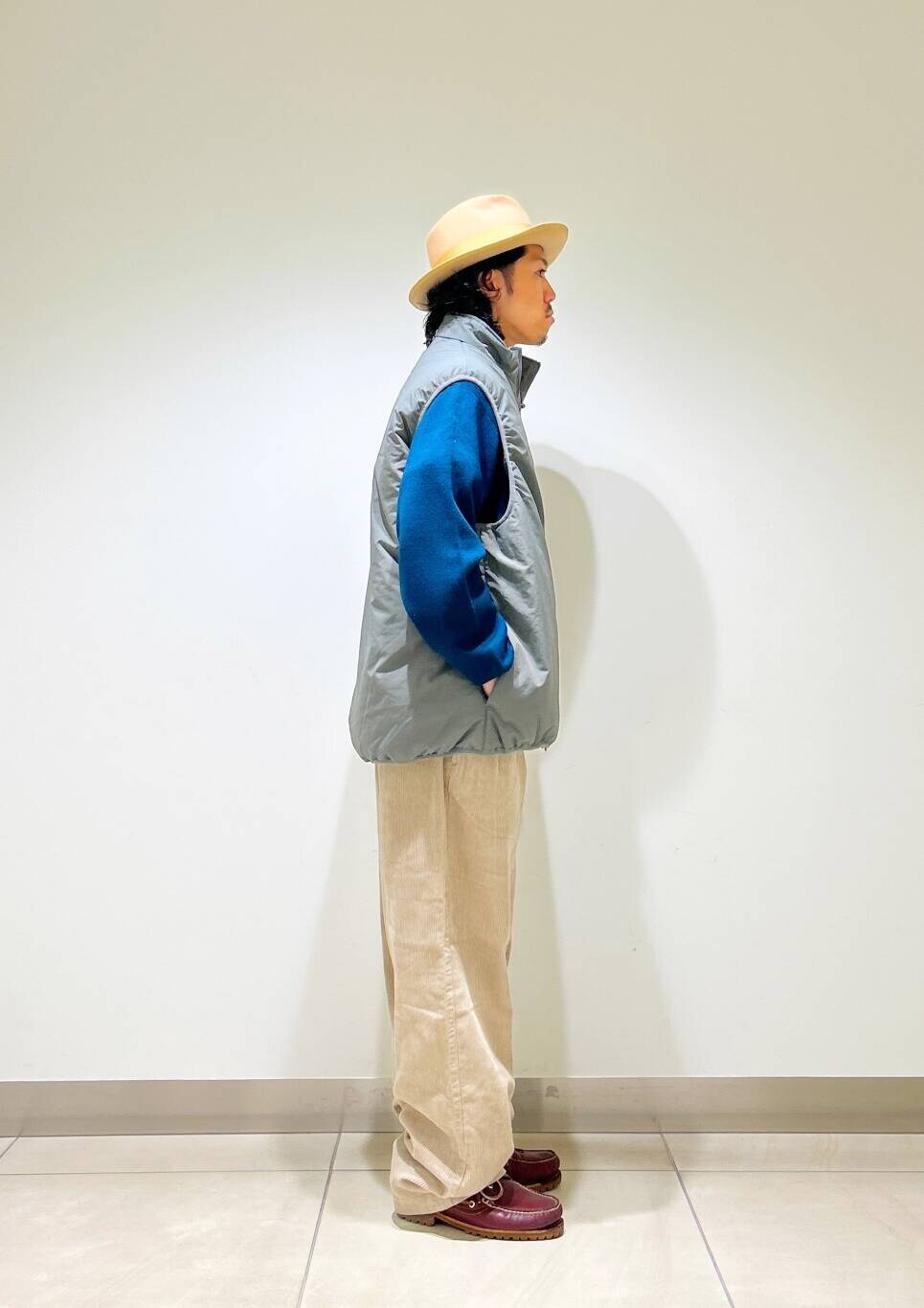 今回はurdベストとコーデュロイトラウザーを使用したコーディネート。