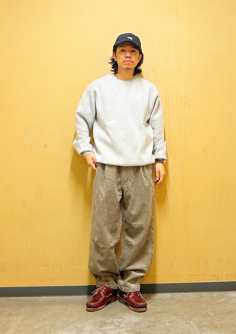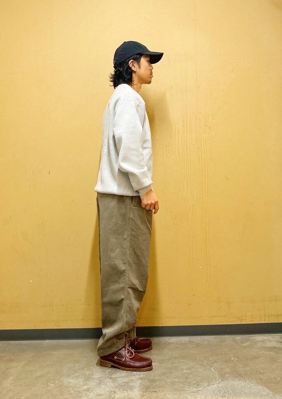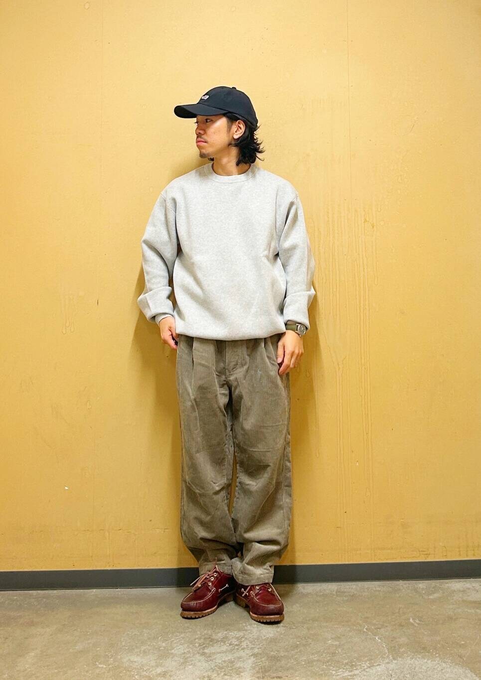 今回はミラノリブクルーネックニットとコーデュロイトラウザーを使用したコーディネート。