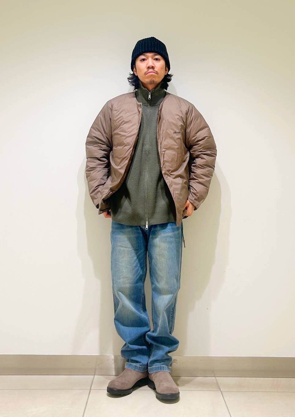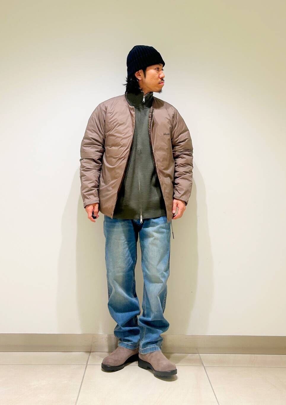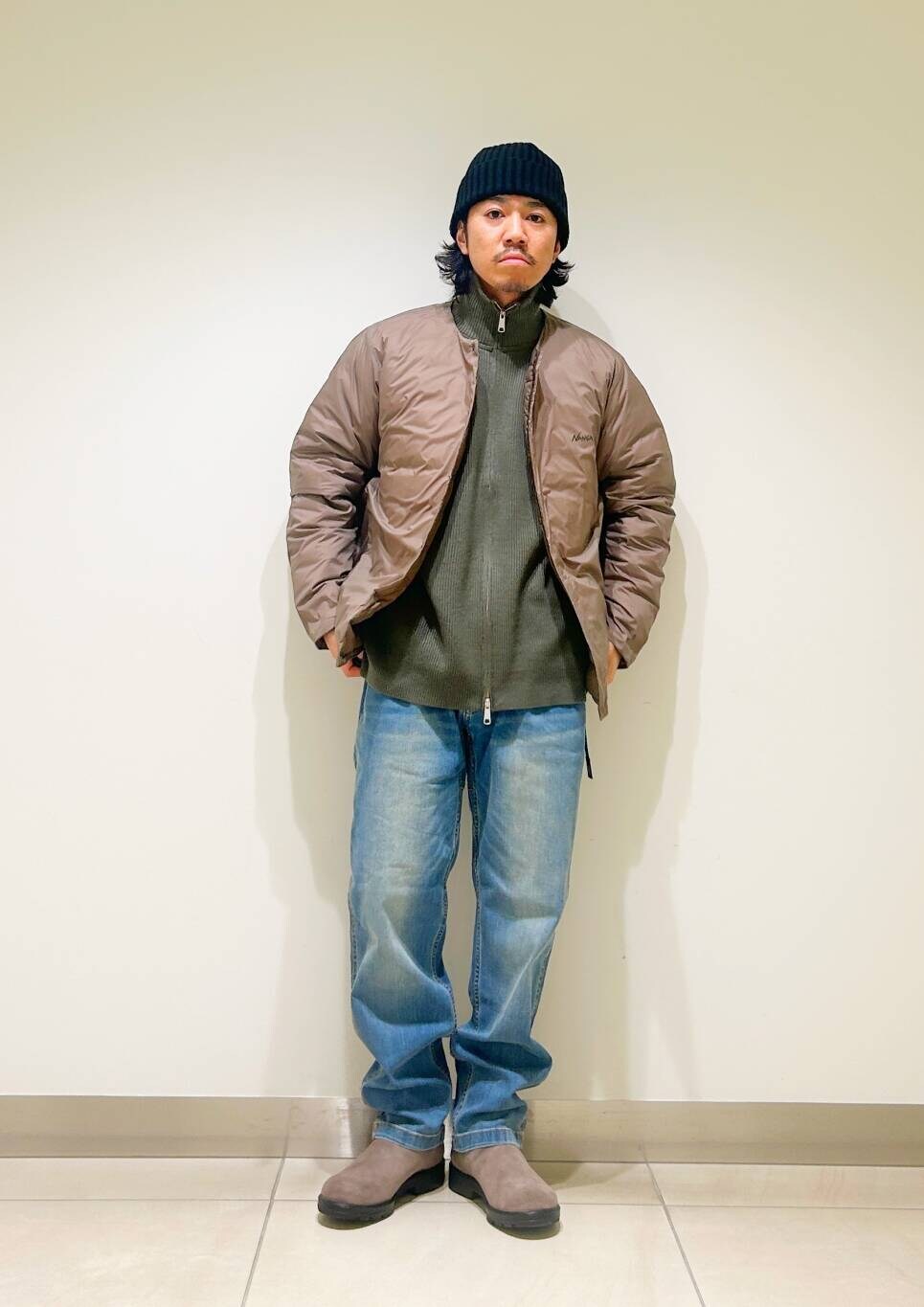 今回はnangaインナーダウンとグラミチ別注デニムパンツを使用したコーディネート。