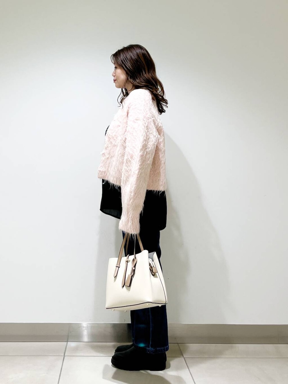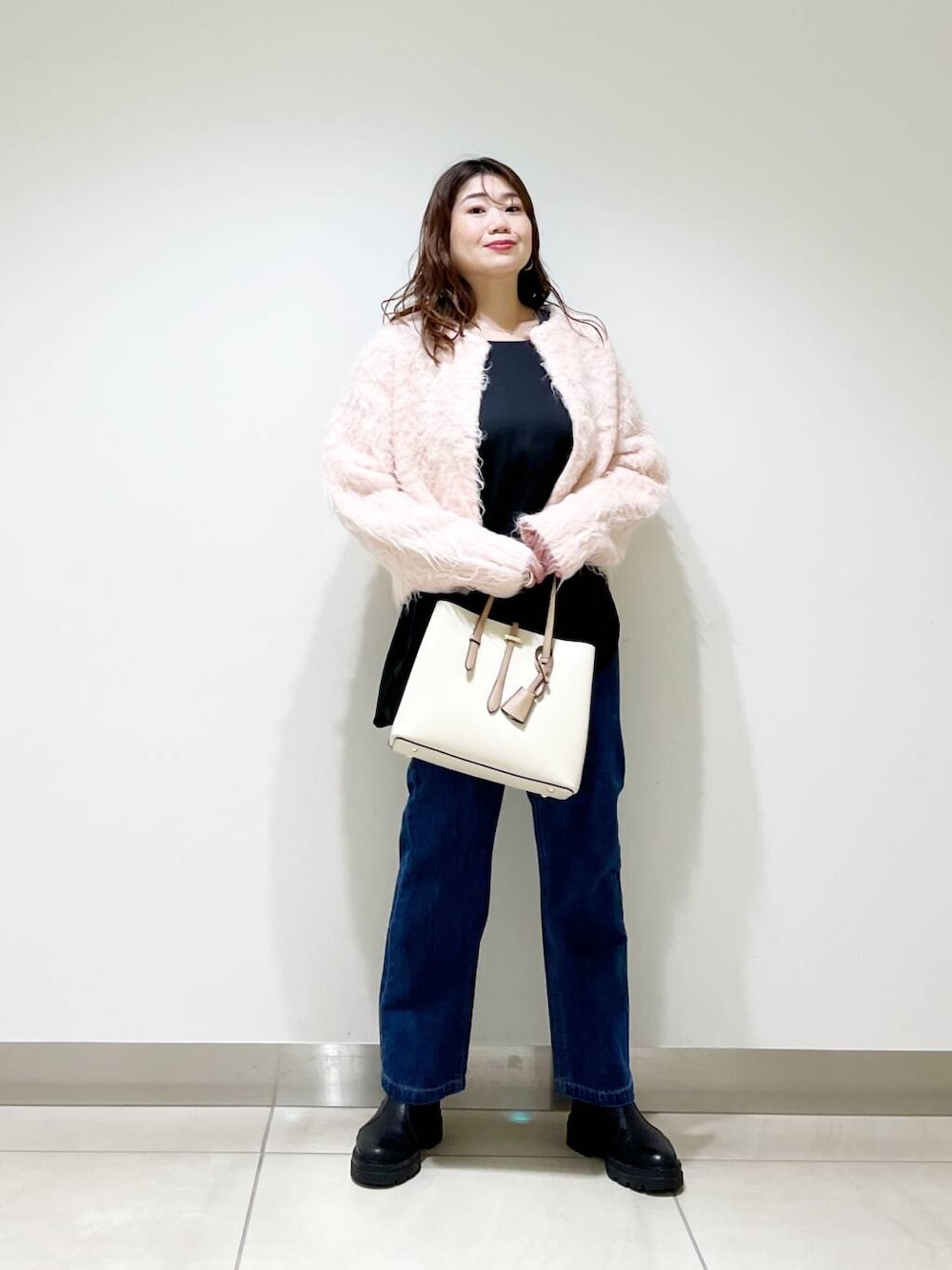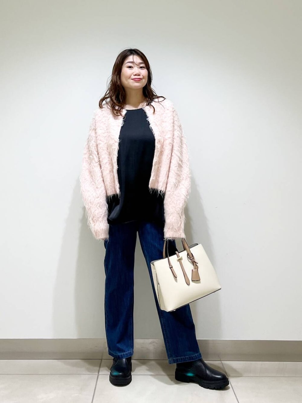 ブラックのシャツを組み合わせることで柔らかい印象のピンクカーディガンも甘くなりすぎず、着れます☆