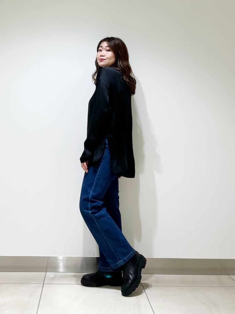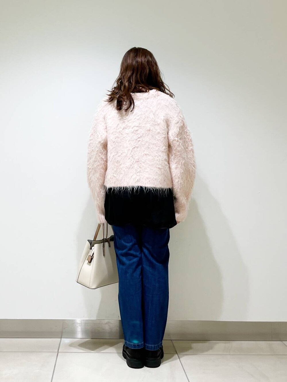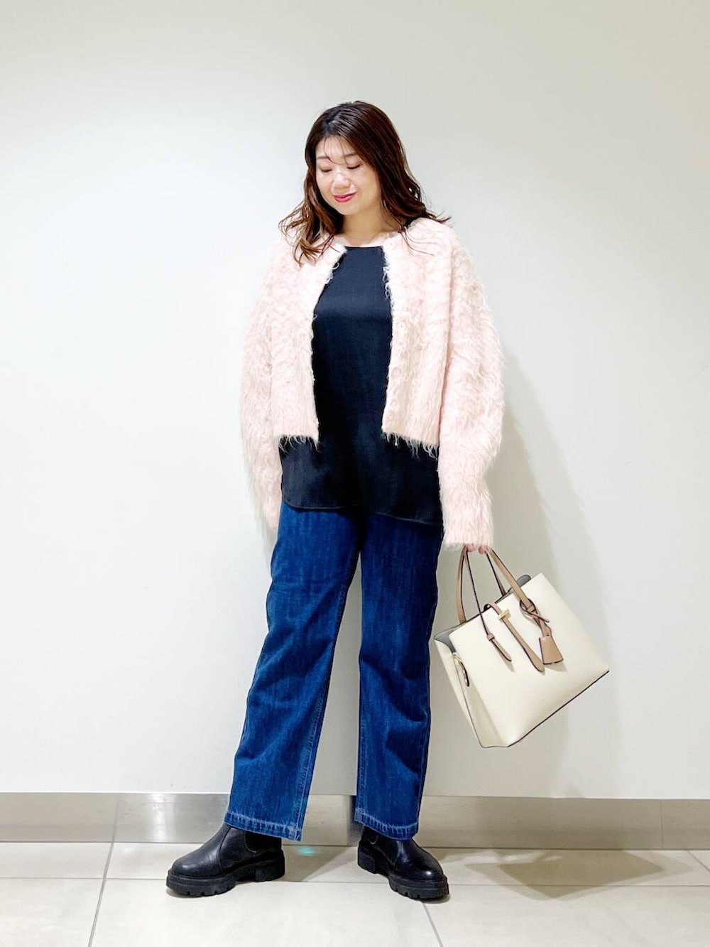 ブラックのシャツを組み合わせることで柔らかい印象のピンクカーディガンも甘くなりすぎず、着れます☆