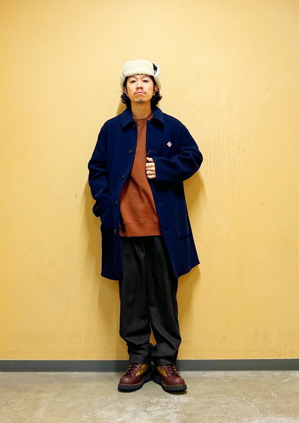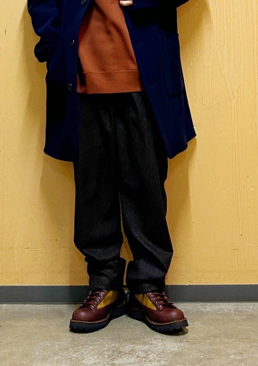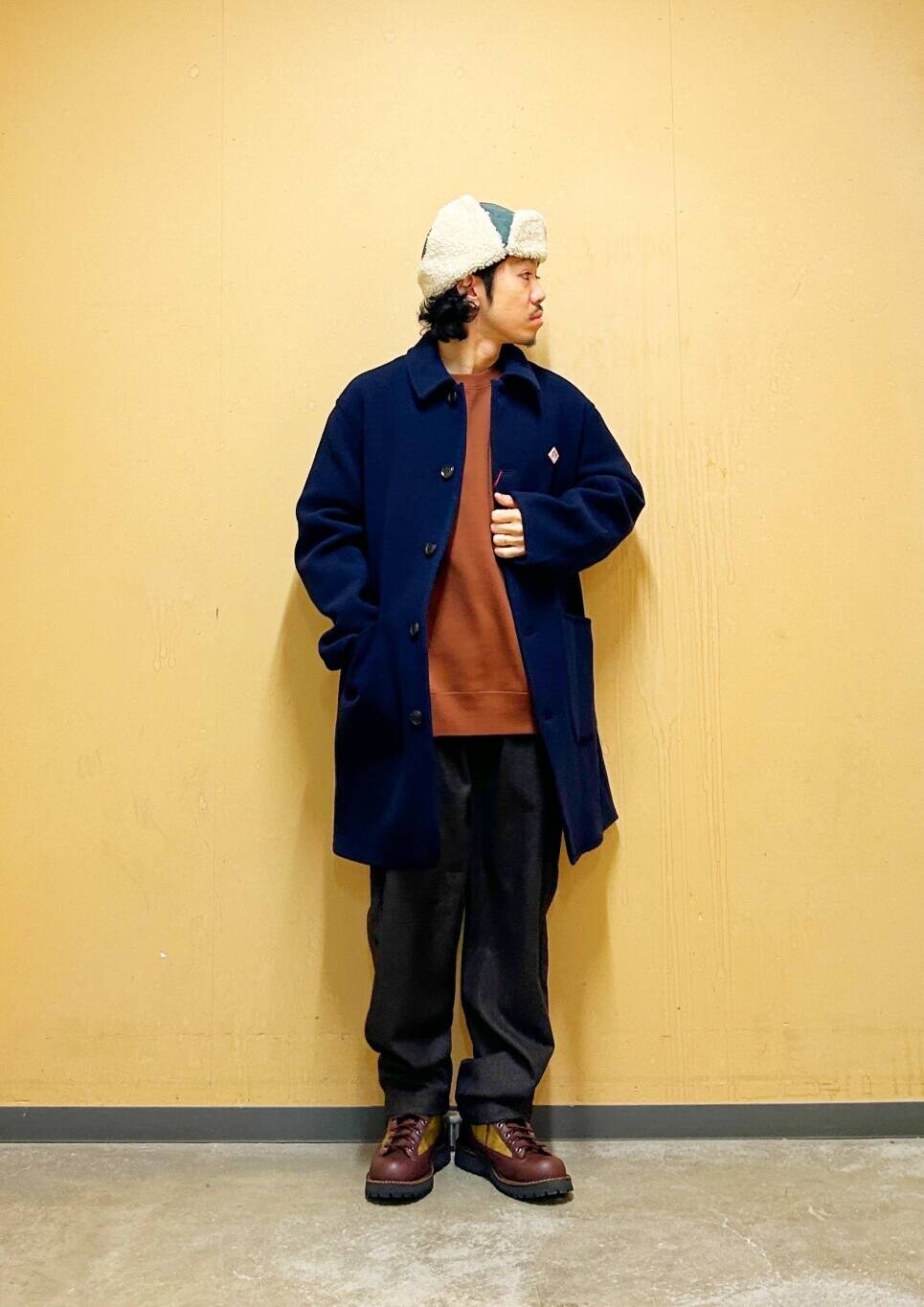 今回はDANTONカバーオールコートとウールライクトラウザーを使用したコーディネート。