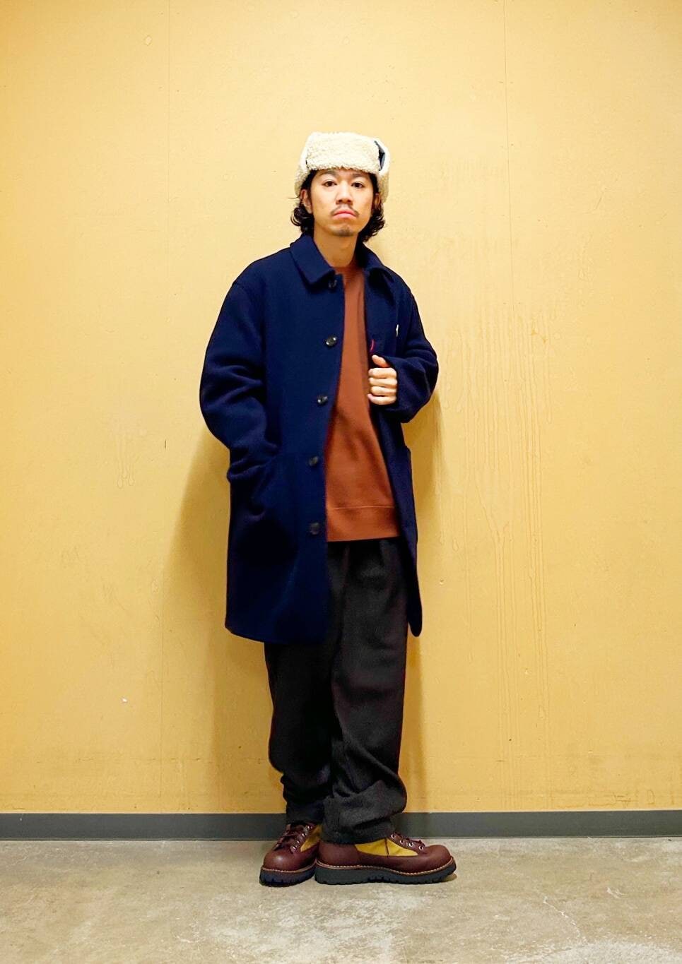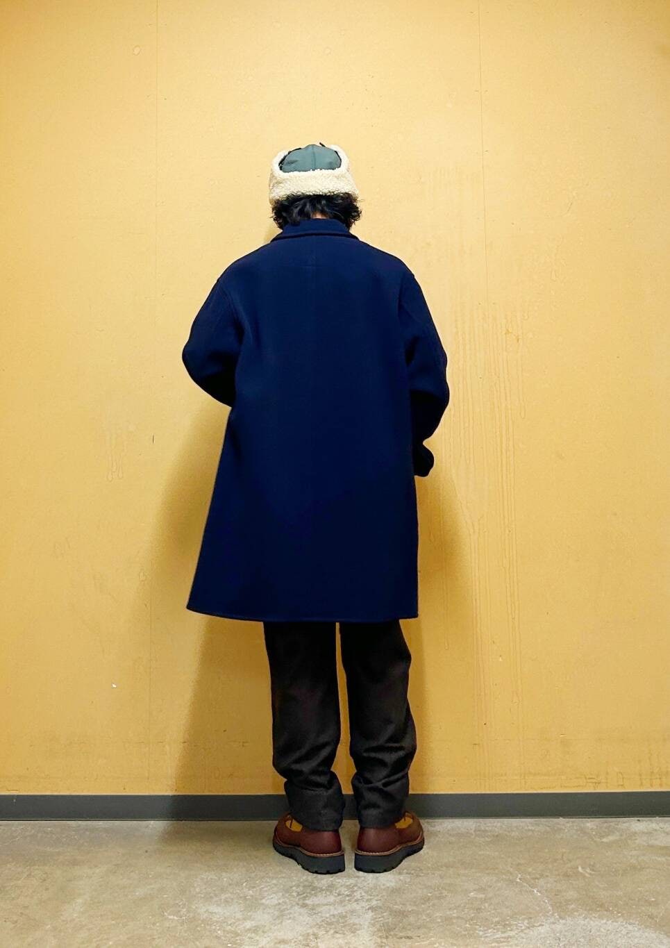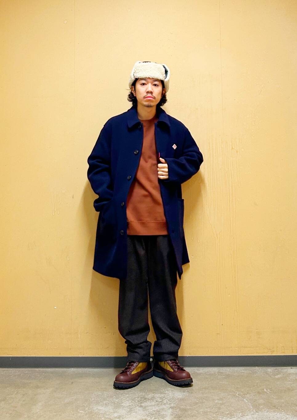 今回はDANTONカバーオールコートとウールライクトラウザーを使用したコーディネート。