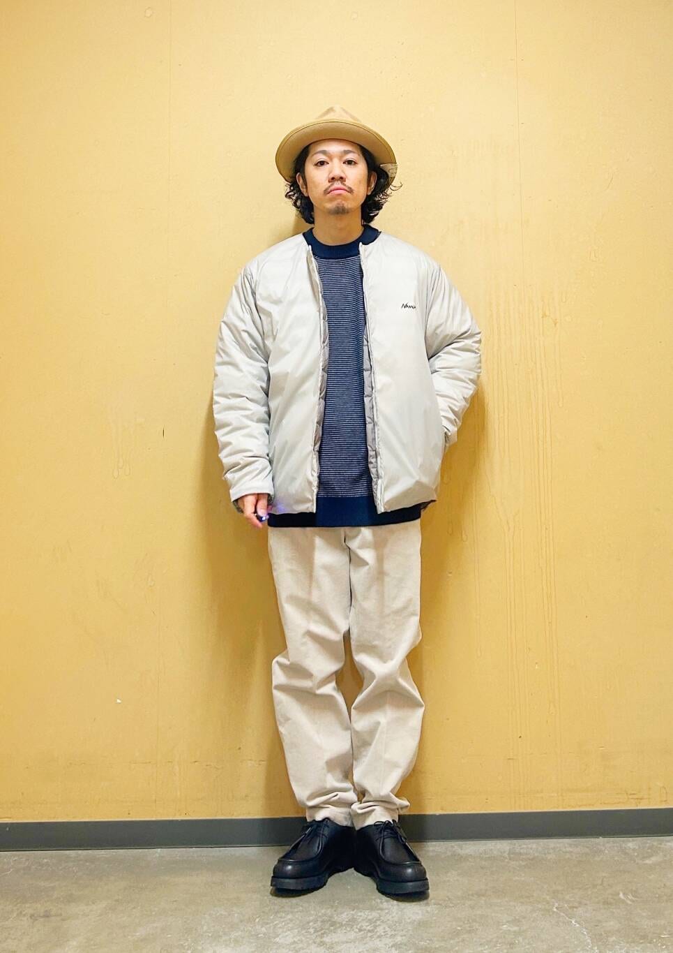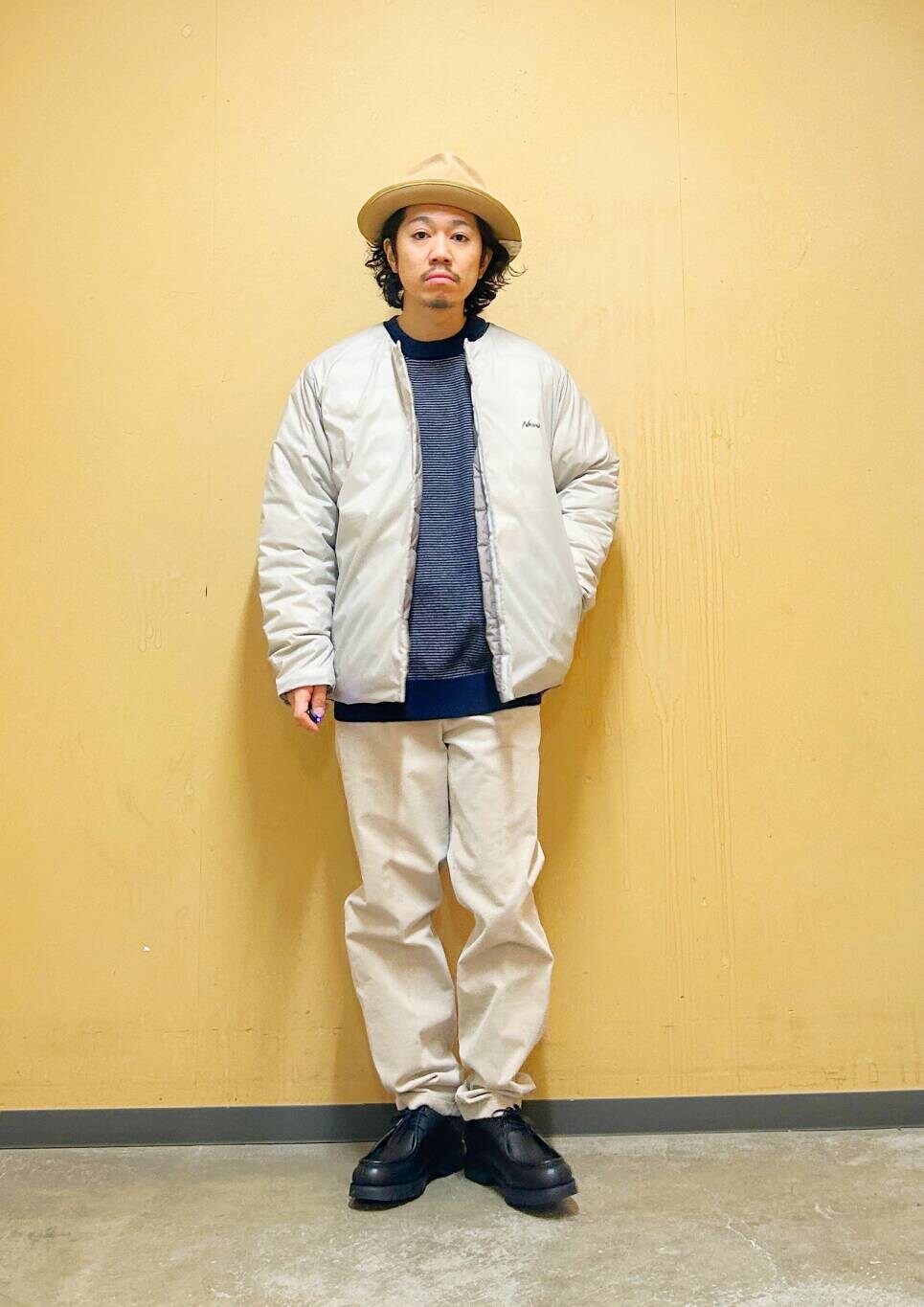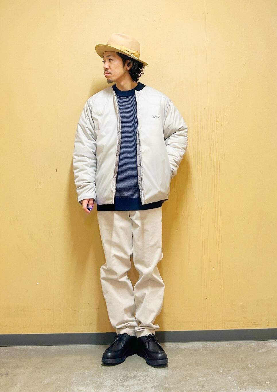 今回はNANGAインナーダウンとコーデュロイトラウザーを使用したコーディネート。