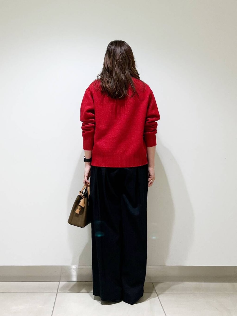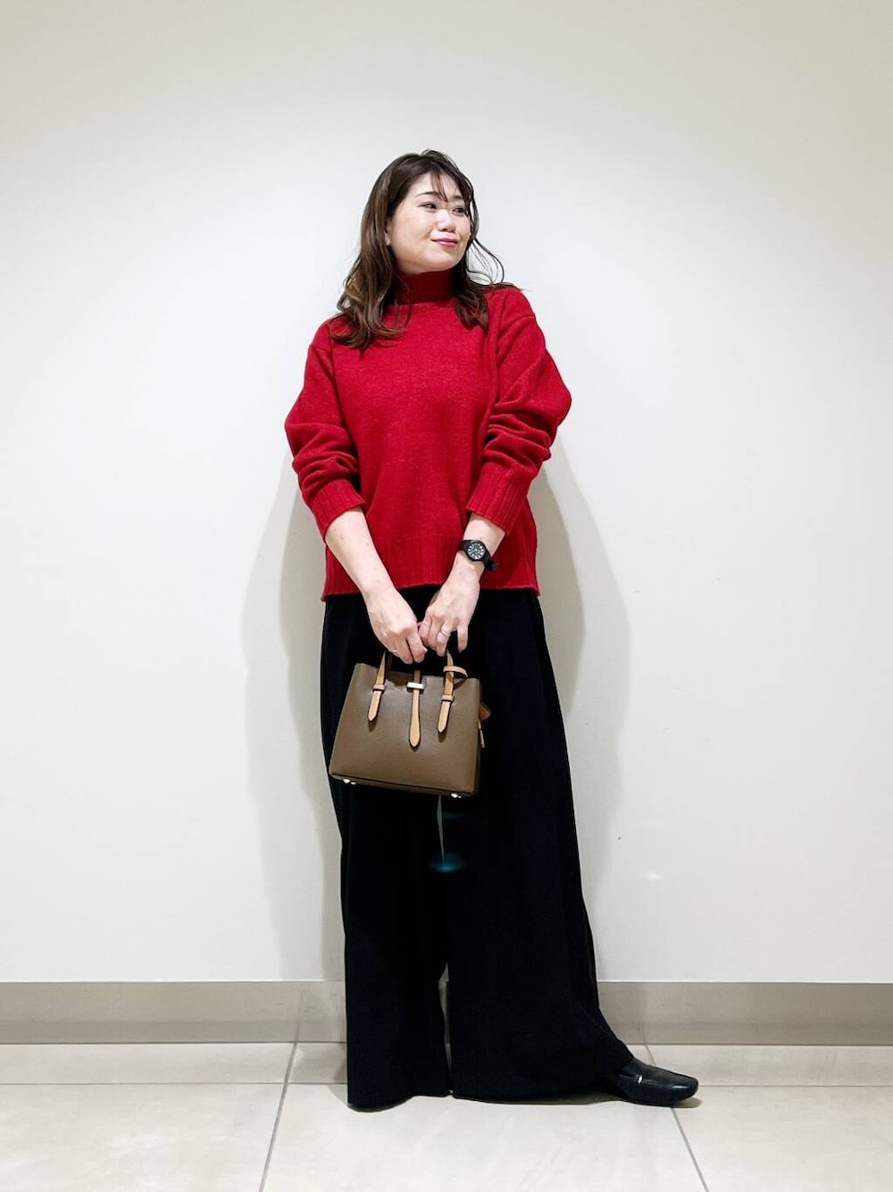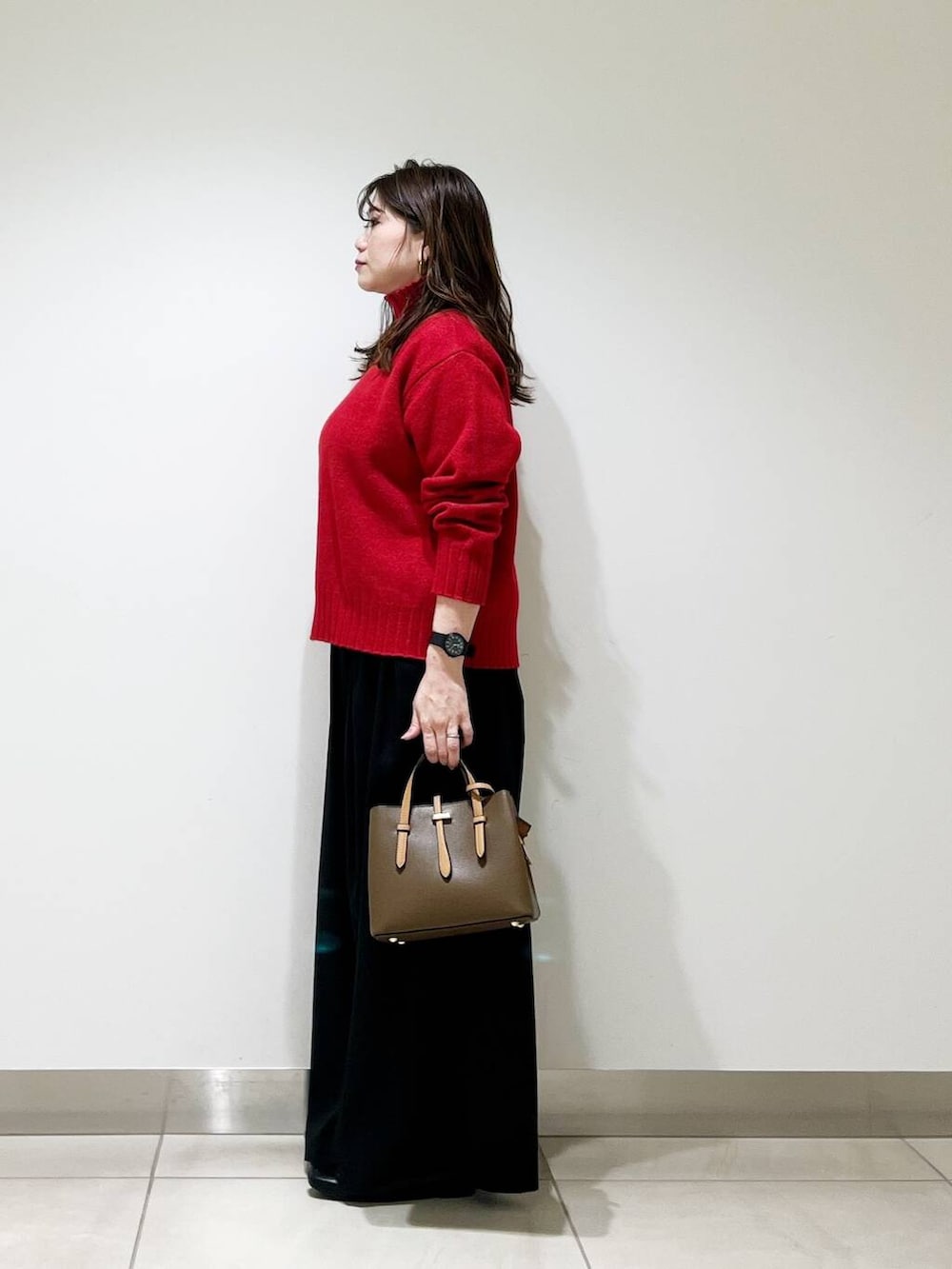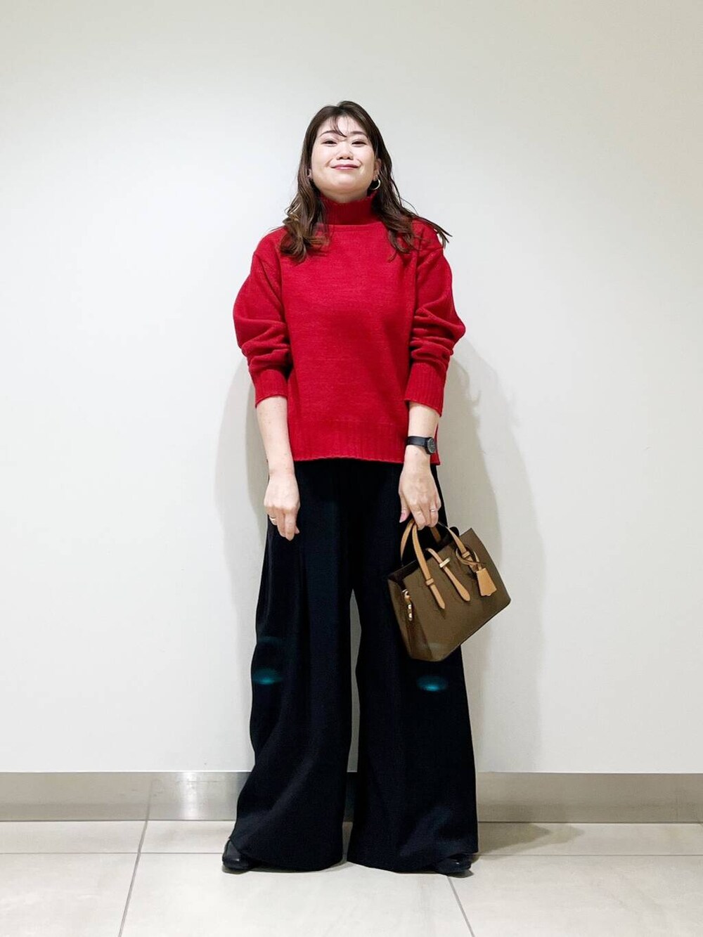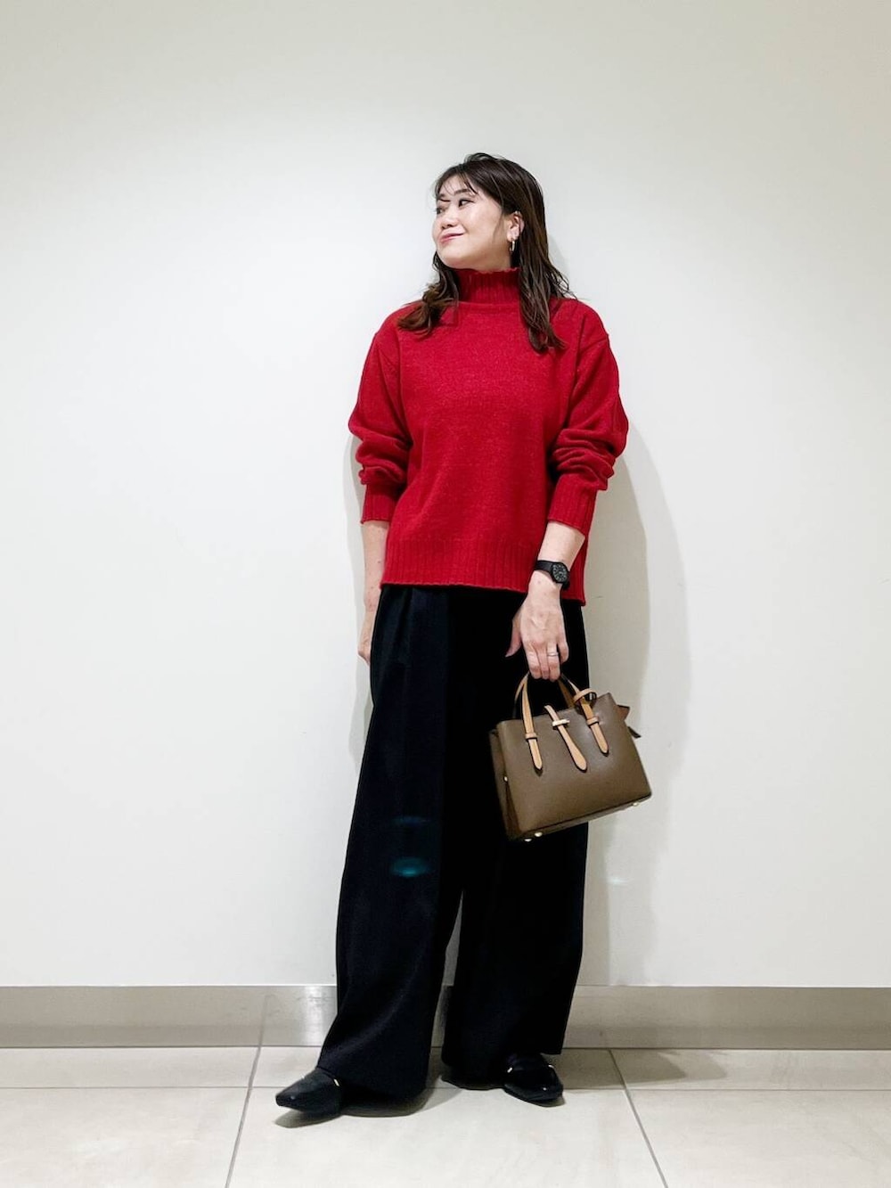 ワイドパンツとも相性が良いタートルニットです☆カラーニットなので、普段色物を着ない方も合わせやすい赤ですよ☆
