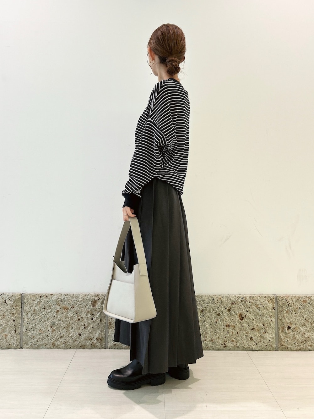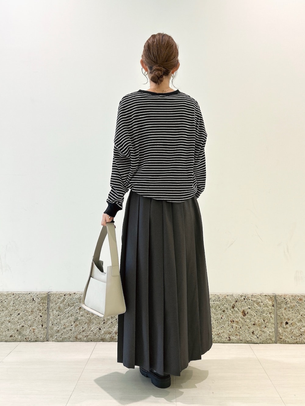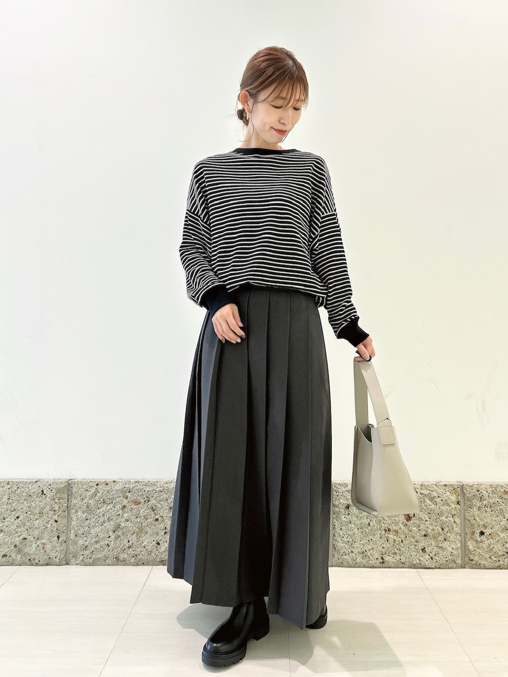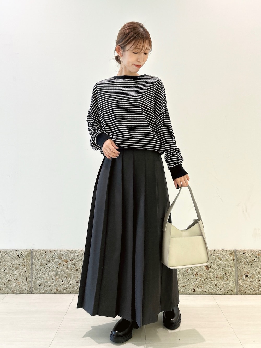 ボトムには大判のプリーツデザインが可愛いスカートを。