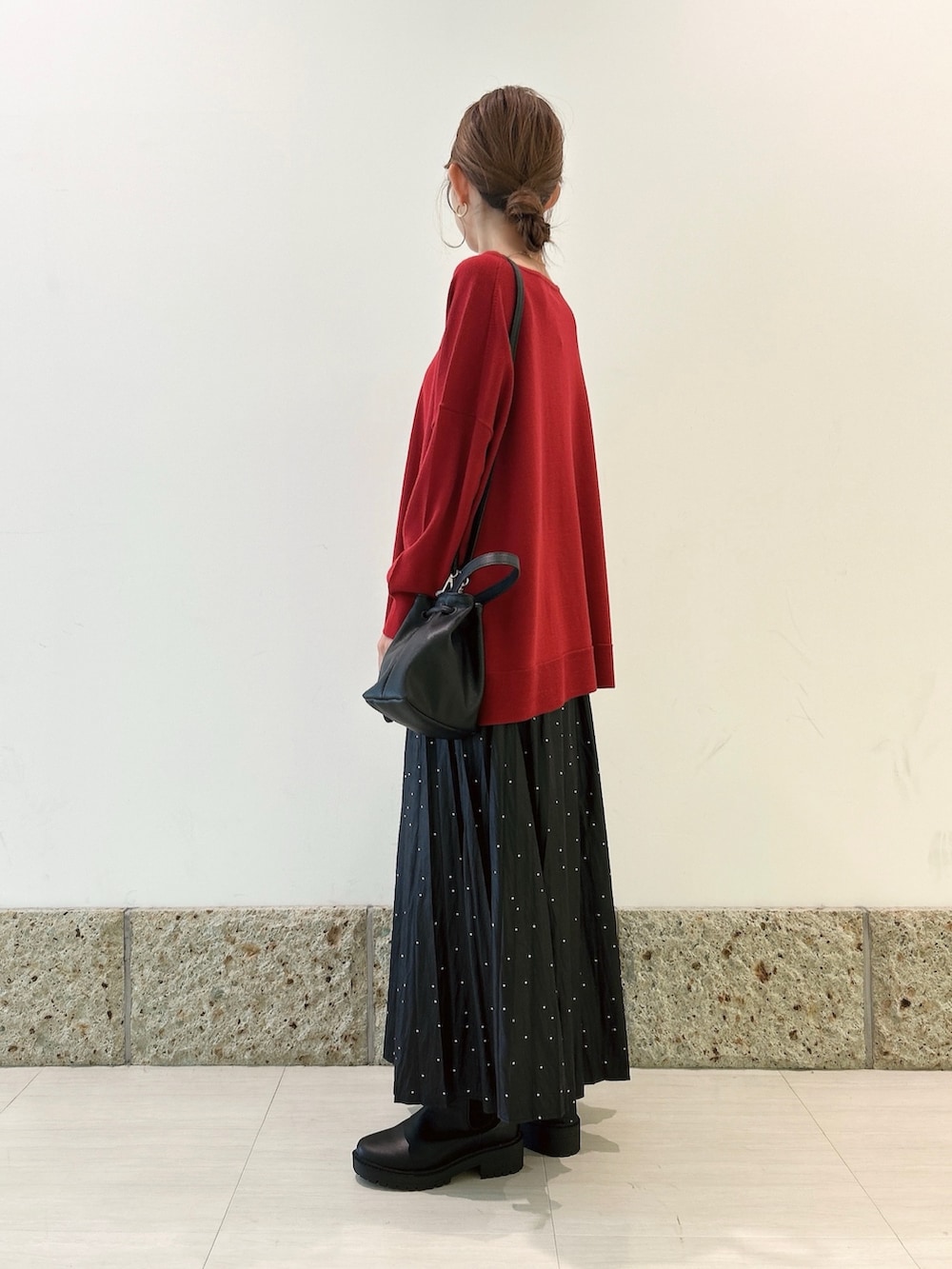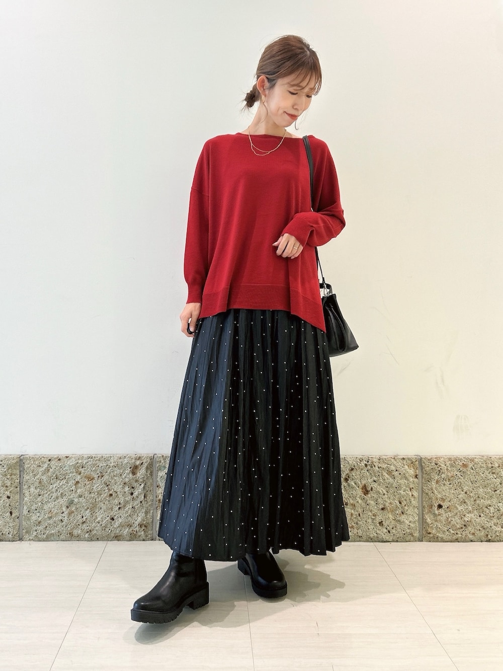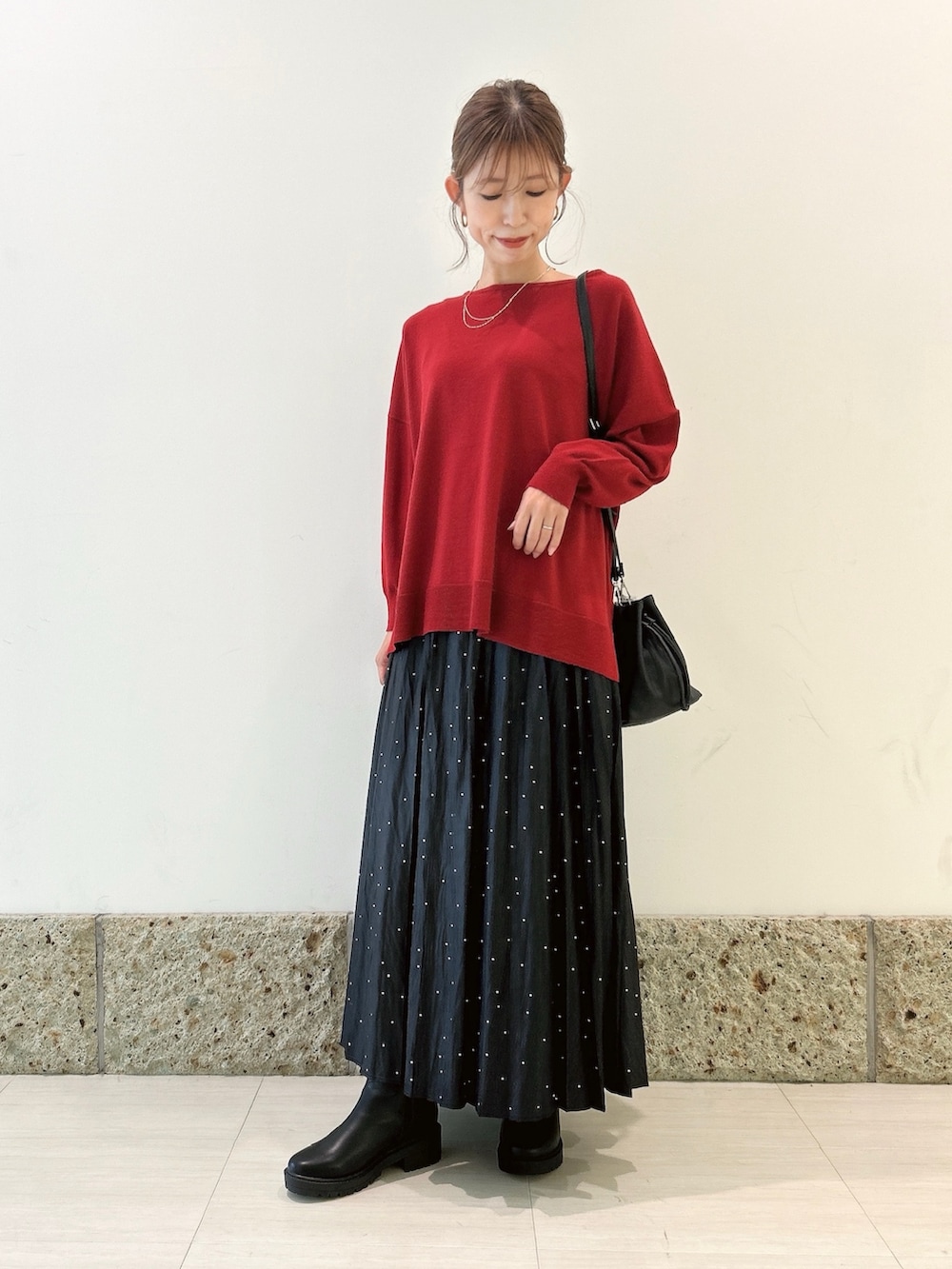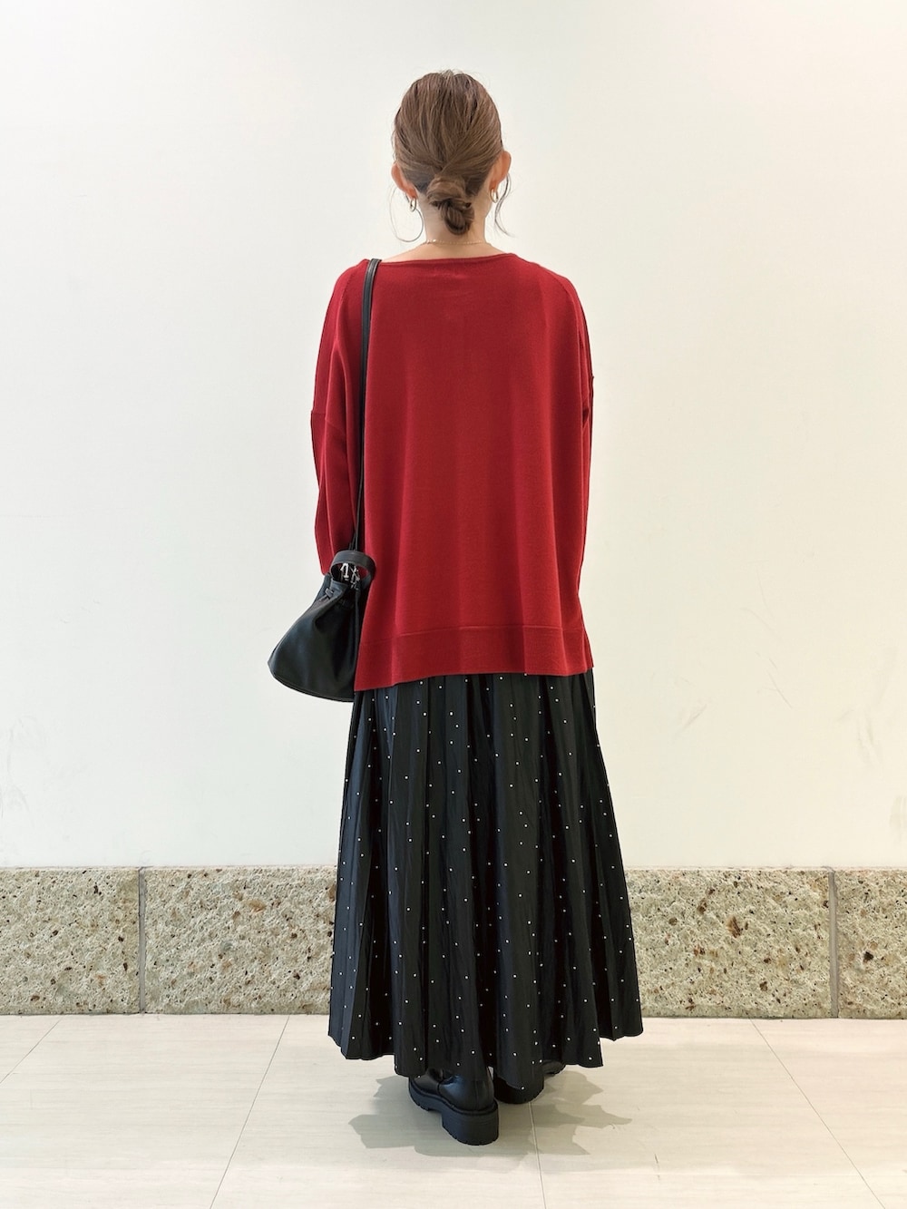 トップスは少し深みのある落ち着いた赤色が大人可愛い一着。