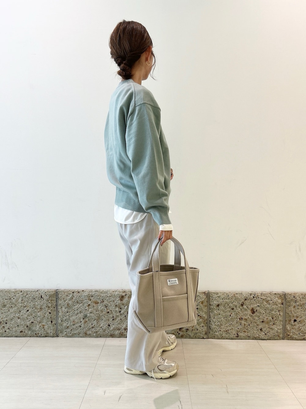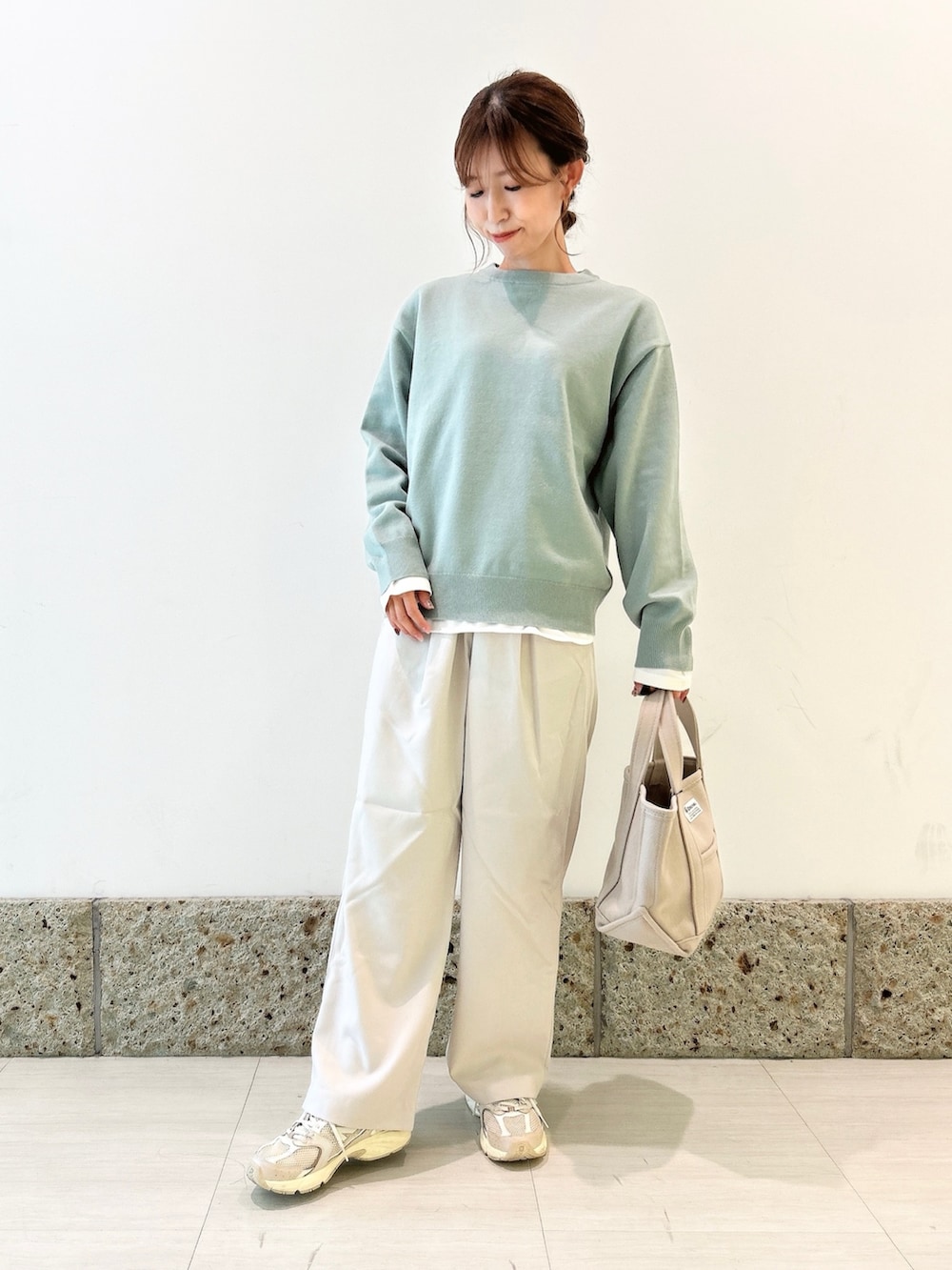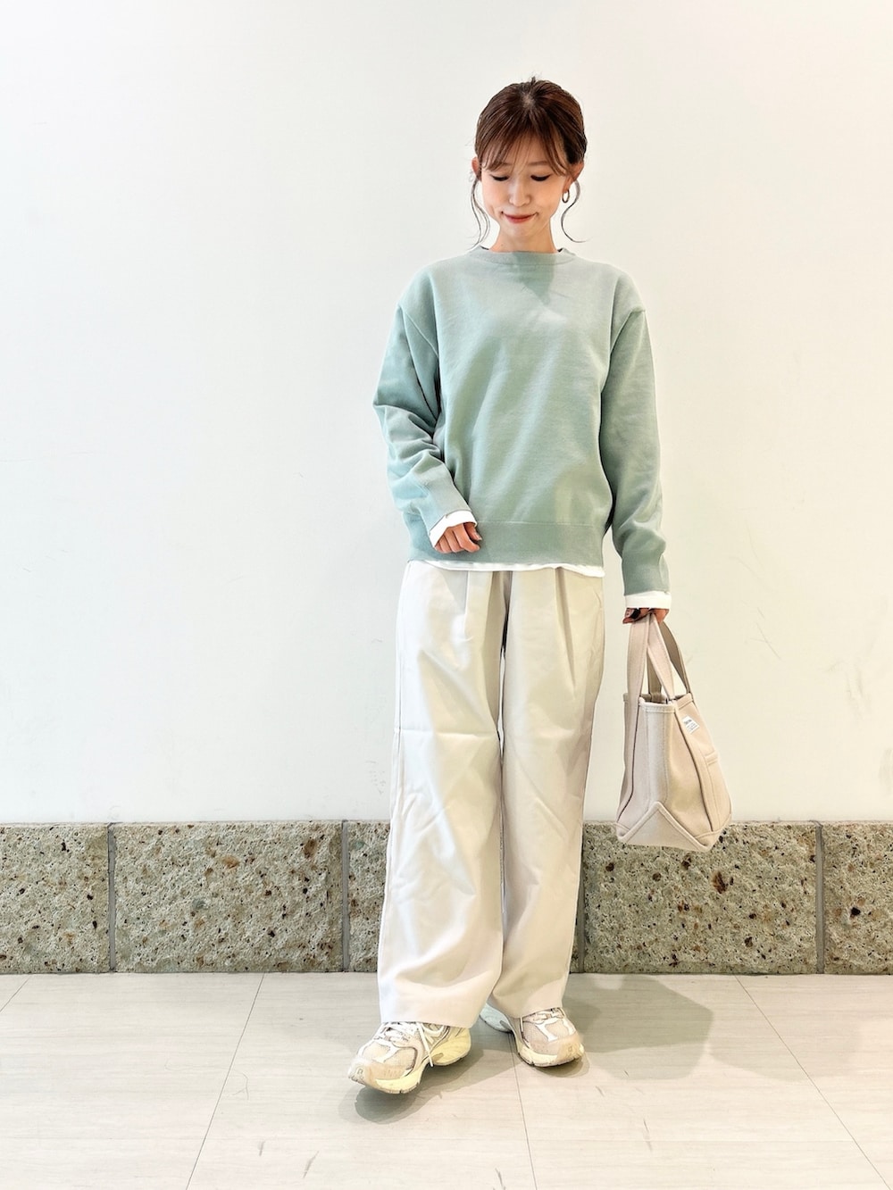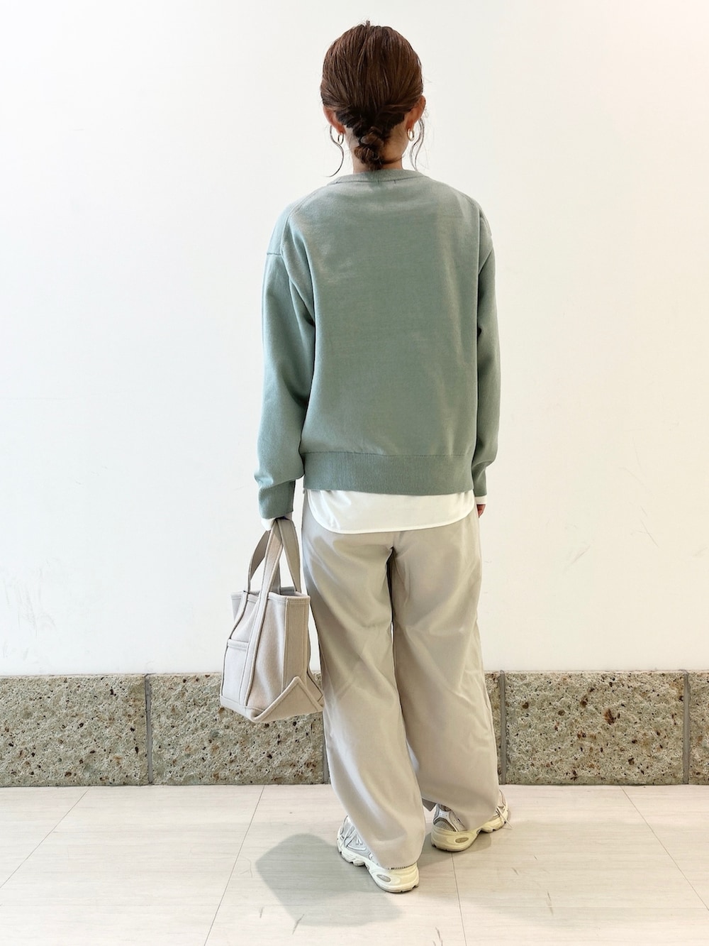 ボトムにはほんのりグレーカラーのワイドパンツを合わせて