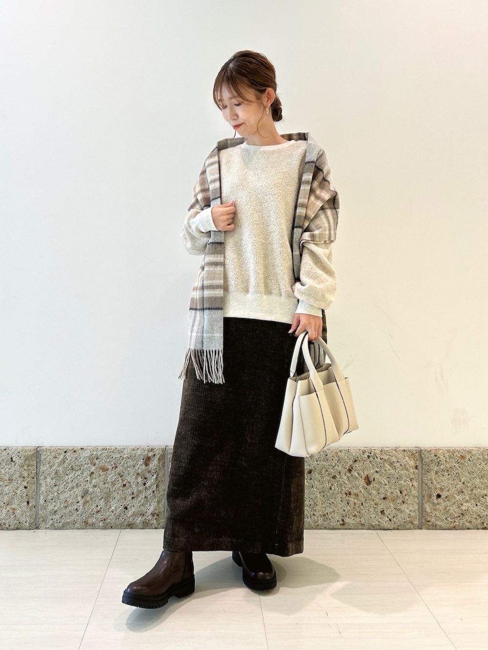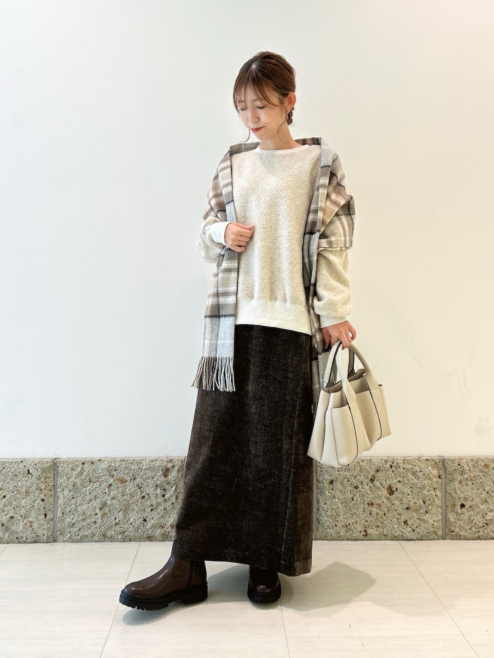 合わせたショールは、ベージュベースの柔らかなカラーが