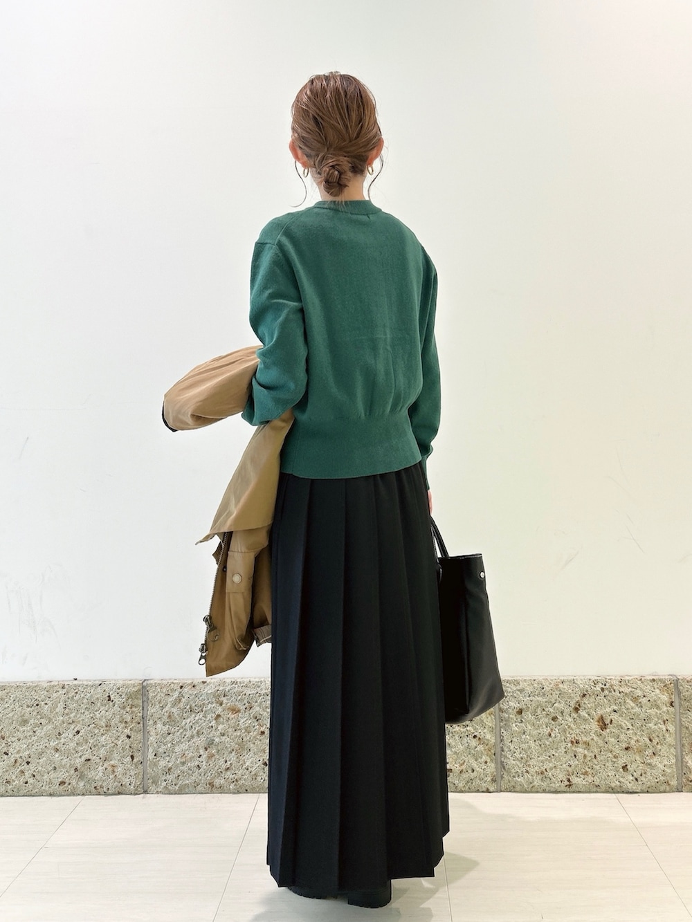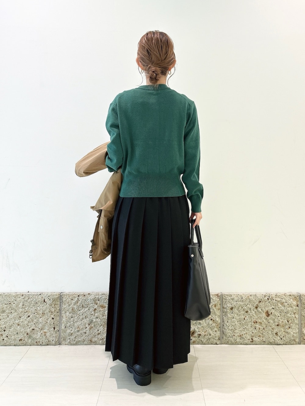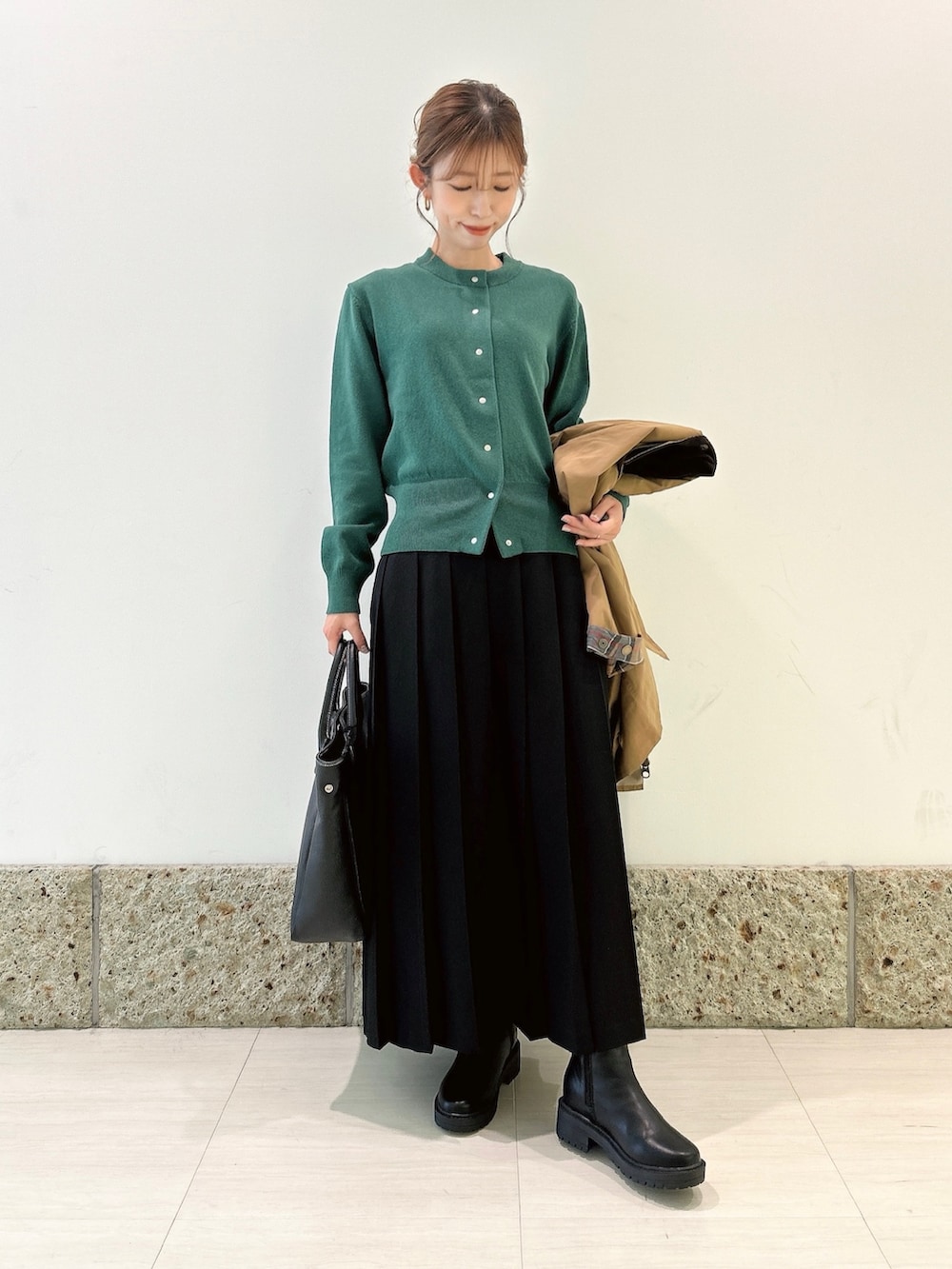 トップスには深みのあるグリーンが可愛いカーディガンを。