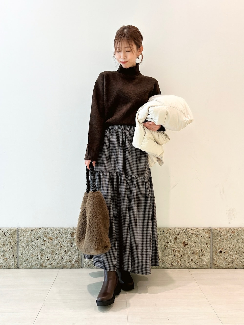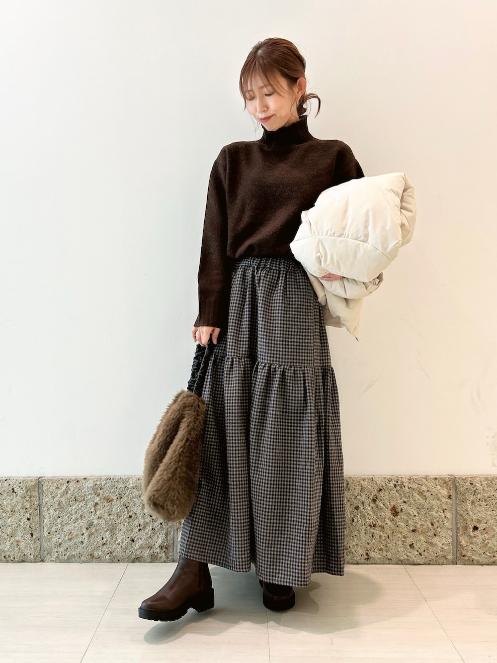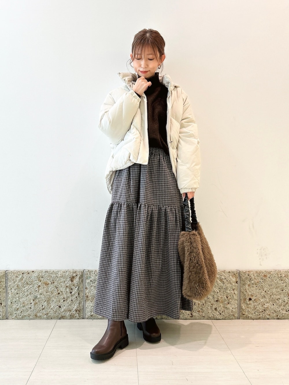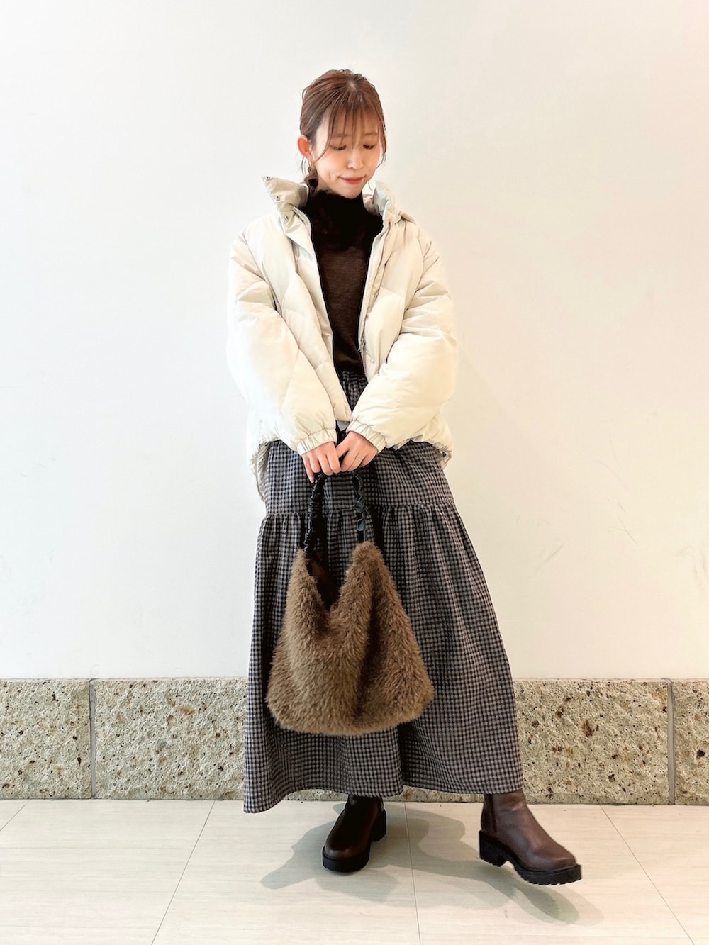 チェック柄が可愛いスカートを軸にコーディネート。