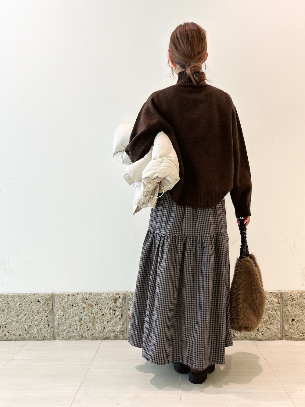 トップスには、スカートの色と合わせてブラウンのニットを。