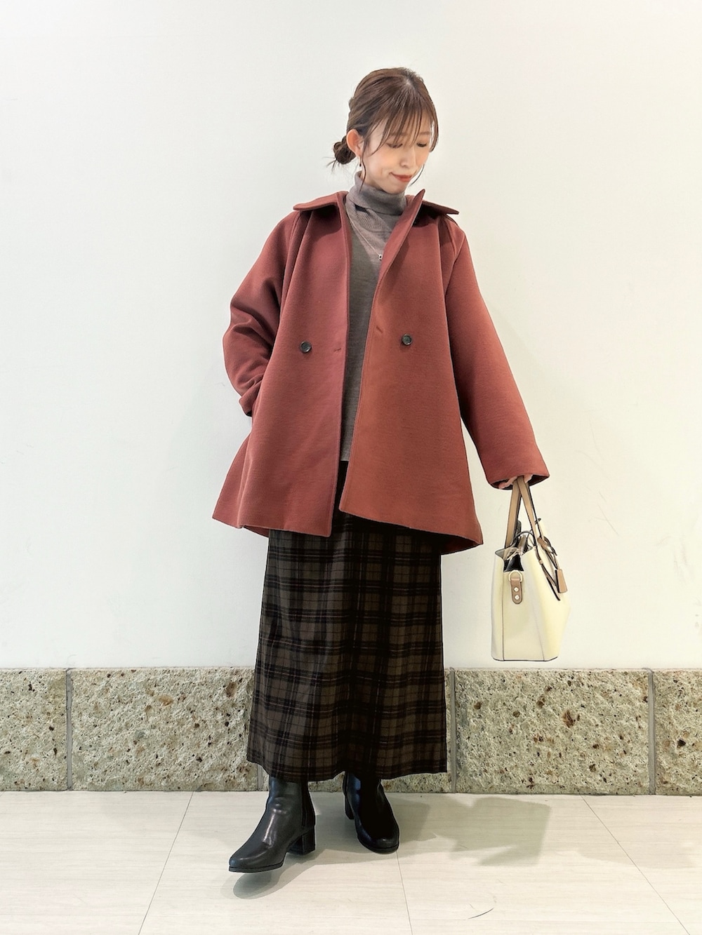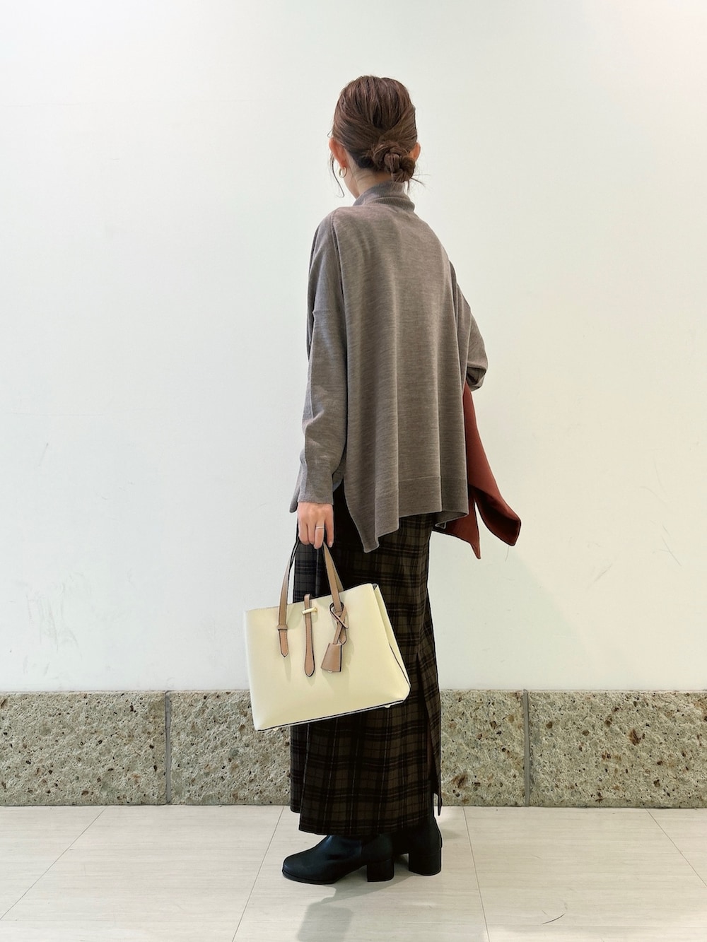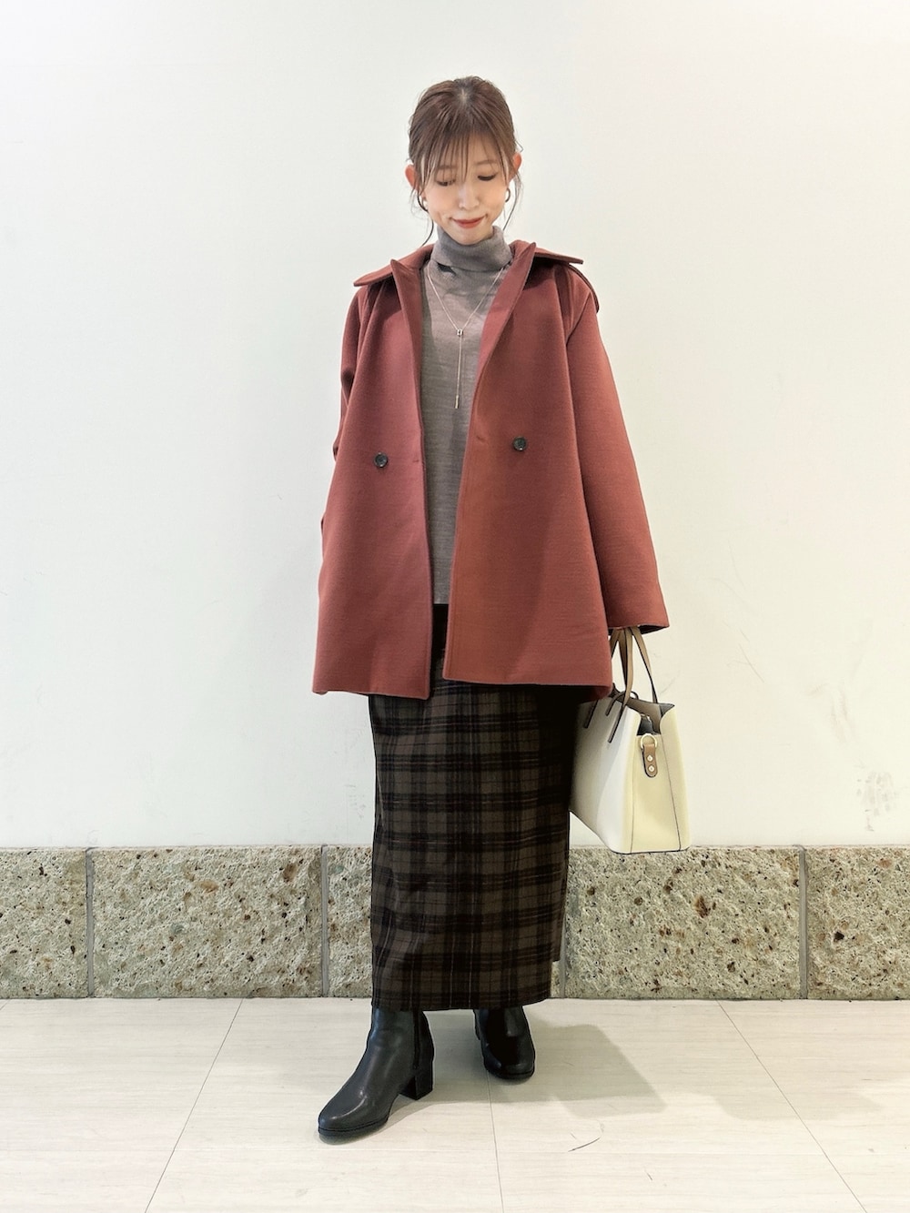ボトムにはチェック柄のストレートスカートを。