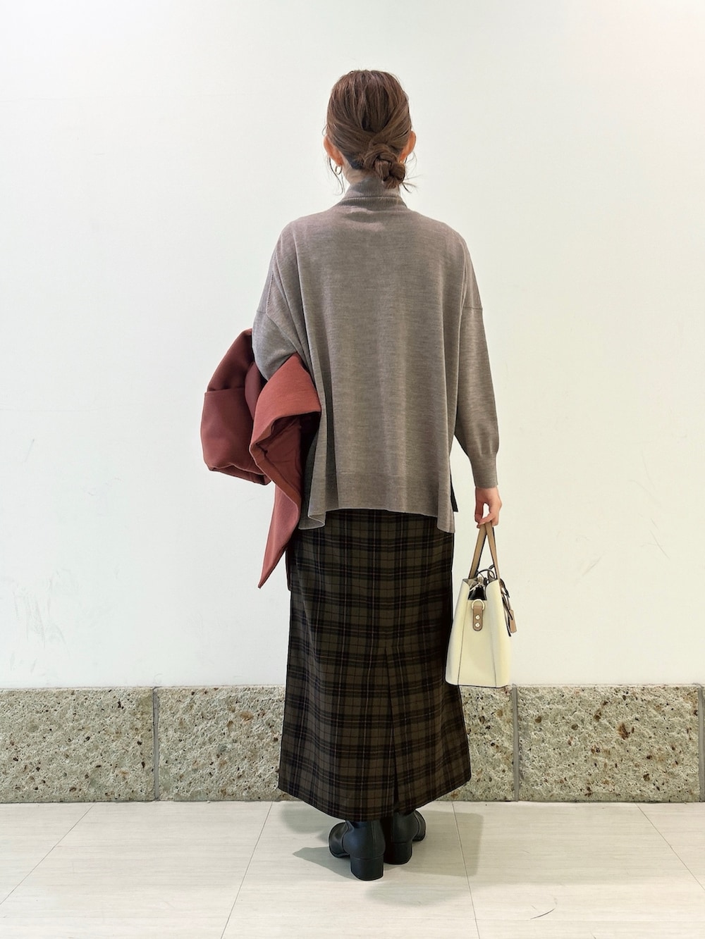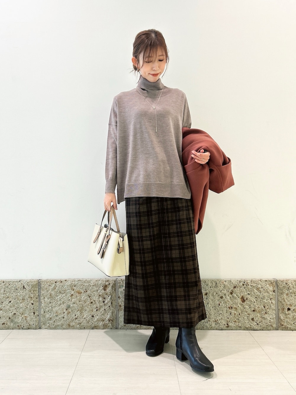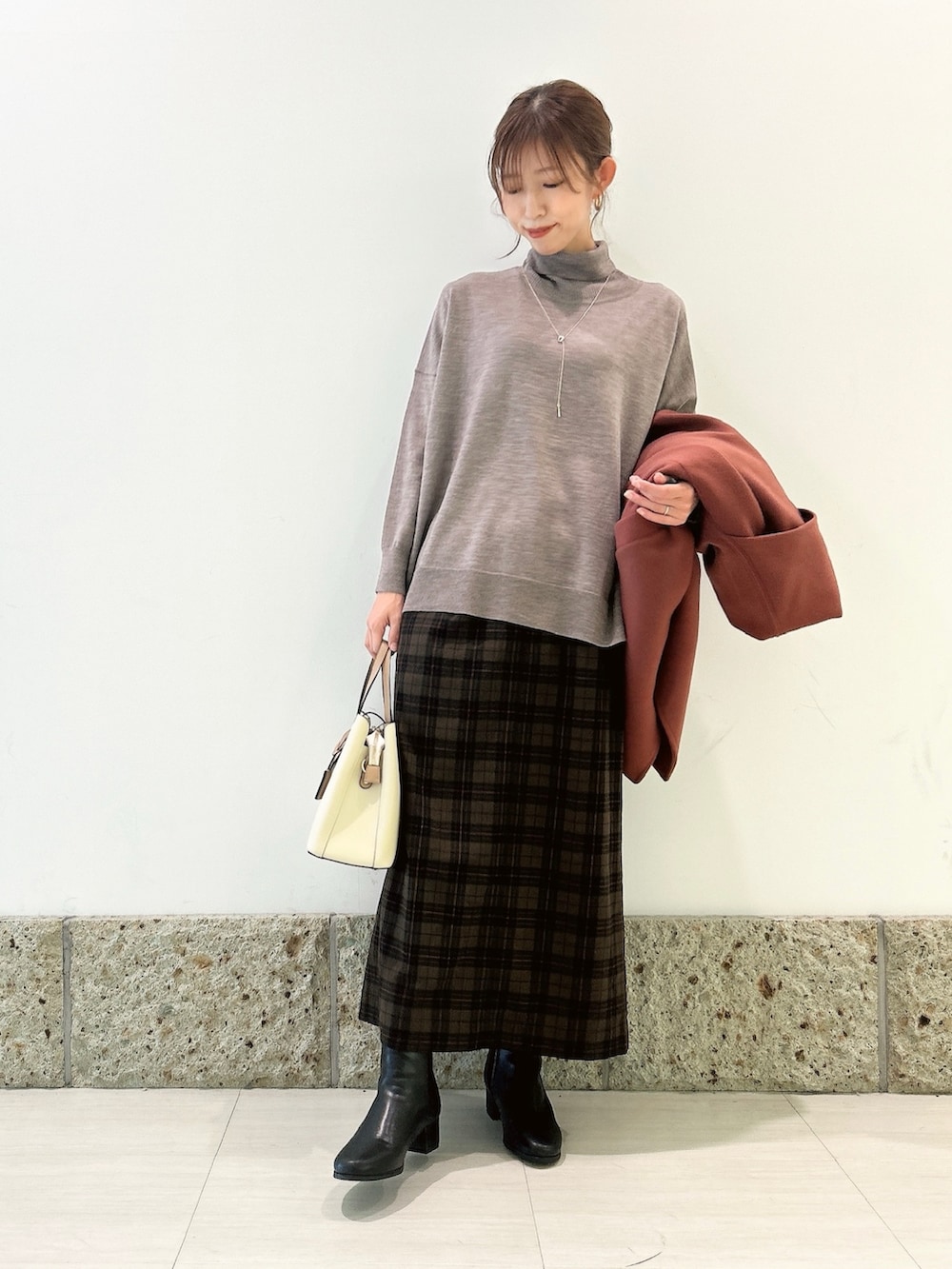 トップスはウール素材のタートルニット。