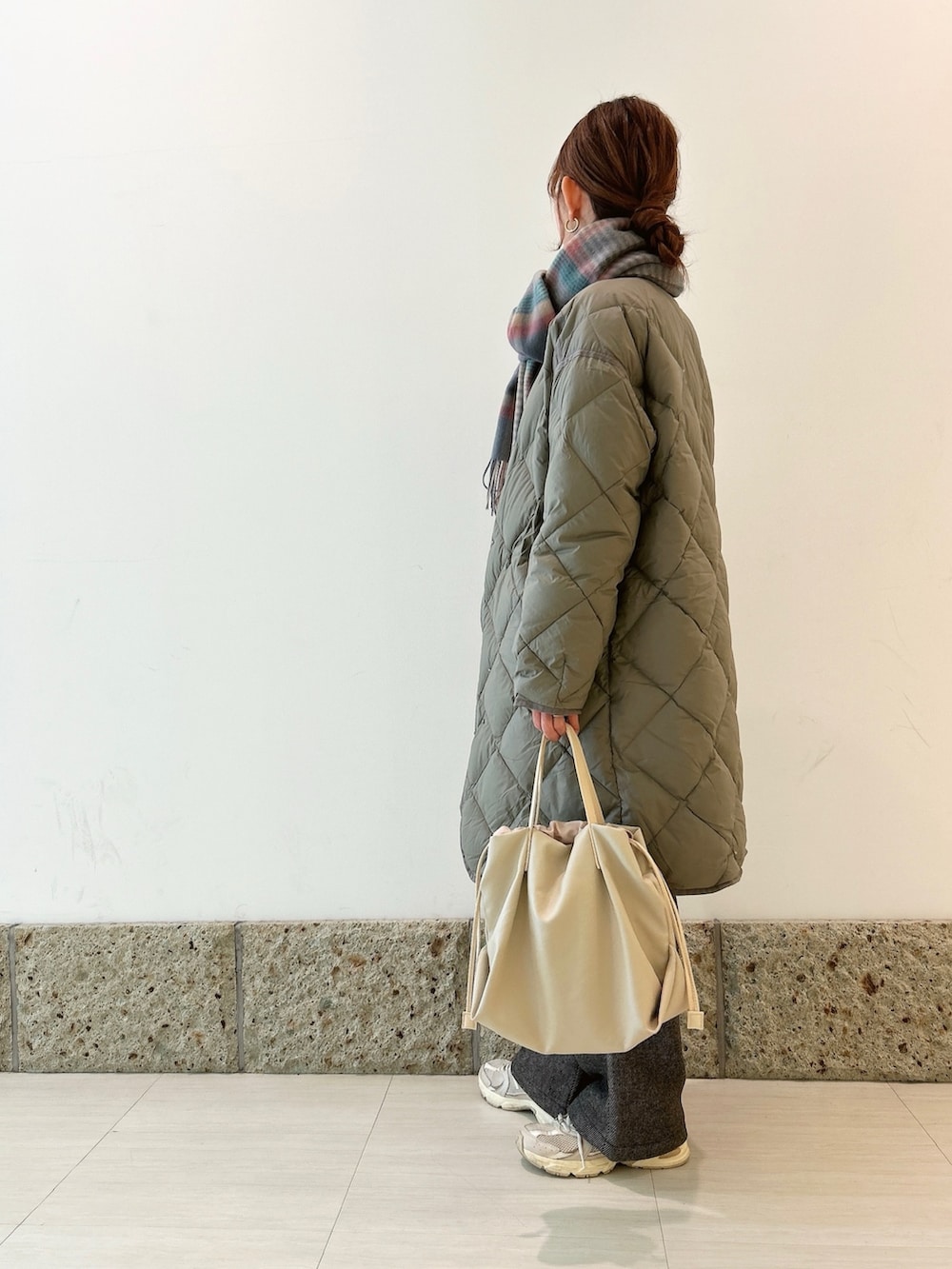 淡いカーキ色で、コーディネートを柔らかな印象に