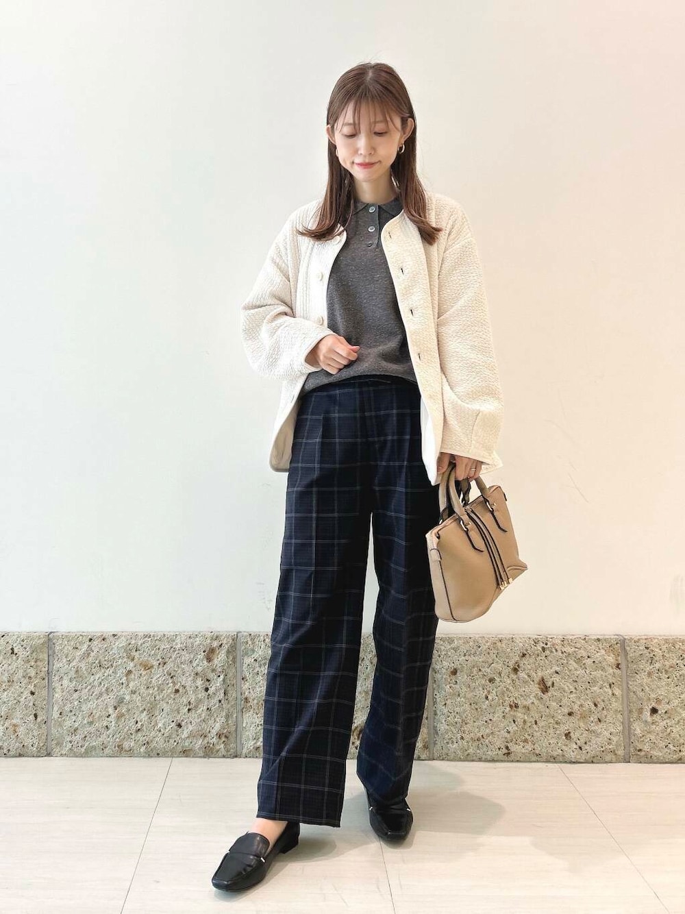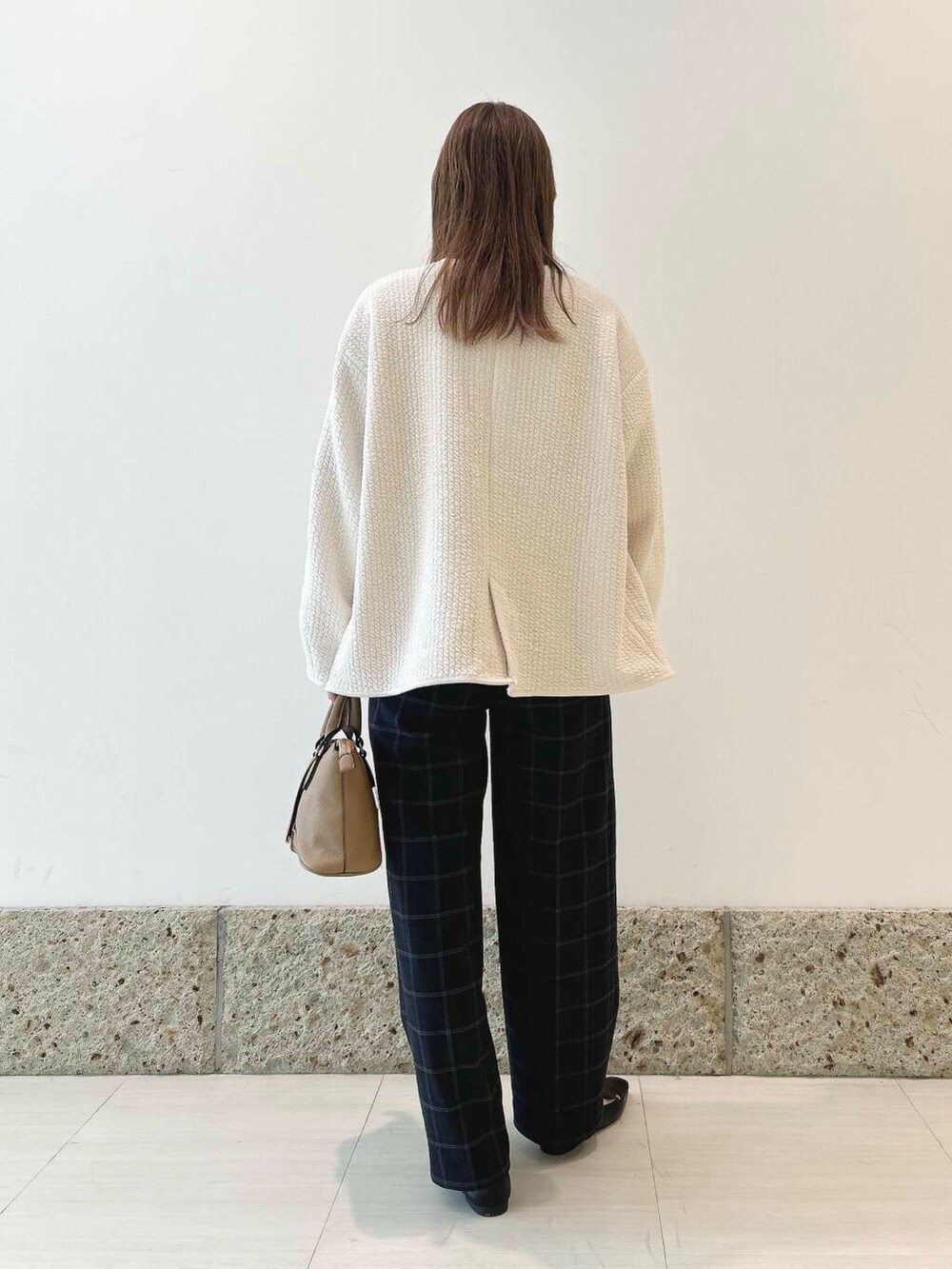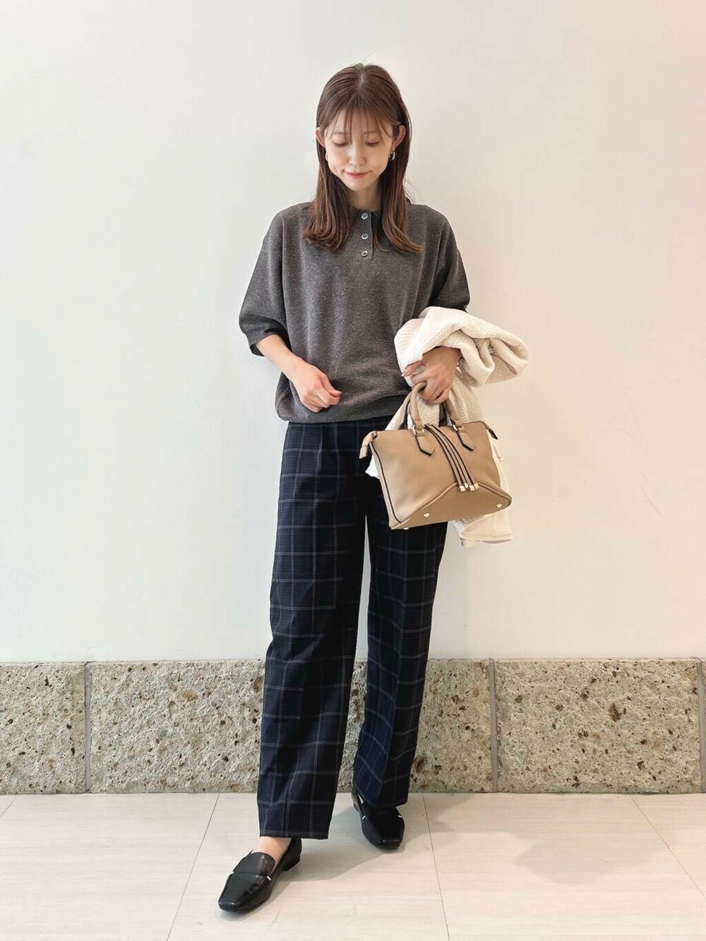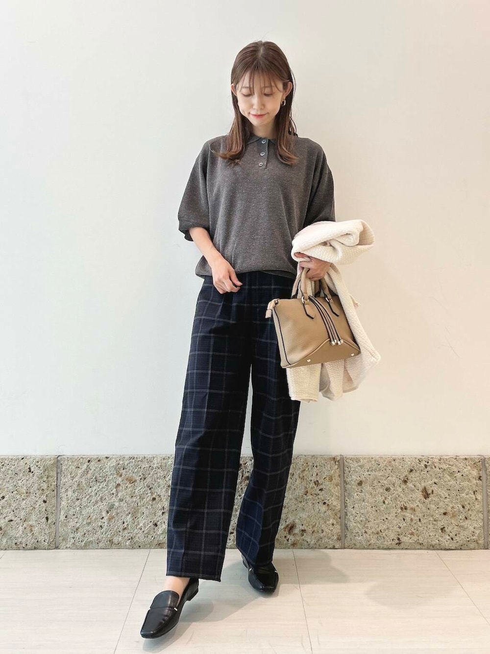 チェックのトラウザーパンツと合わせて