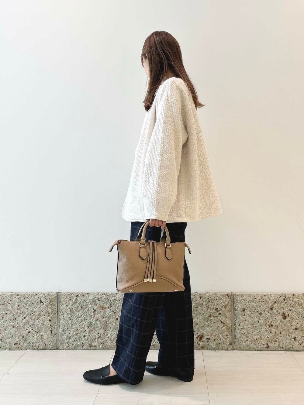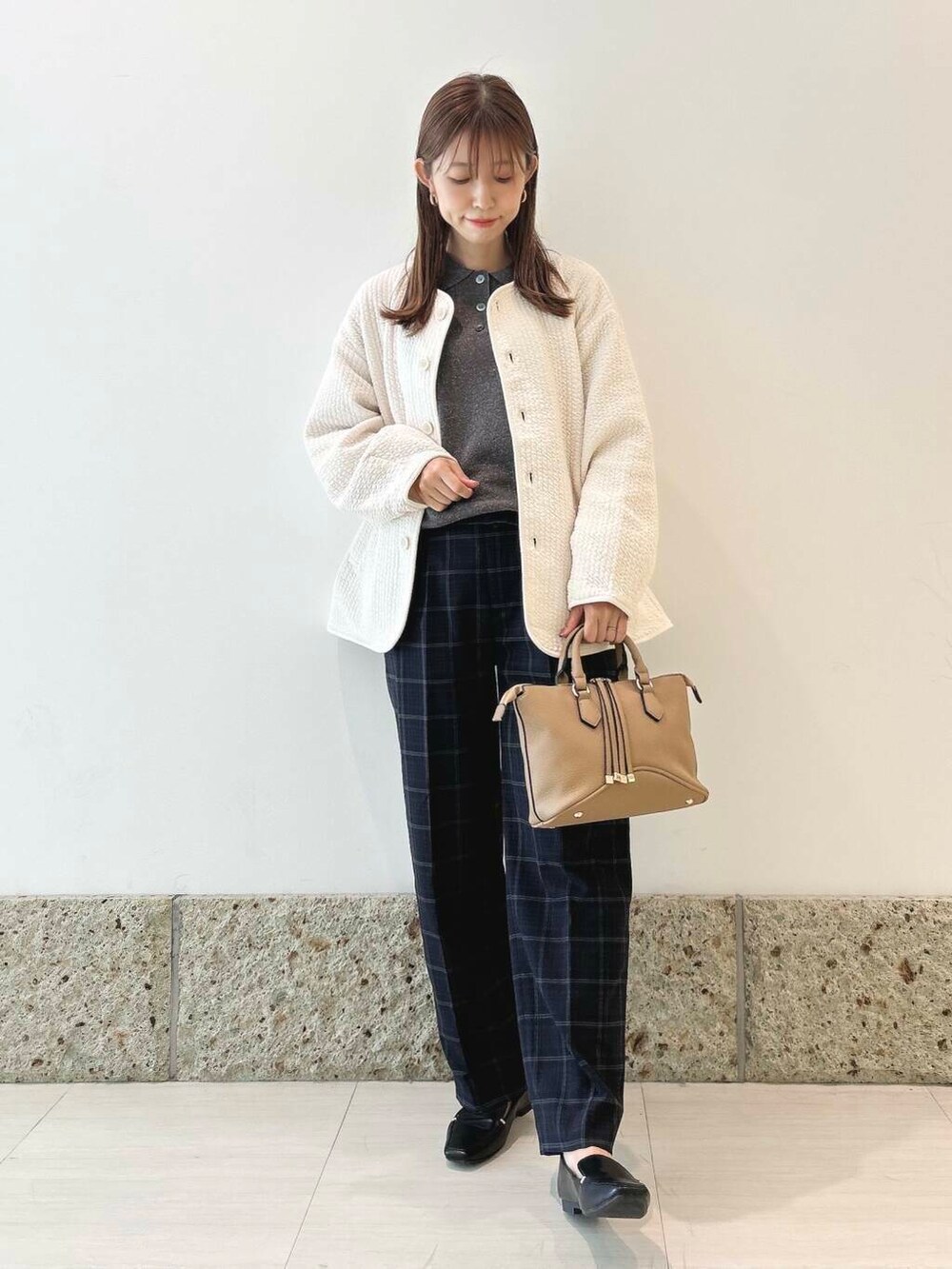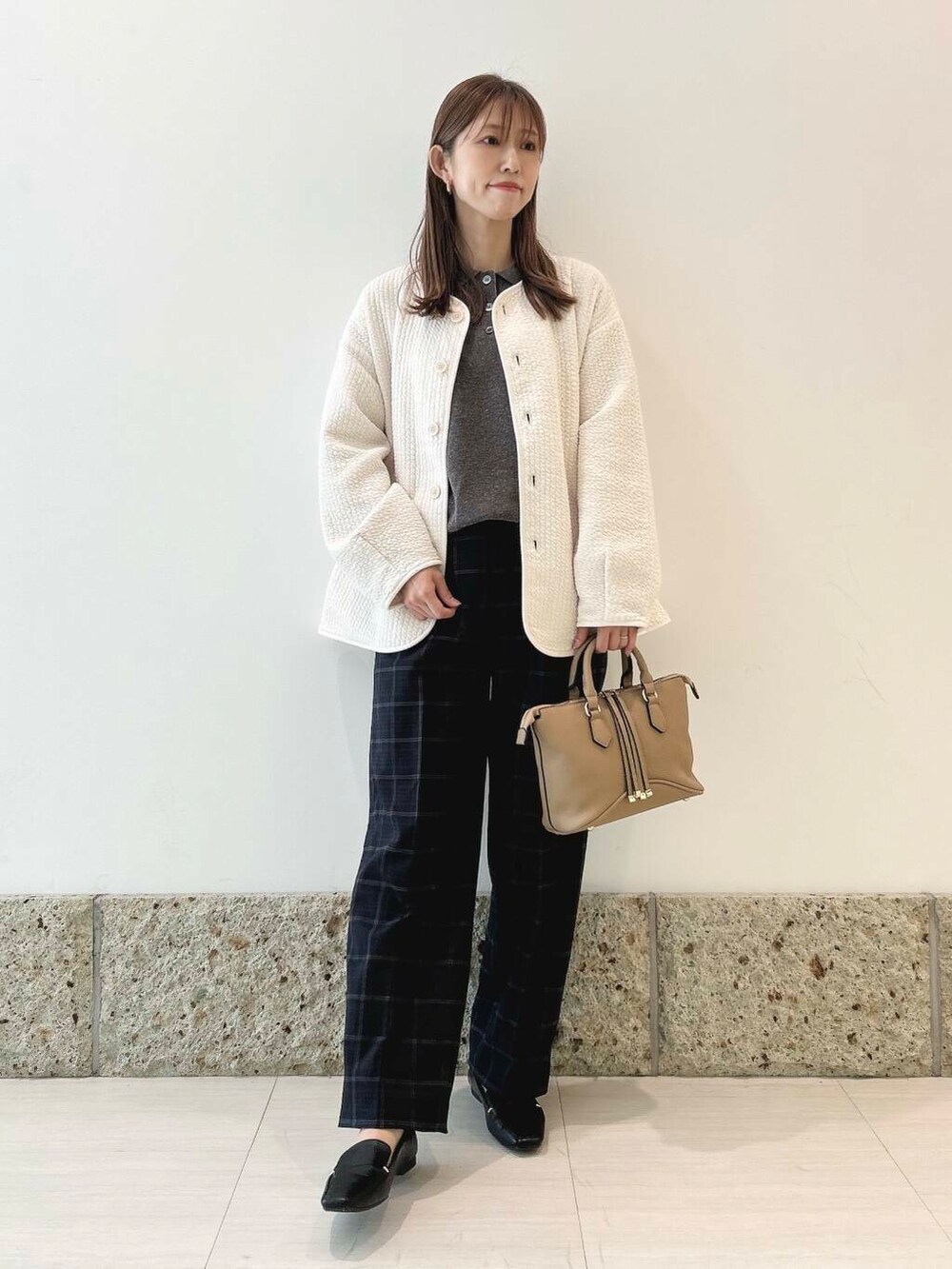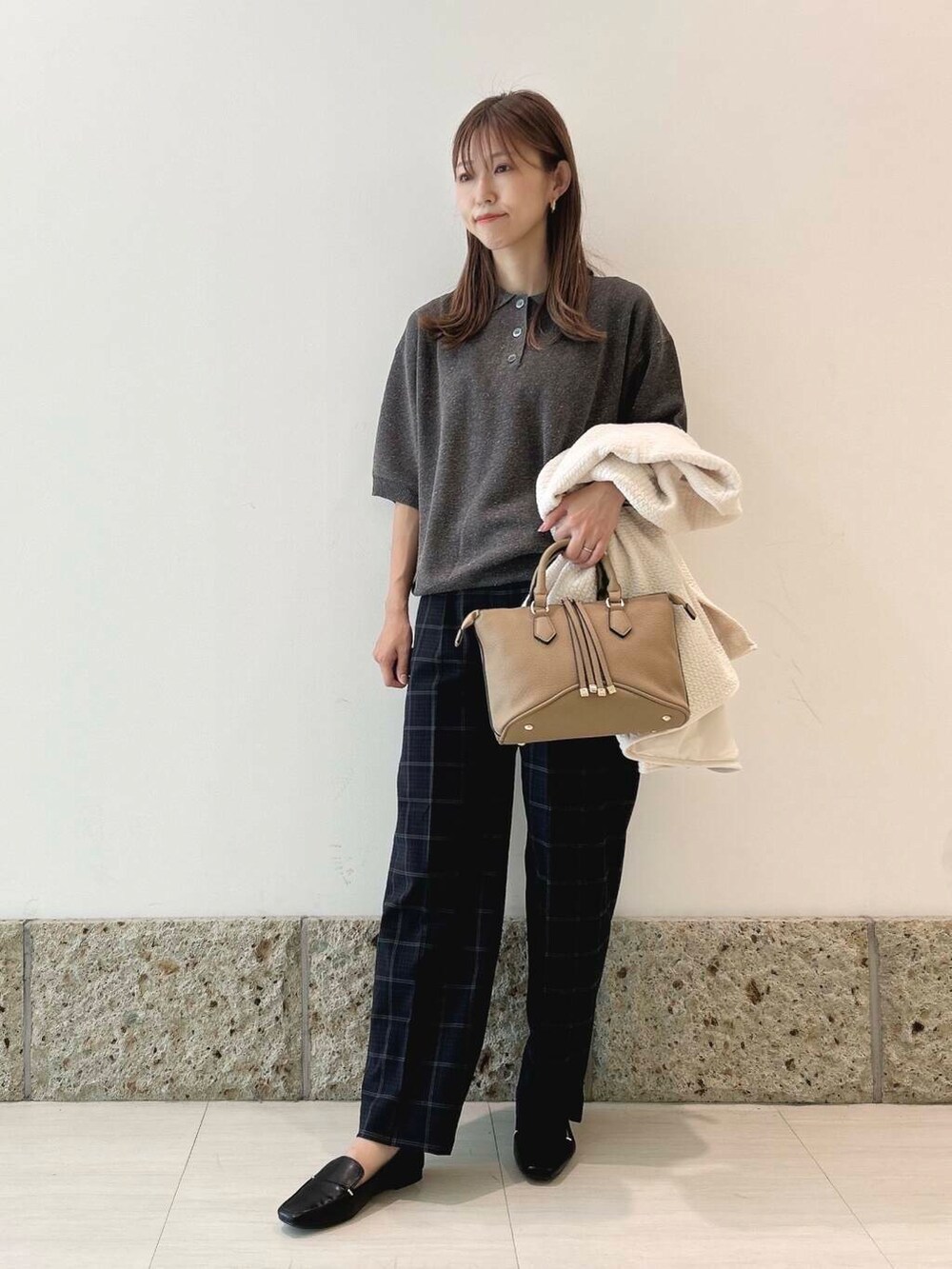 チェックのトラウザーパンツと合わせて