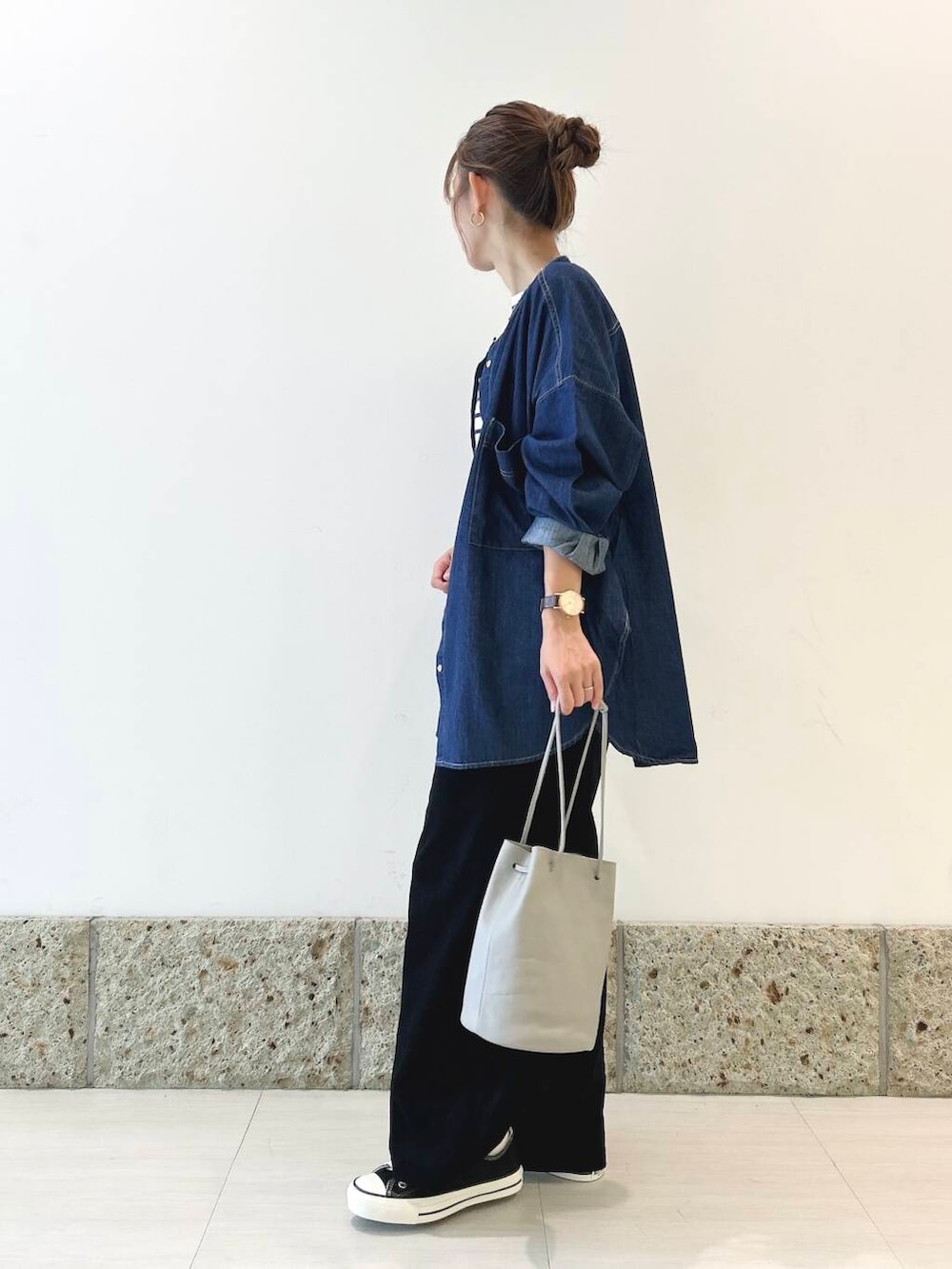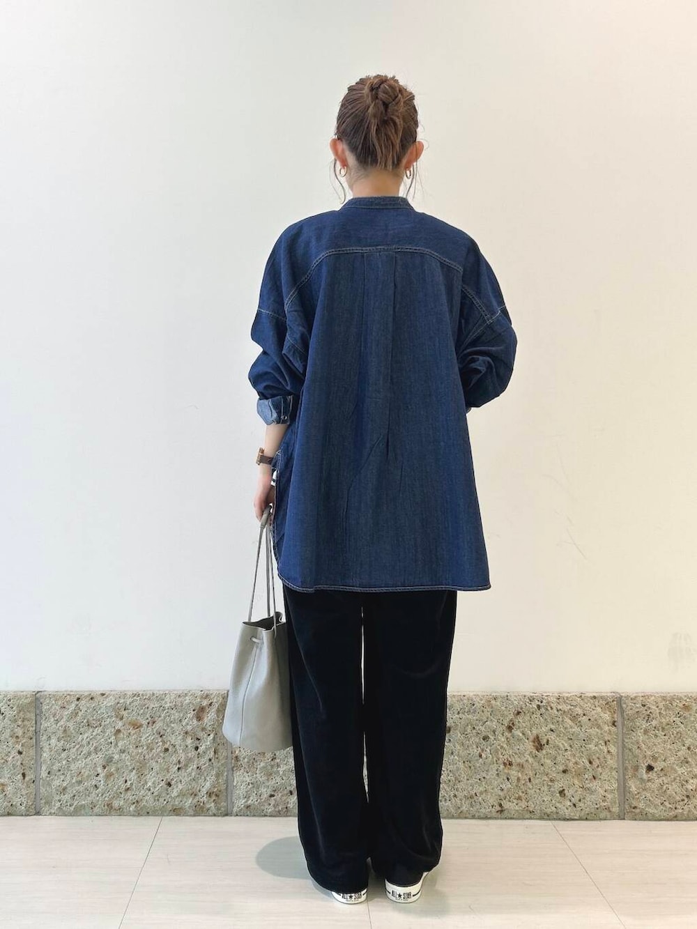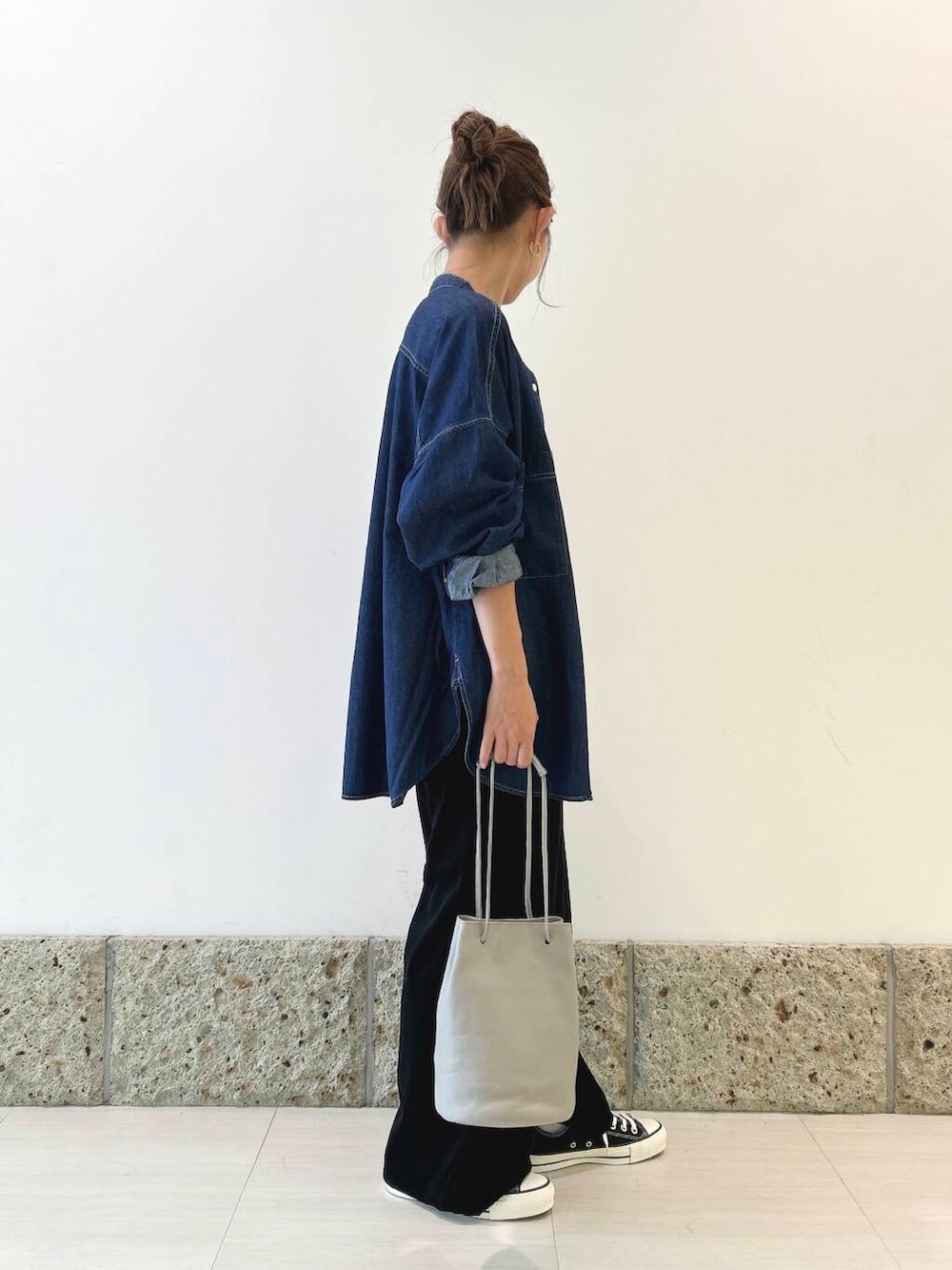 デニムシャツは、よく見ると首元に小ぶりのフリンジが