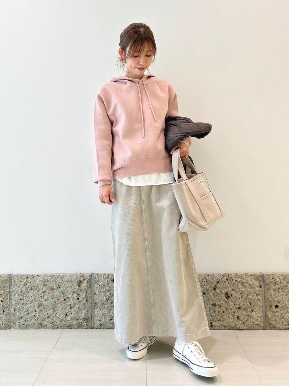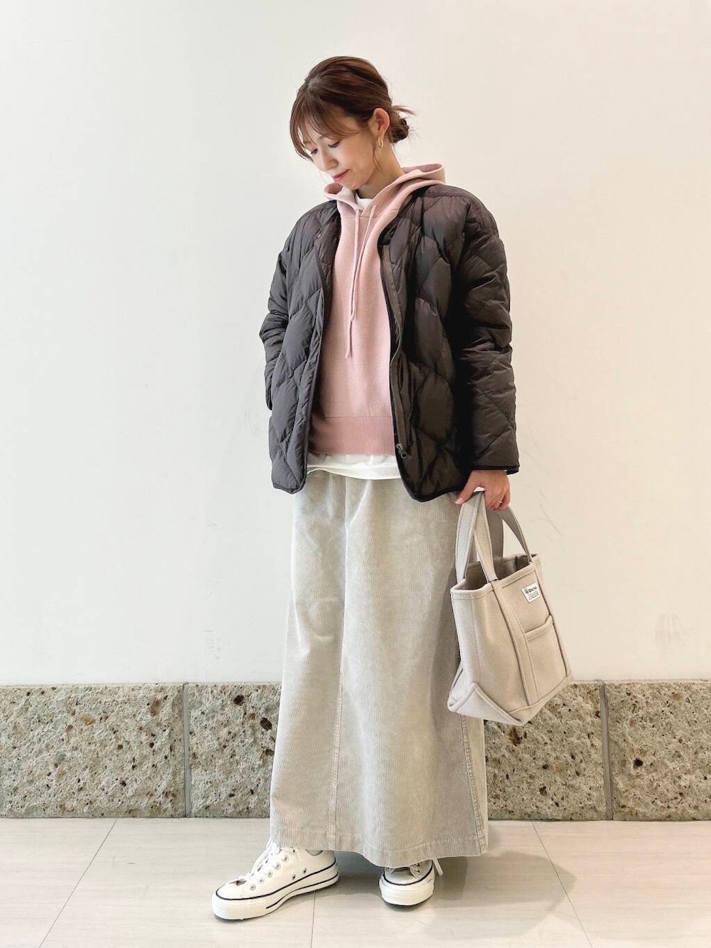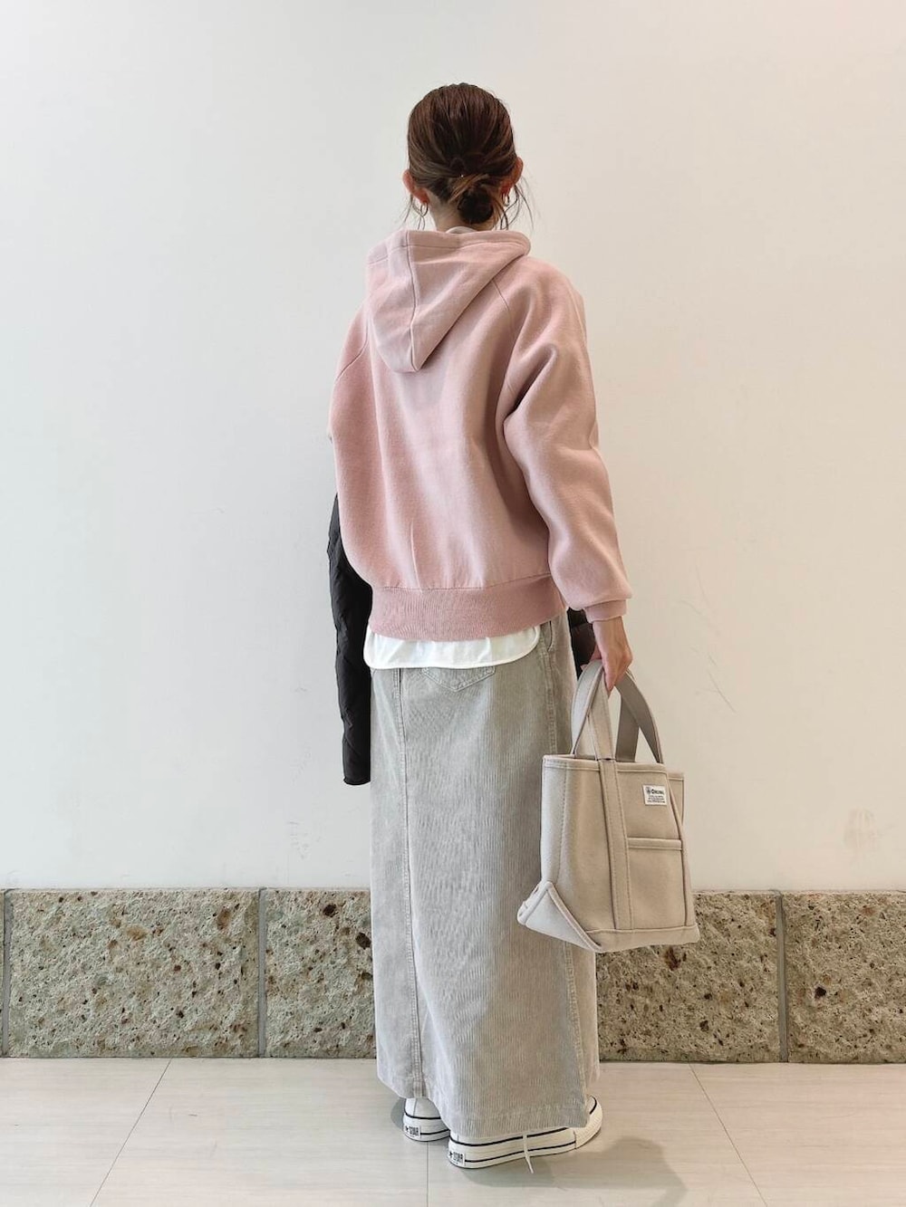 スカートは製品染め独特の風合い、コーデュロイの立体感、